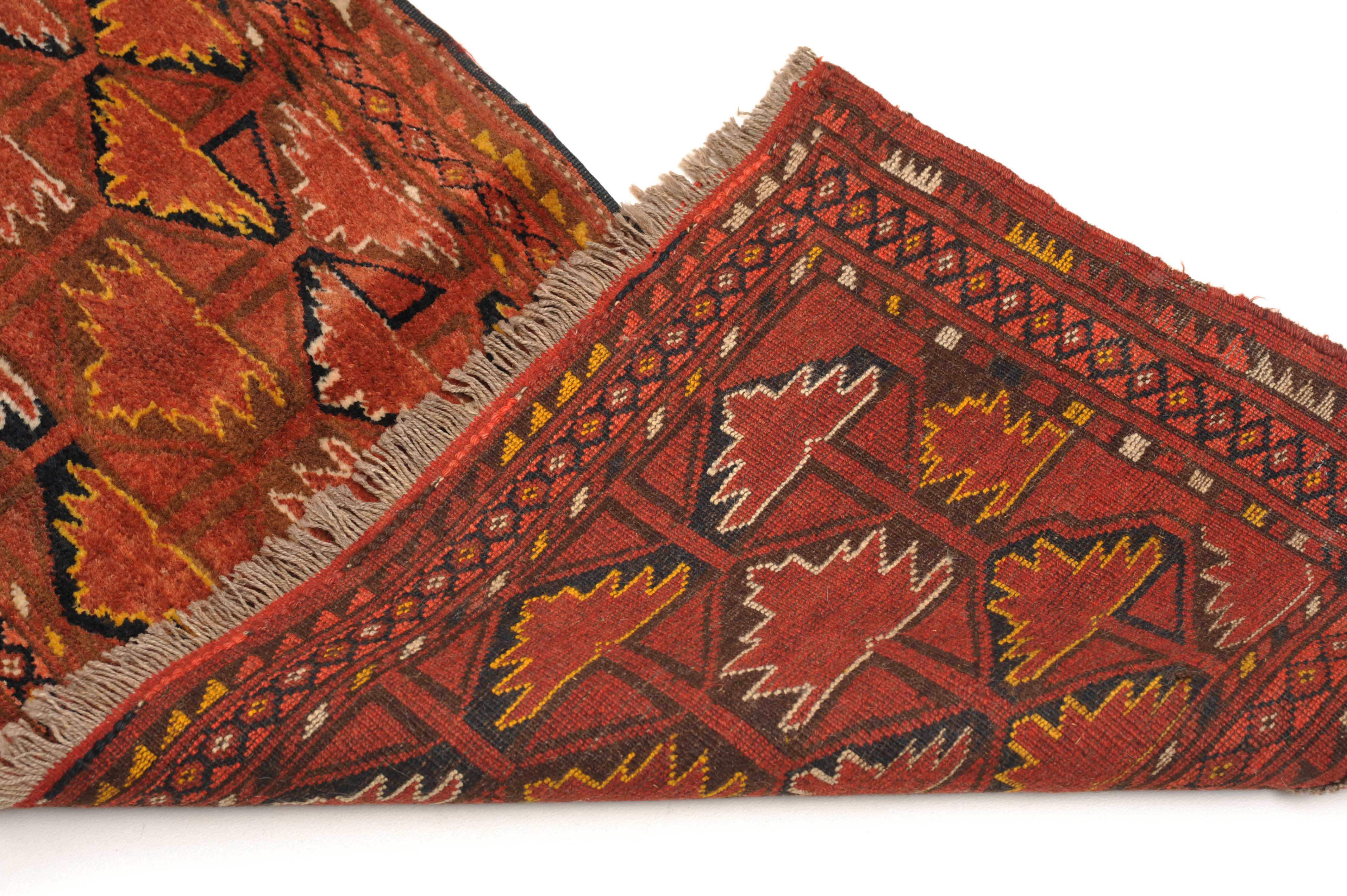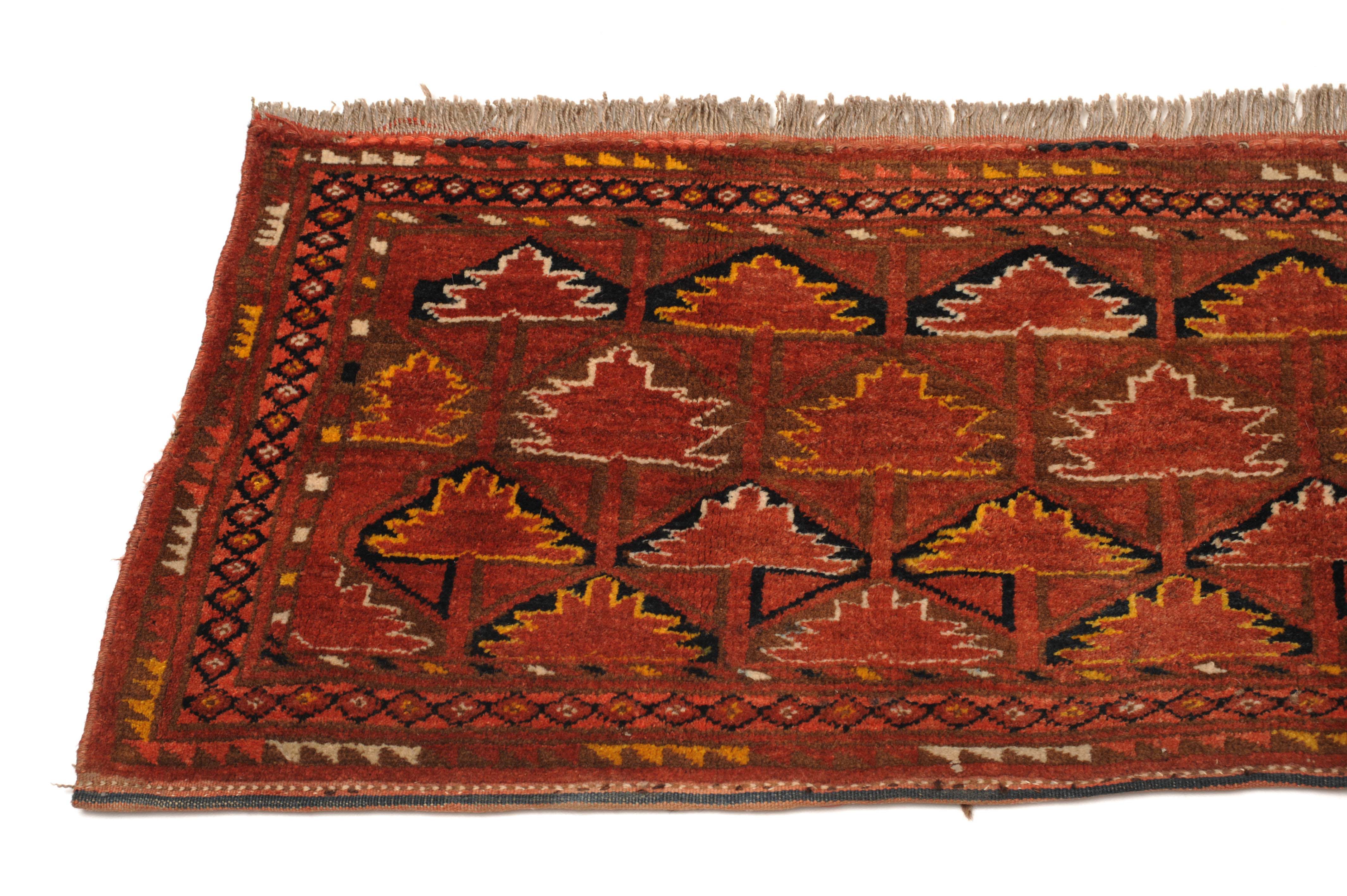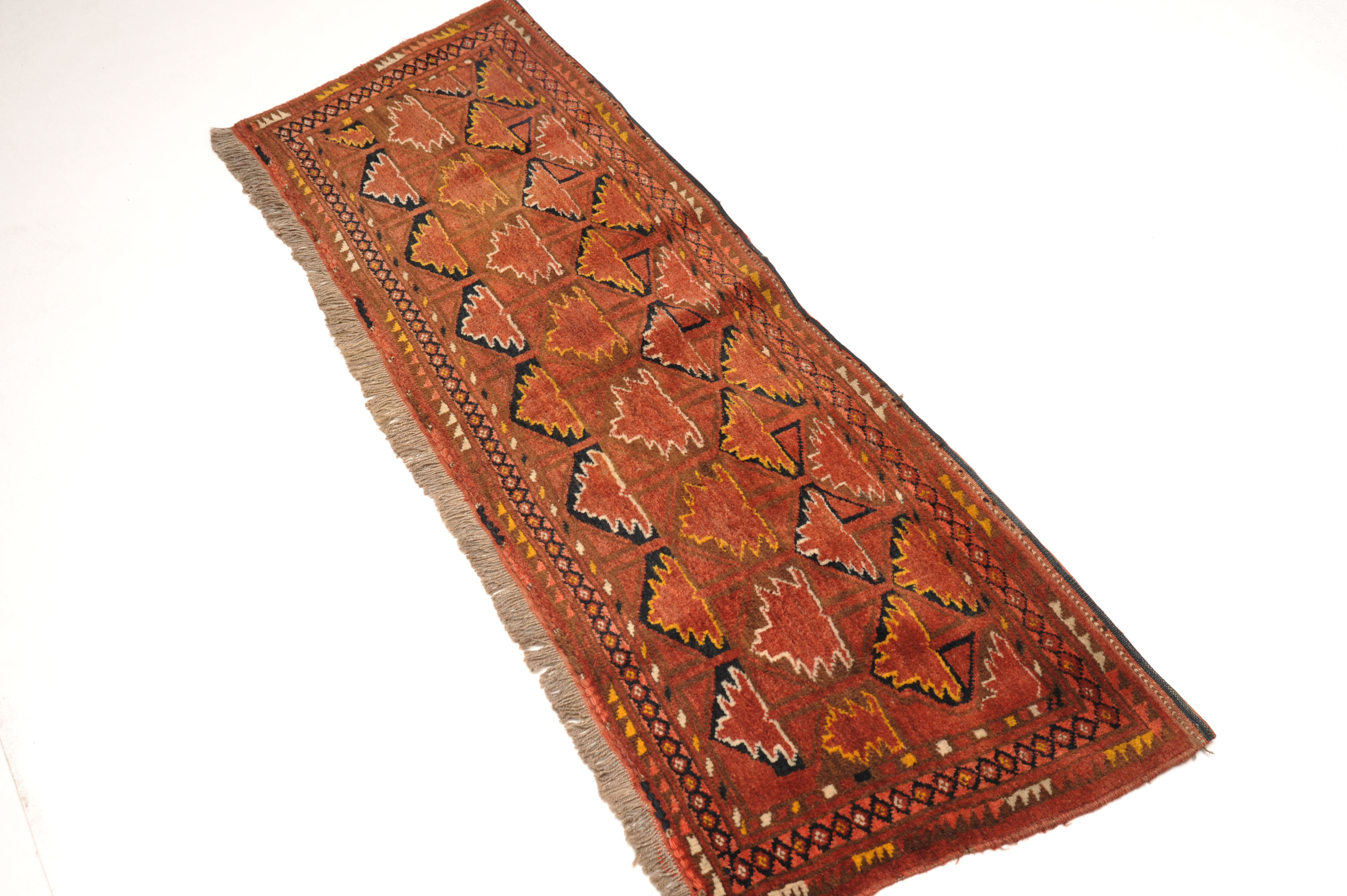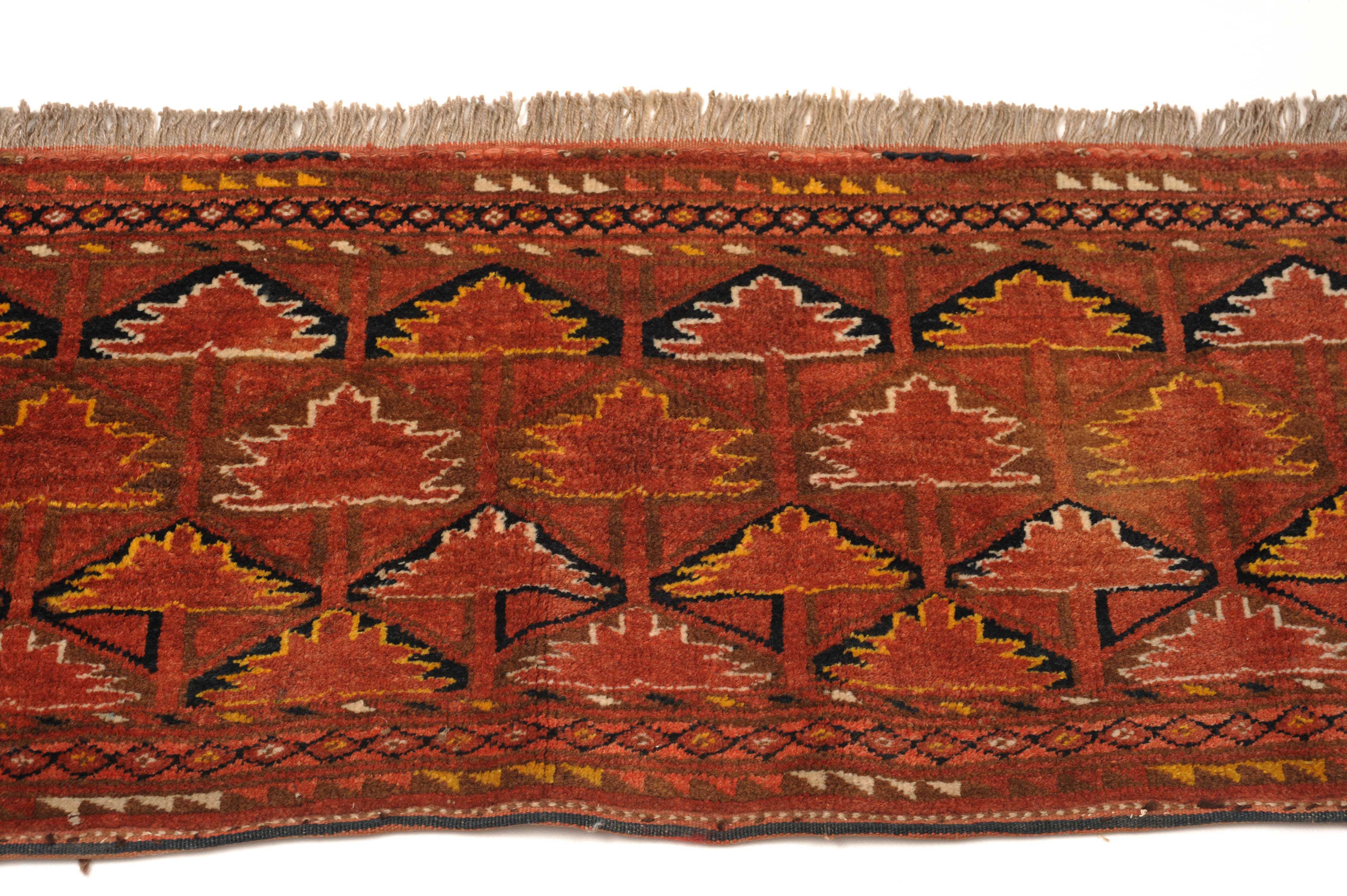 Afghanistan, um 1910. Im braunen Mittelfeld figurieren 4 horizontale blütenverzierte Reihen, die von einer schmalen Rauten-Borte flankiert werden. Gute Erhaltung. 45x145 cm (ft. 1.5x4.8).