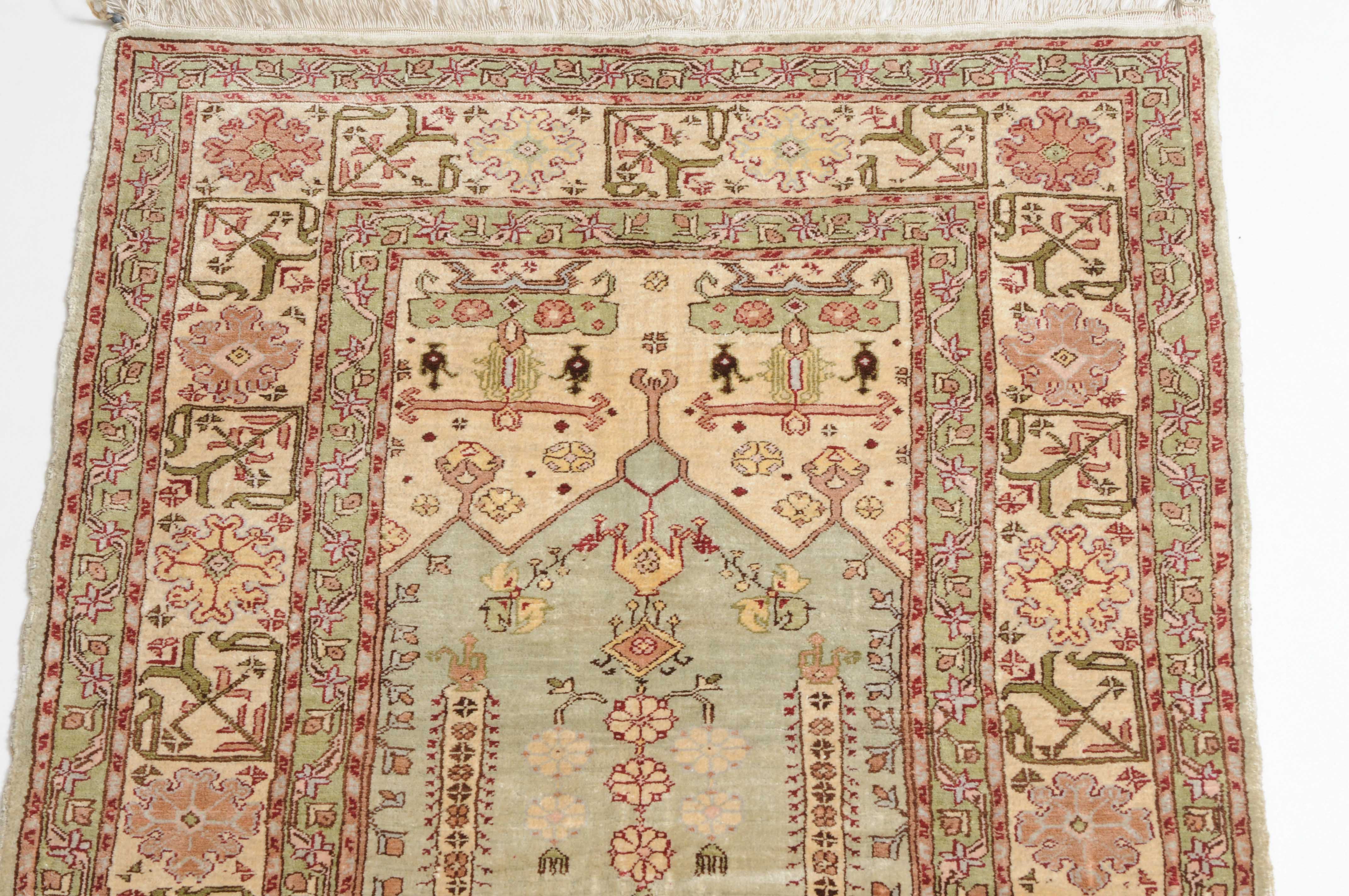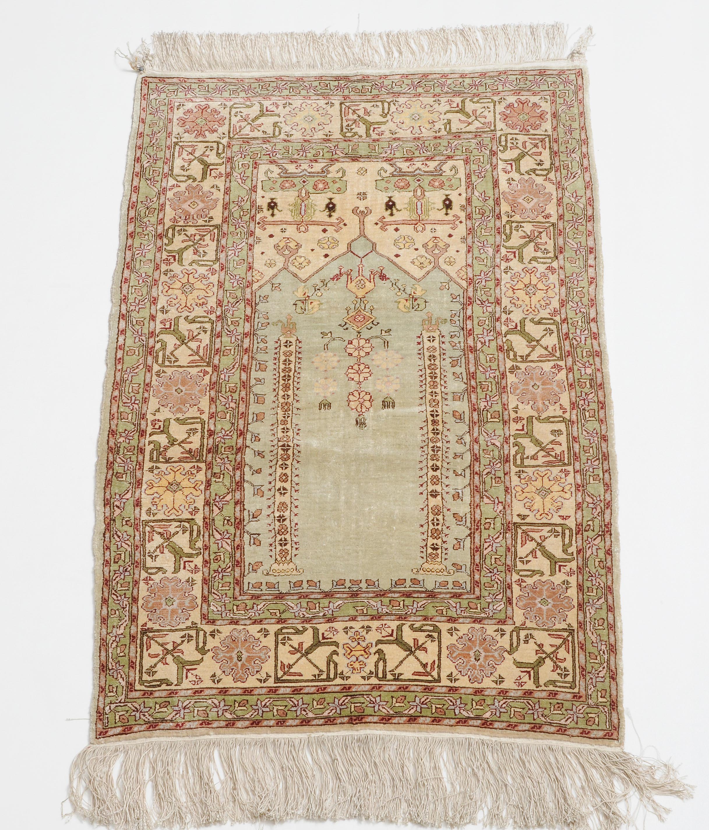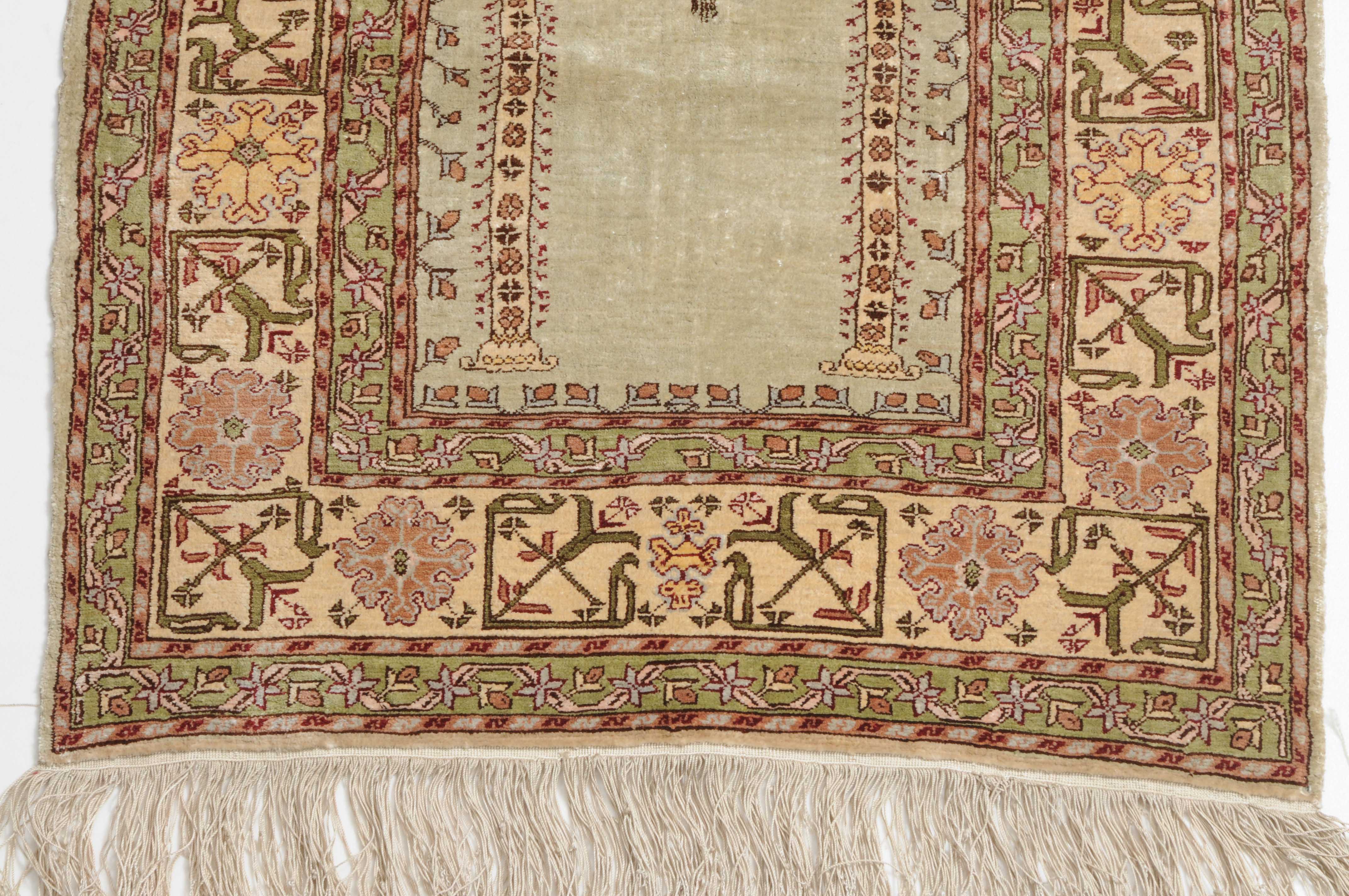 Z-Türkei, um 1980. Unter einem mit Blattranken verzierten Giebel bilden 2 Säulen auf hellblauem Grund eine Gebetsnische (Mihrab). 2 dekorative Nebenbordüren säumen die filigrane weisse breite Hauptbordüre, die mit eindrucksvollen grossen Blüten geschmückt ist. Sehr gute Erhaltung. 60x92 cm (ft. 2x3).