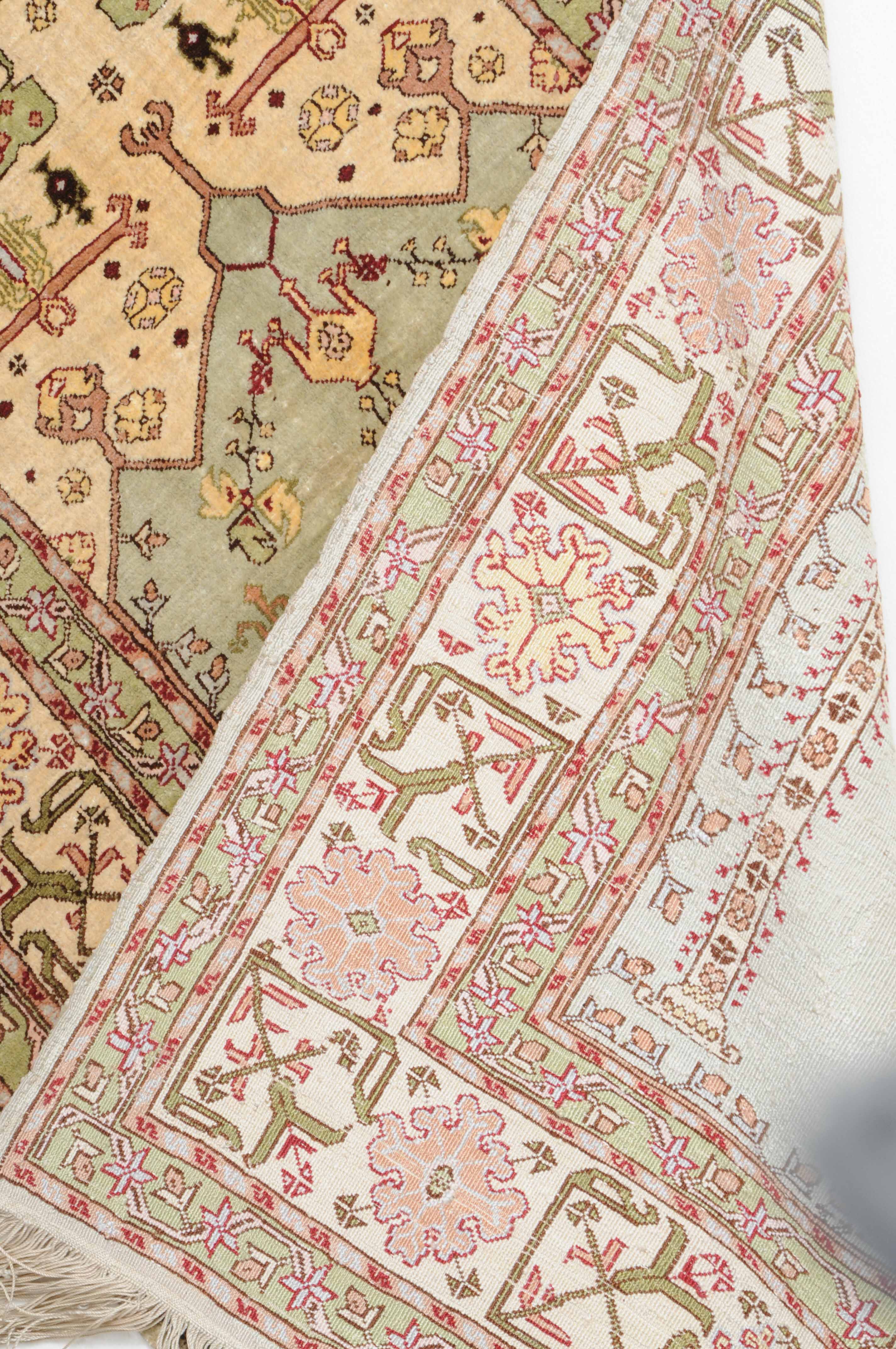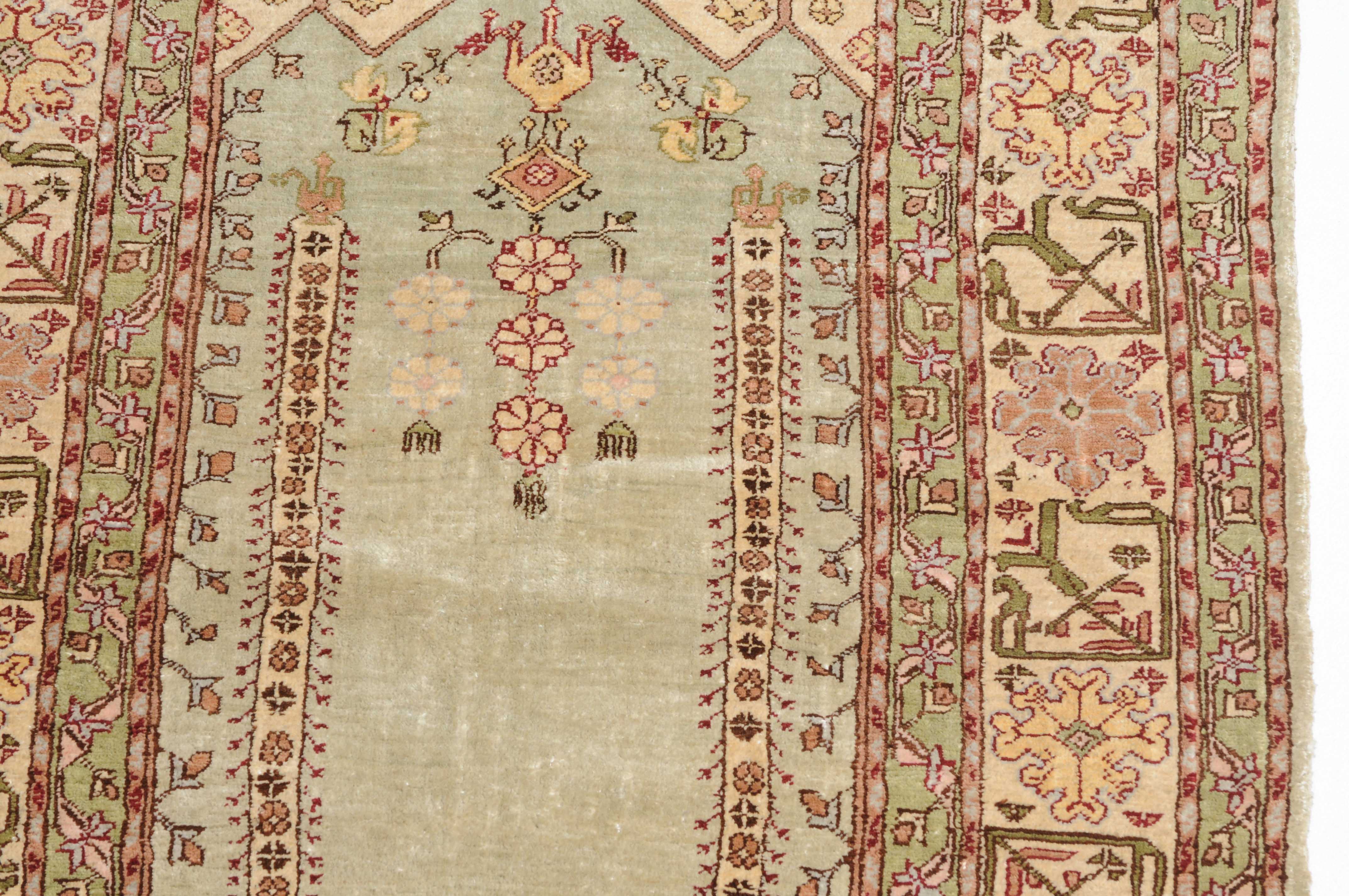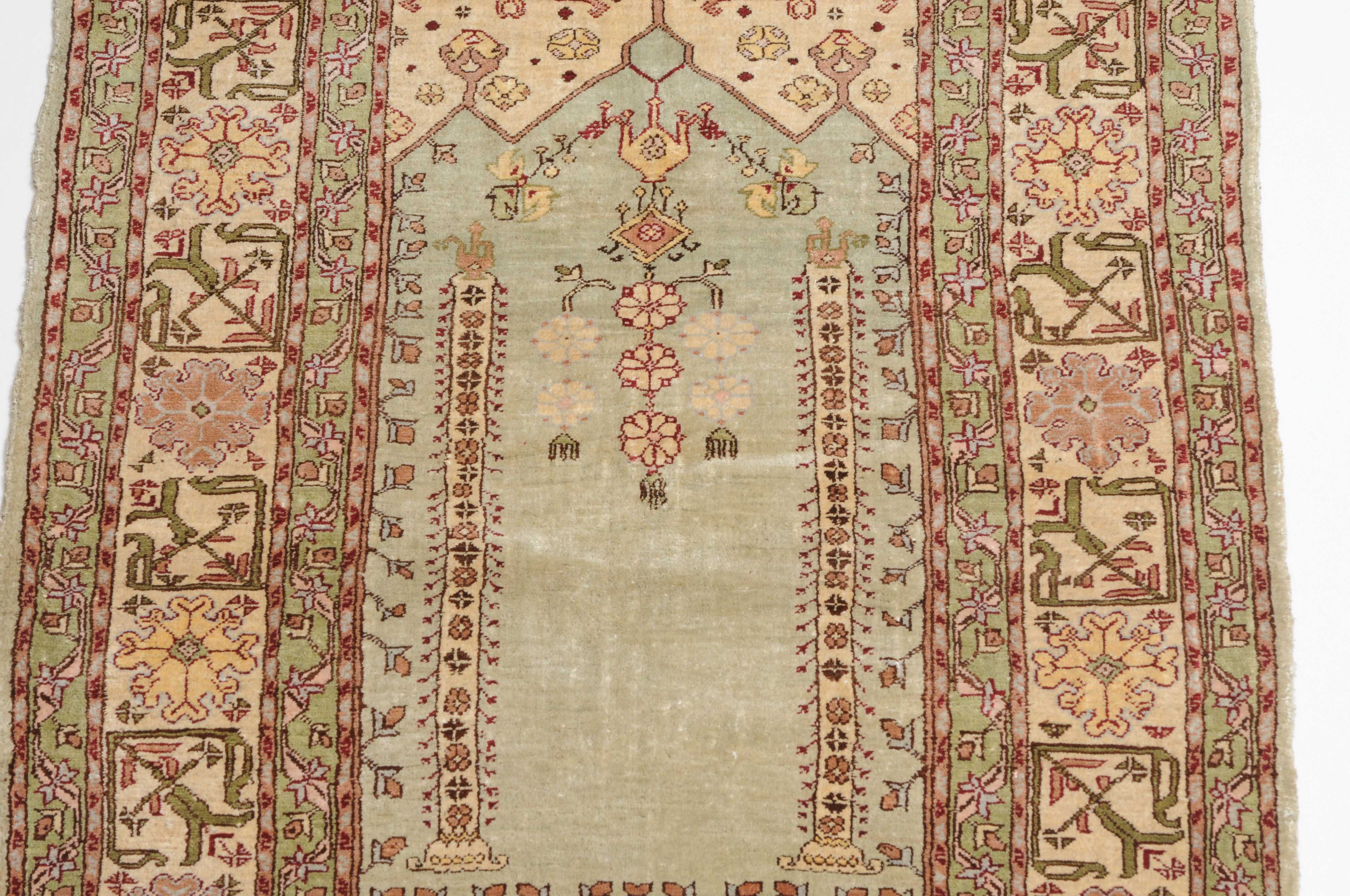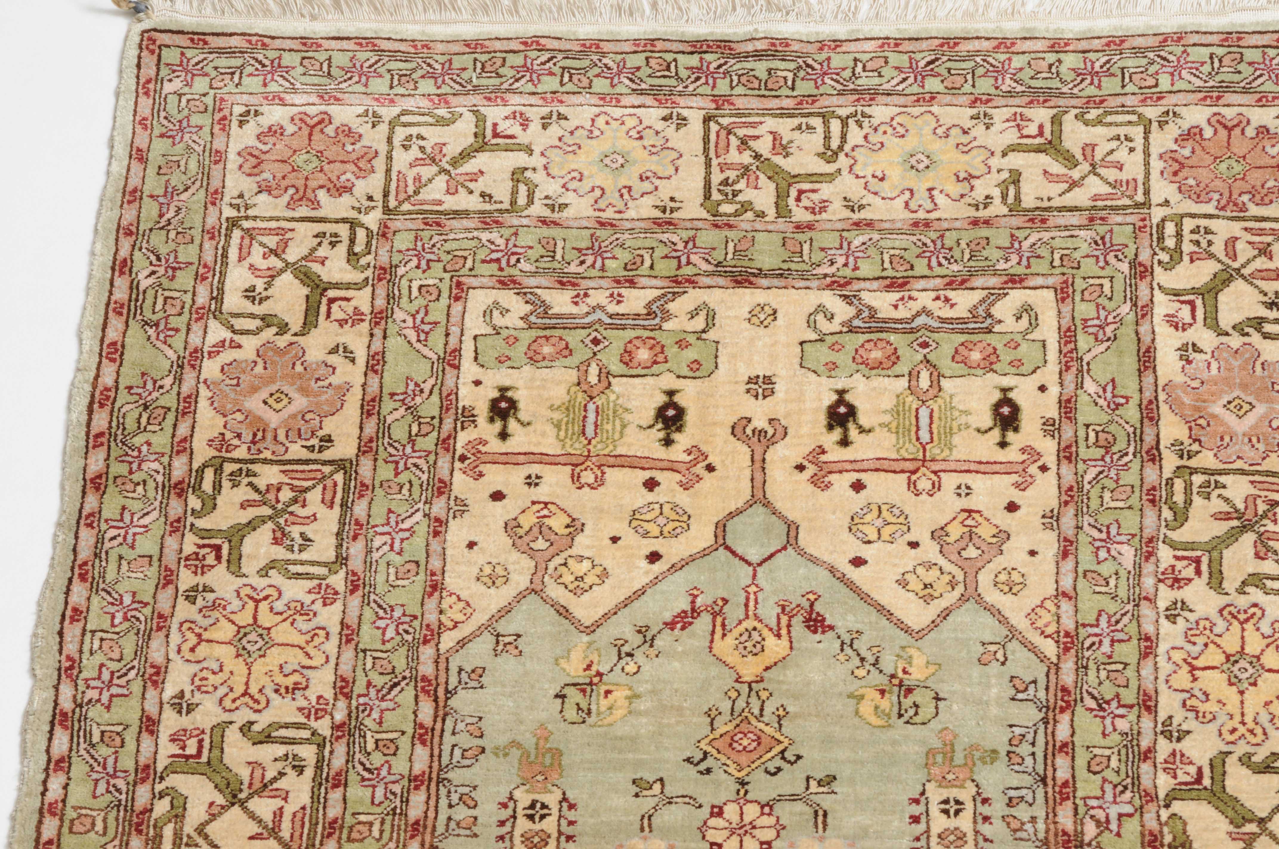 Z-Türkei, um 1980. Unter einem mit Blattranken verzierten Giebel bilden 2 Säulen auf hellblauem Grund eine Gebetsnische (Mihrab). 2 dekorative Nebenbordüren säumen die filigrane weisse breite Hauptbordüre, die mit eindrucksvollen grossen Blüten geschmückt ist. Sehr gute Erhaltung. 60x92 cm (ft. 2x3).