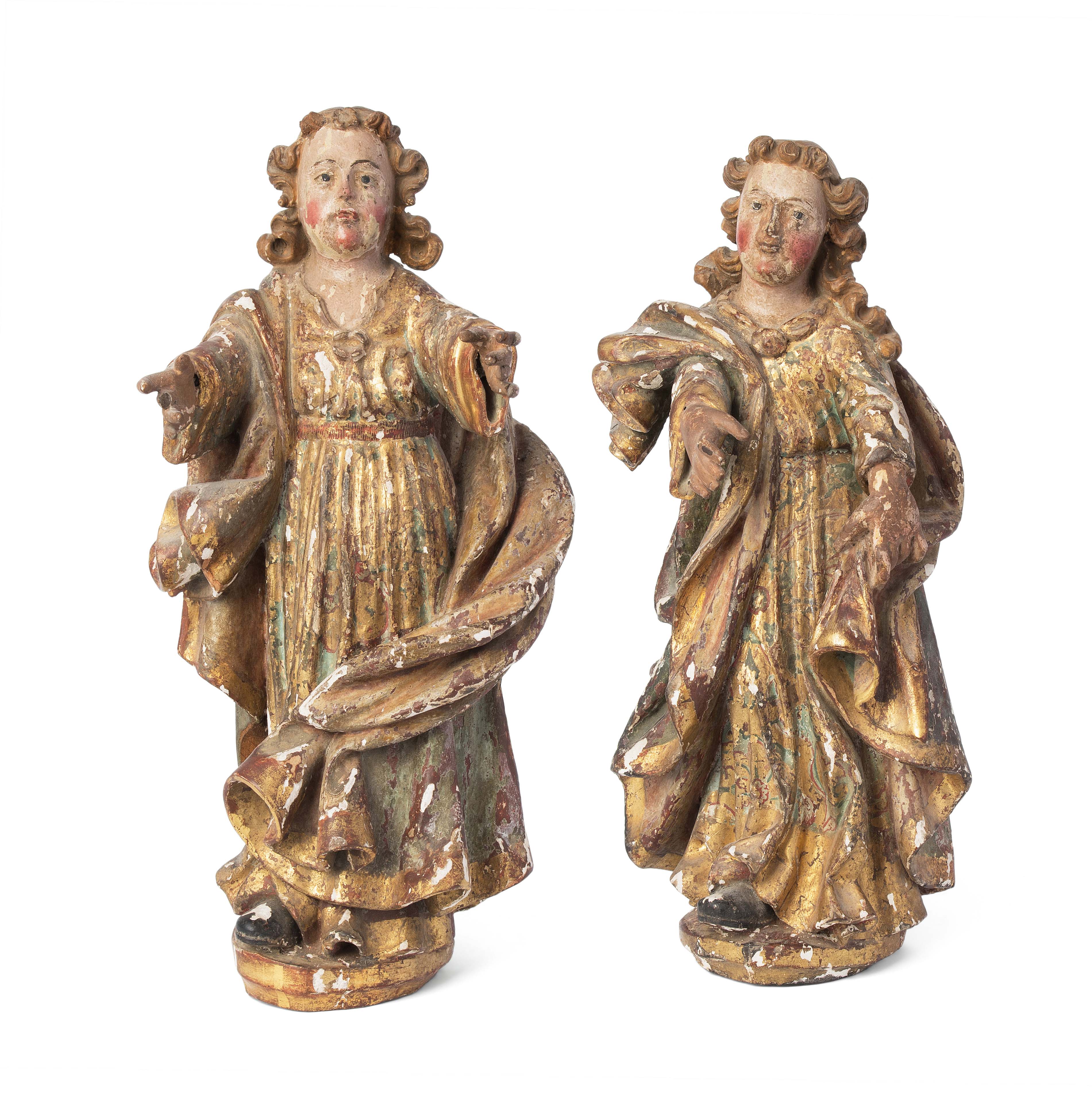 Spanien, Barock. Holz geschnitzt und polychrom gefasst, tlw. vergoldet. Auf ovalen Sockeln stehende Engel in faltenreichen, floral ornamentierten Gewändern. Rückseitig abgeflacht. H 37 bzw. 37,5 cm.