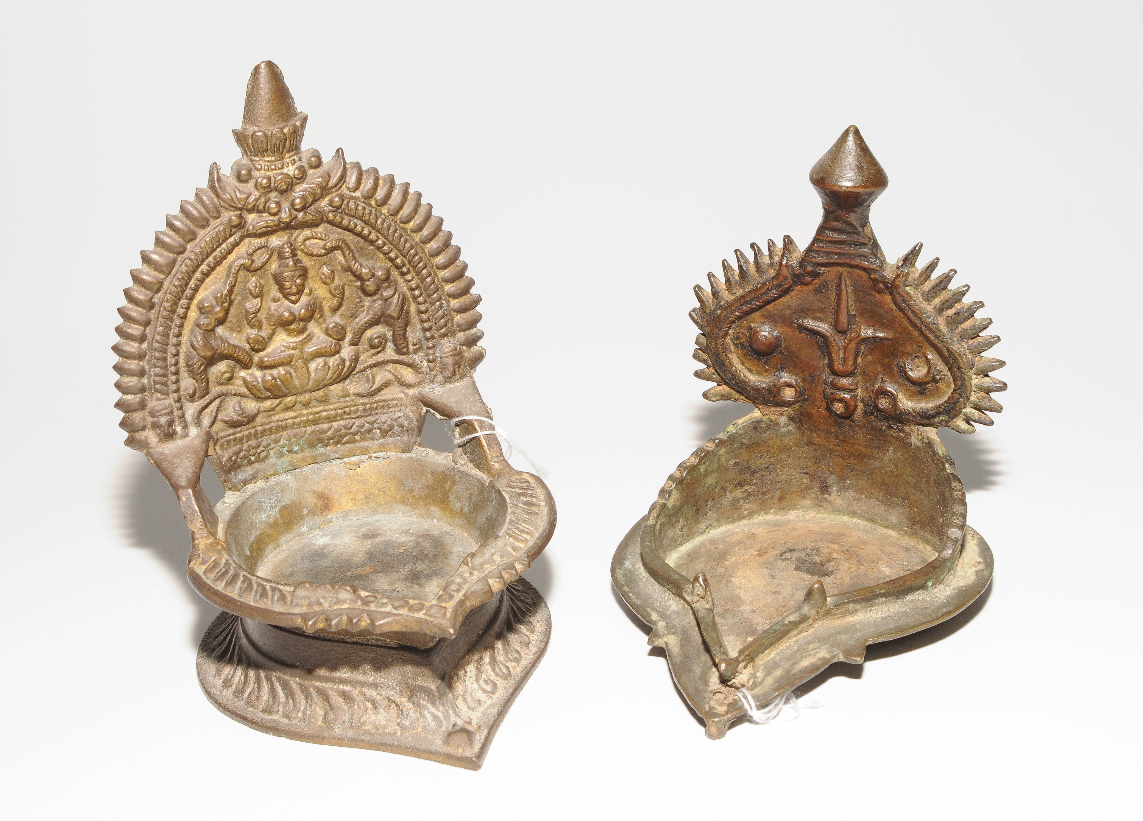 Indien. Gelbguss. Spitzzulaufende Öllampen mit Rückwand als Flammenkranz. Eine im Zentrum mit reliefierter Darstellung der Göttin Lakshmi, die andere mit Symbolen. Schadstellen. H 12 bzw. 10 cm.