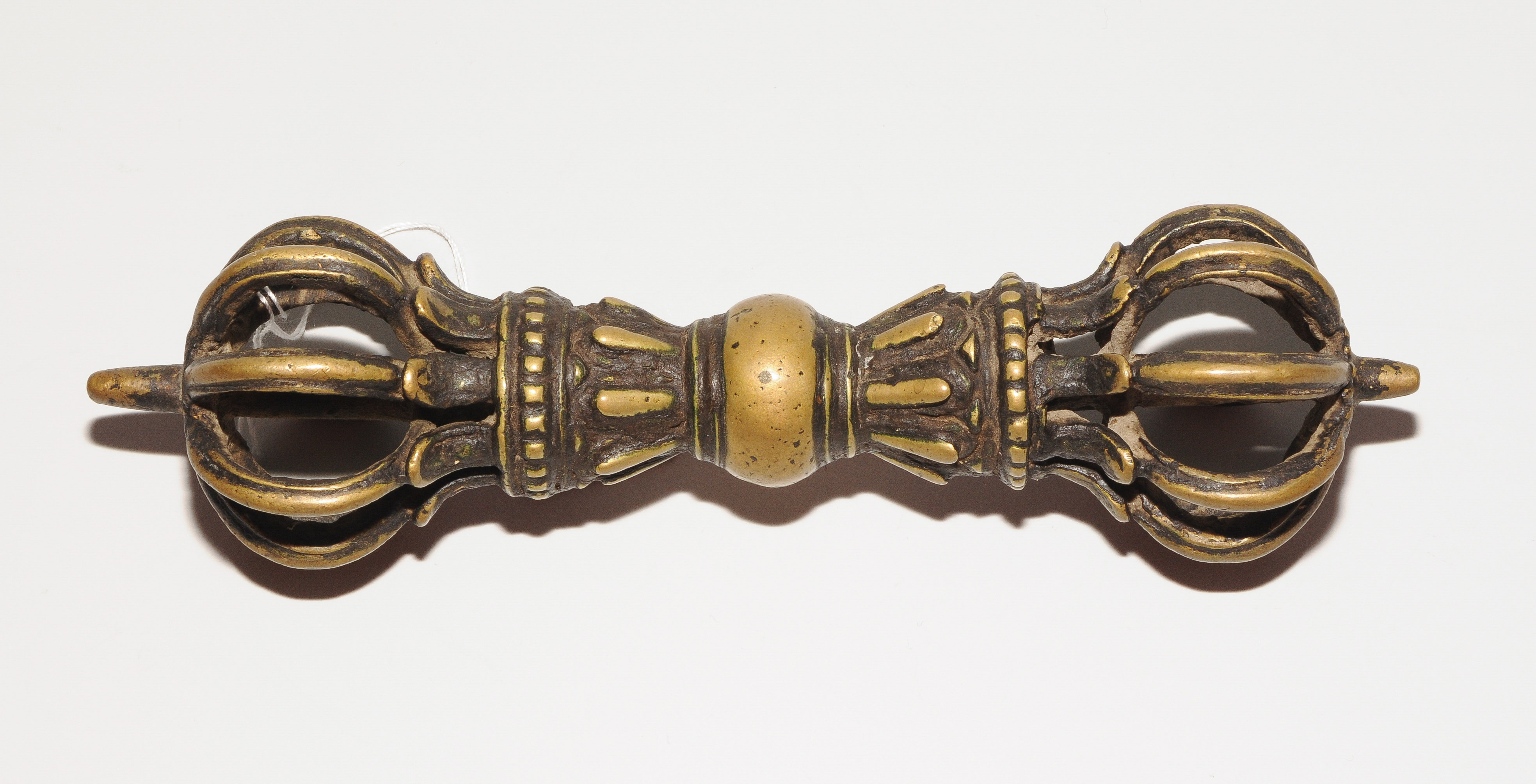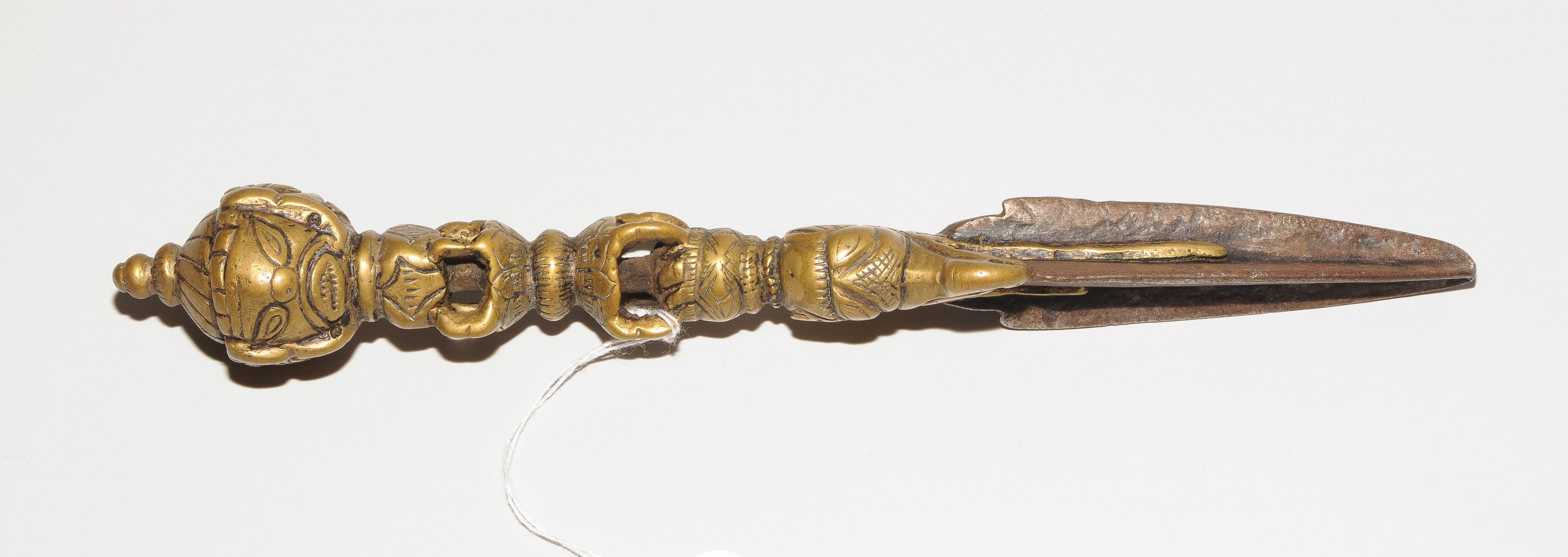 Tibet. Bronze. Griffstück als vierstrahliger Vajra, bekrönt von den 3 Köpfen des Dharmapala Hayagruva. Unten entspringt die dreikantige Klinge aus einem Makara-Maul. / Achtstrahliger Vajra. Altersspuren und tlw. oxidiert. L 22,5 bzw. 19 cm.