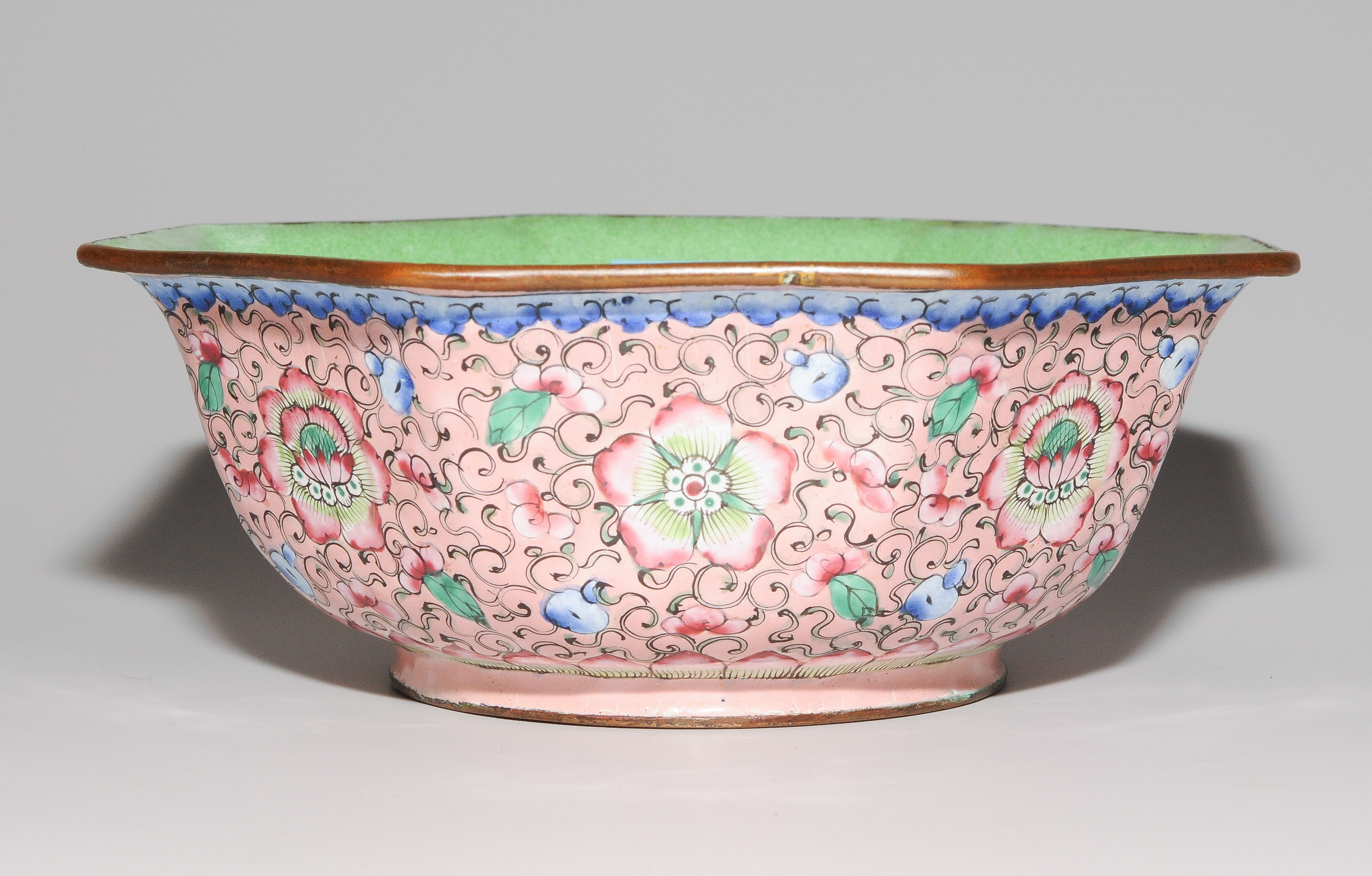 China, um 1900. Kanton email. Achteckig, mit polychromen floralem Dekor. Innen auf grünem, aussen auf rosa Fond. Schadstellen. H 5,3, D 13,5 cm.
