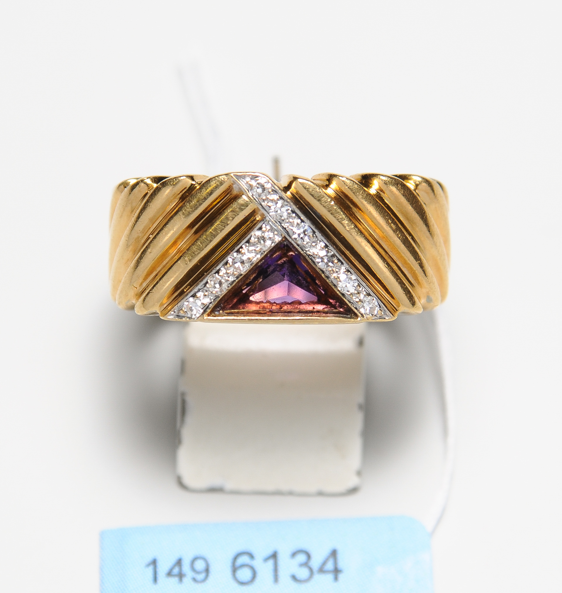 750 Gelbgold tlw. rhodiniert. 1 Amethyst-Triangel 9x5 mm, 10 Achtkant-Diamanten zus. ca. 0.05 ct. Gr. ca. 54, 10,1 g.