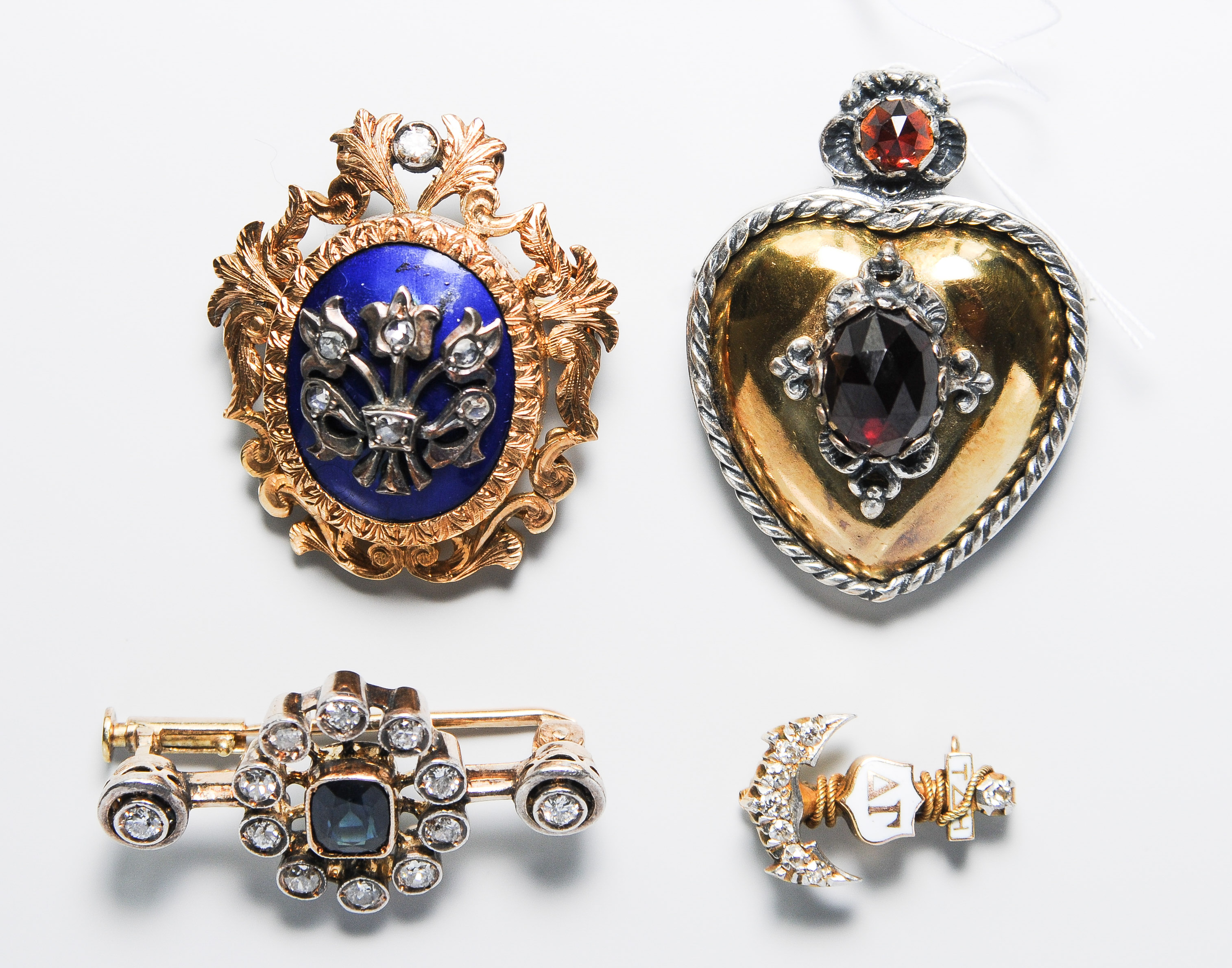 19/20.Jh. 585-750 Gold, Silber tlw. vergoldet. Saphir, Diamanten, Granat, Email. 37,7 g.
