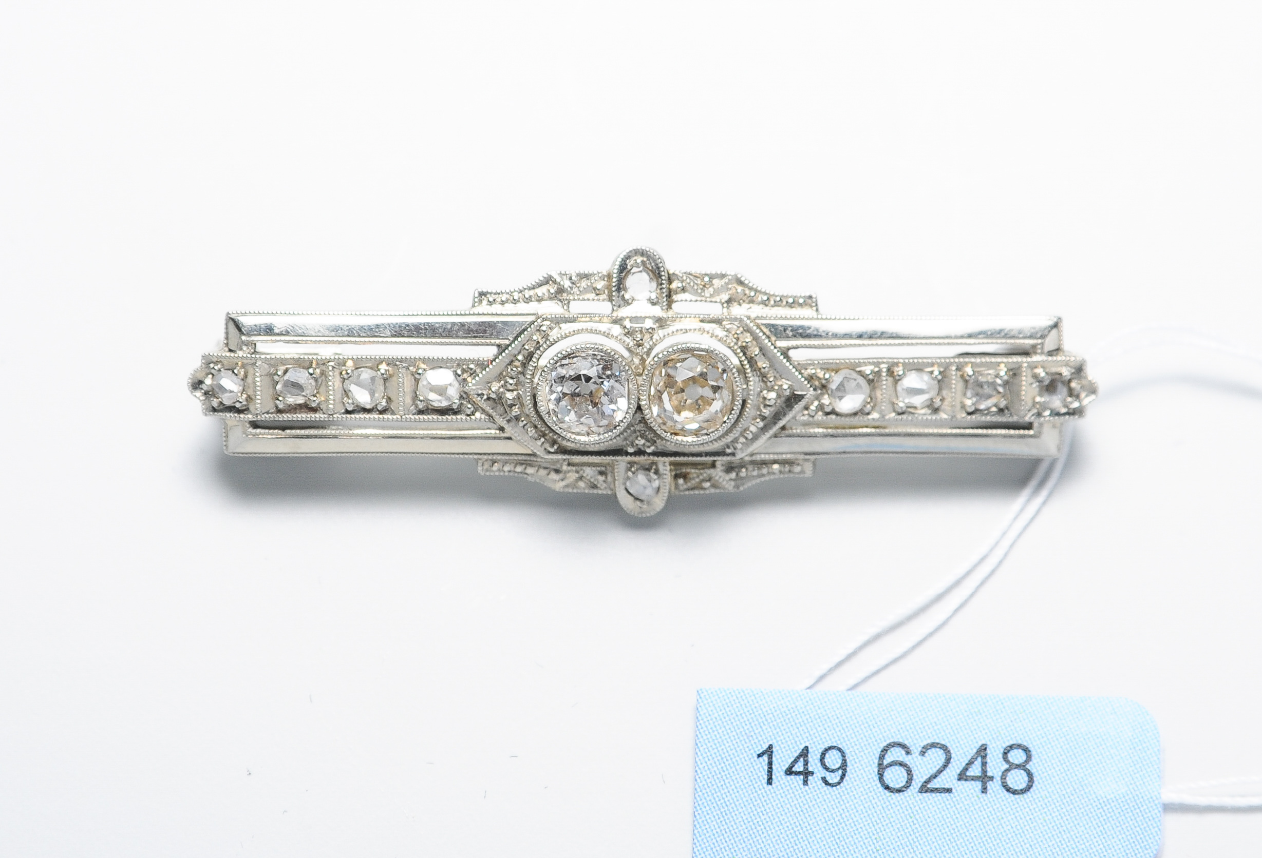 Art Déco. 750 Weissgold. 2 Altschliff-Diamanten zus. ca. 0.50 ct. L 4,2 cm, 5,6 g.