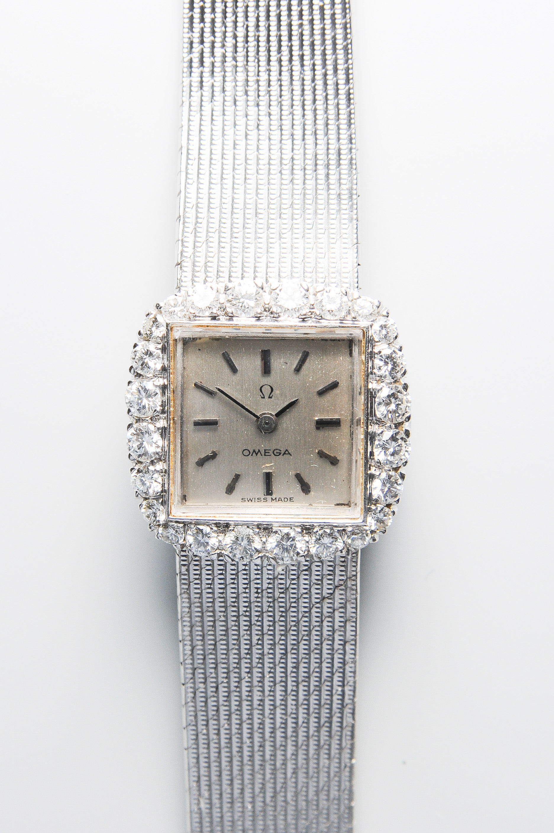 1970er Jahre. 750 Weissgold. Handaufzug Omega Cal. 650. Werk Nr. 21974569. Boden Nr. 8082 835037. 18x18 mm. Versilbertes Zifferblatt und applizierte Strichindizes, 24 Brillanten ca. 0.60 ct. L 18 cm, 50 g. Nicht funktionstüchtig.