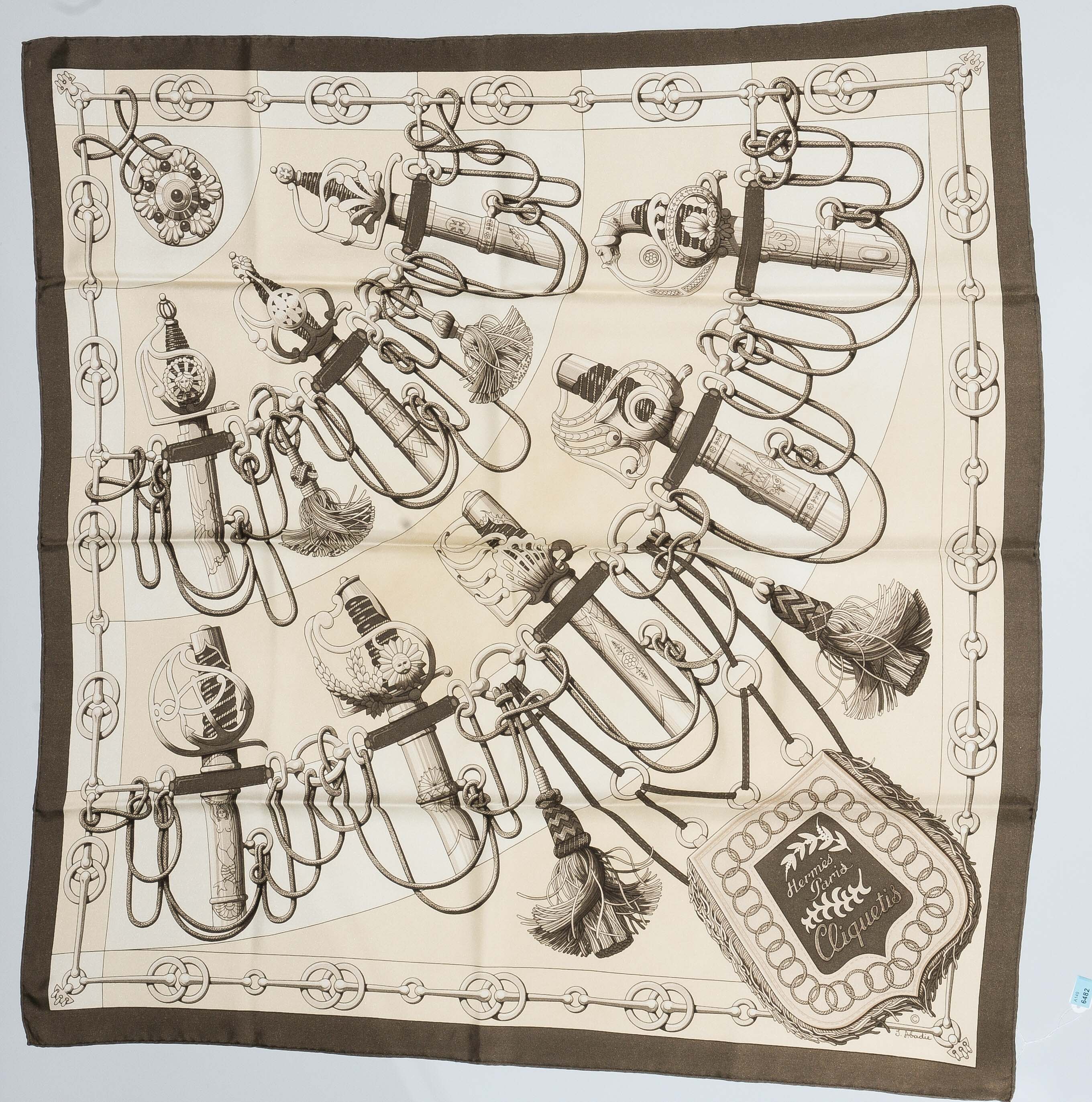Seide. In Taupe und Crème. 86x86 cm. Fleckig, reinigungsbedürftig.