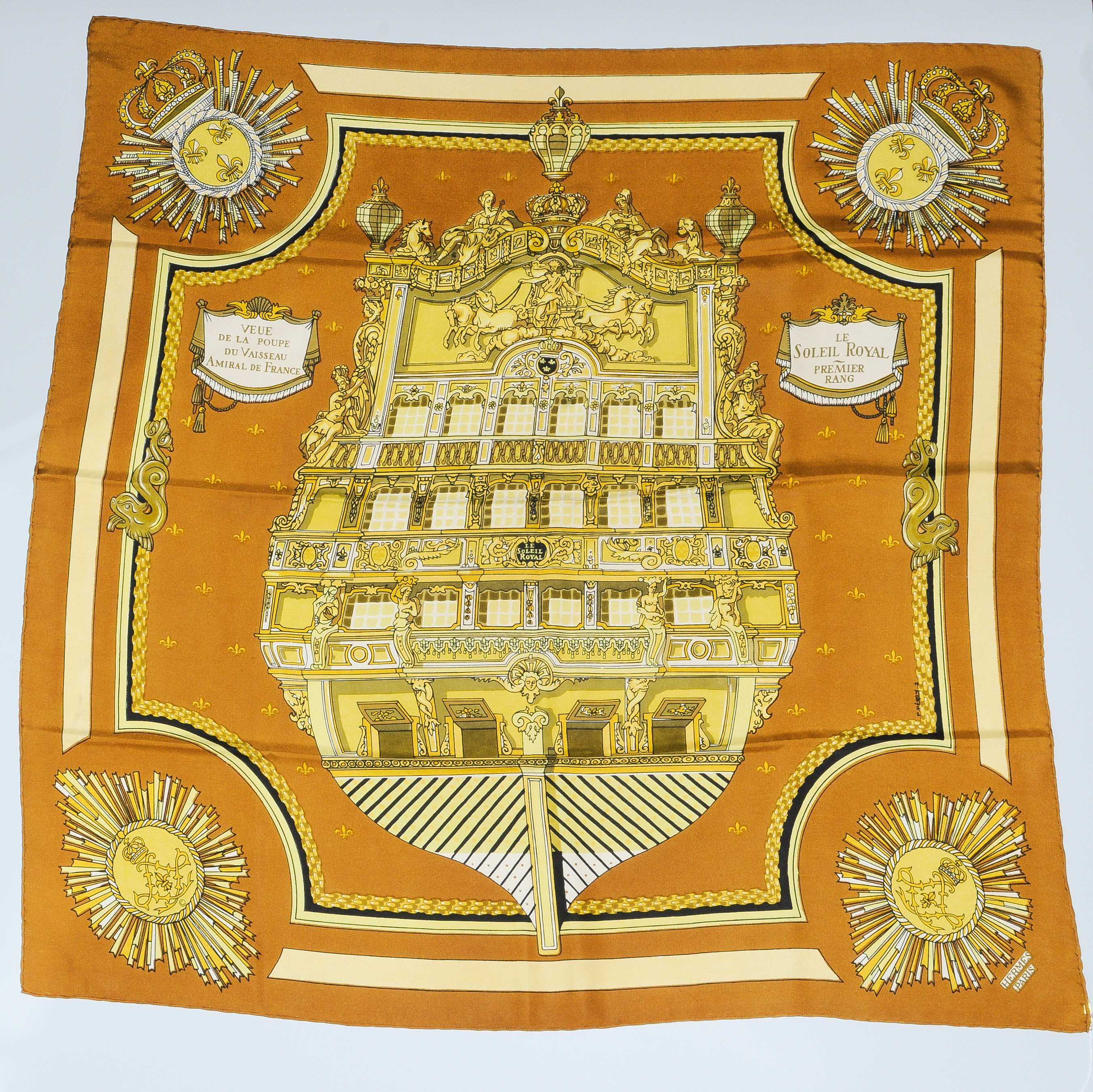 Seide. In Camelfarbe. 88x88 cm. Gezogener Faden, fleckig, reinigungsbedürftig.