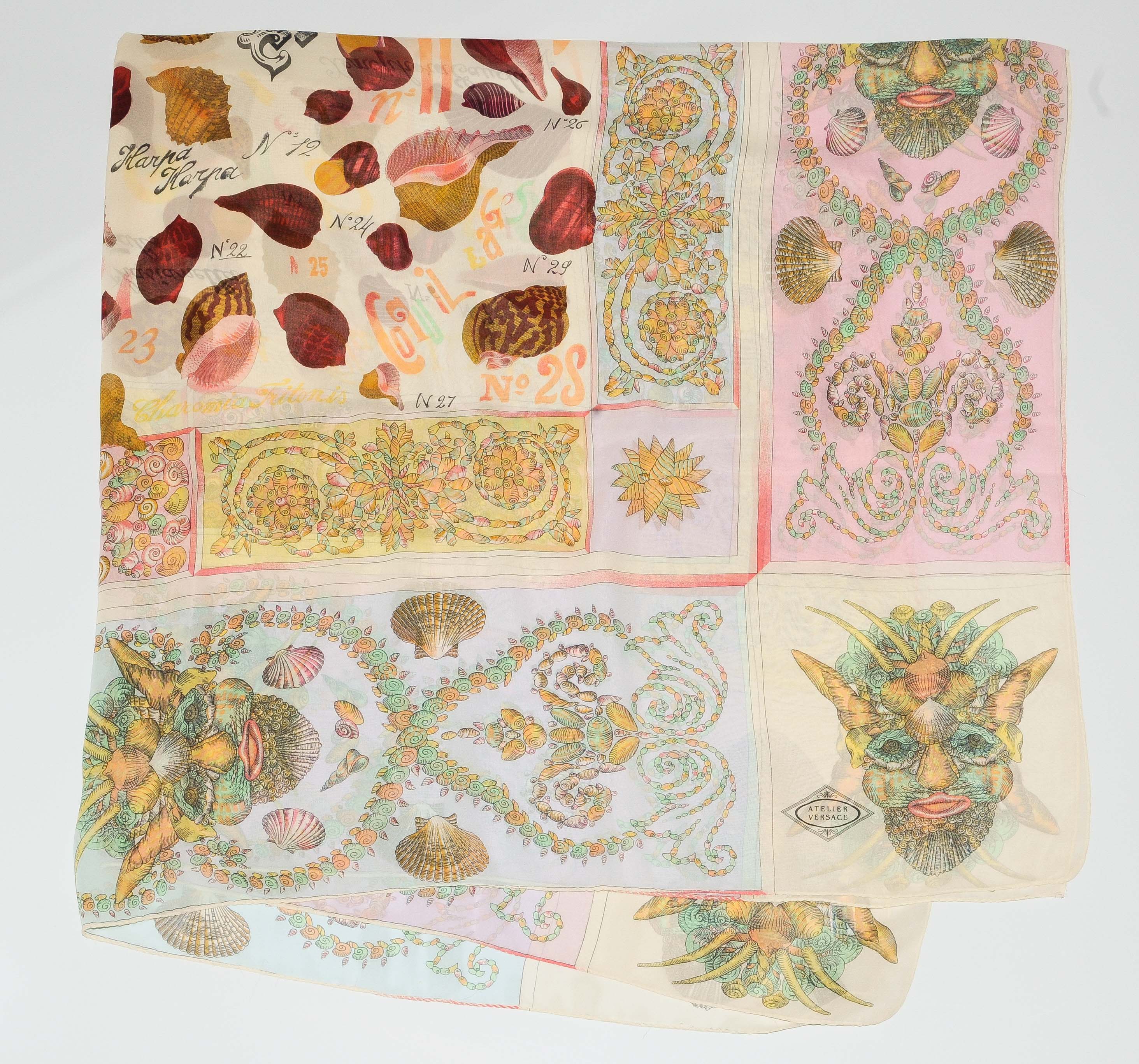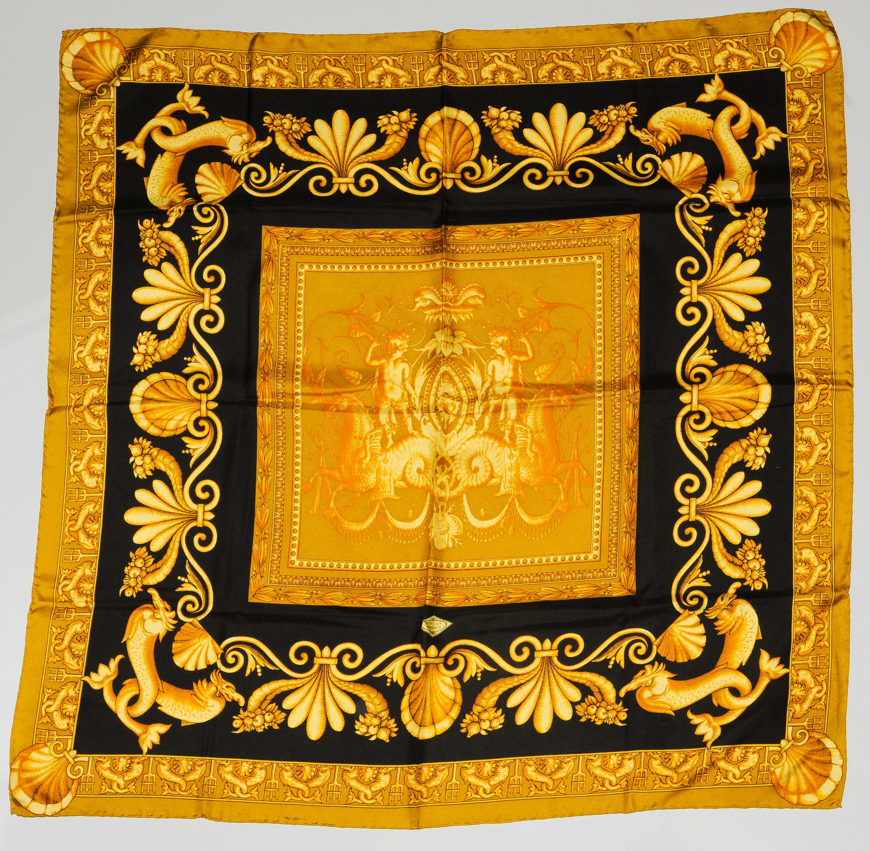 Ein grosses Foulard aus Seidenkrepp. In Beige. Ca. 135x135 cm. Kleinste Flecken, sonst guter Zustand. Ein kleines Foulard aus Seide. In Schwarz und Goldfarbe. 87x87 cm. Etwas fleckig.
