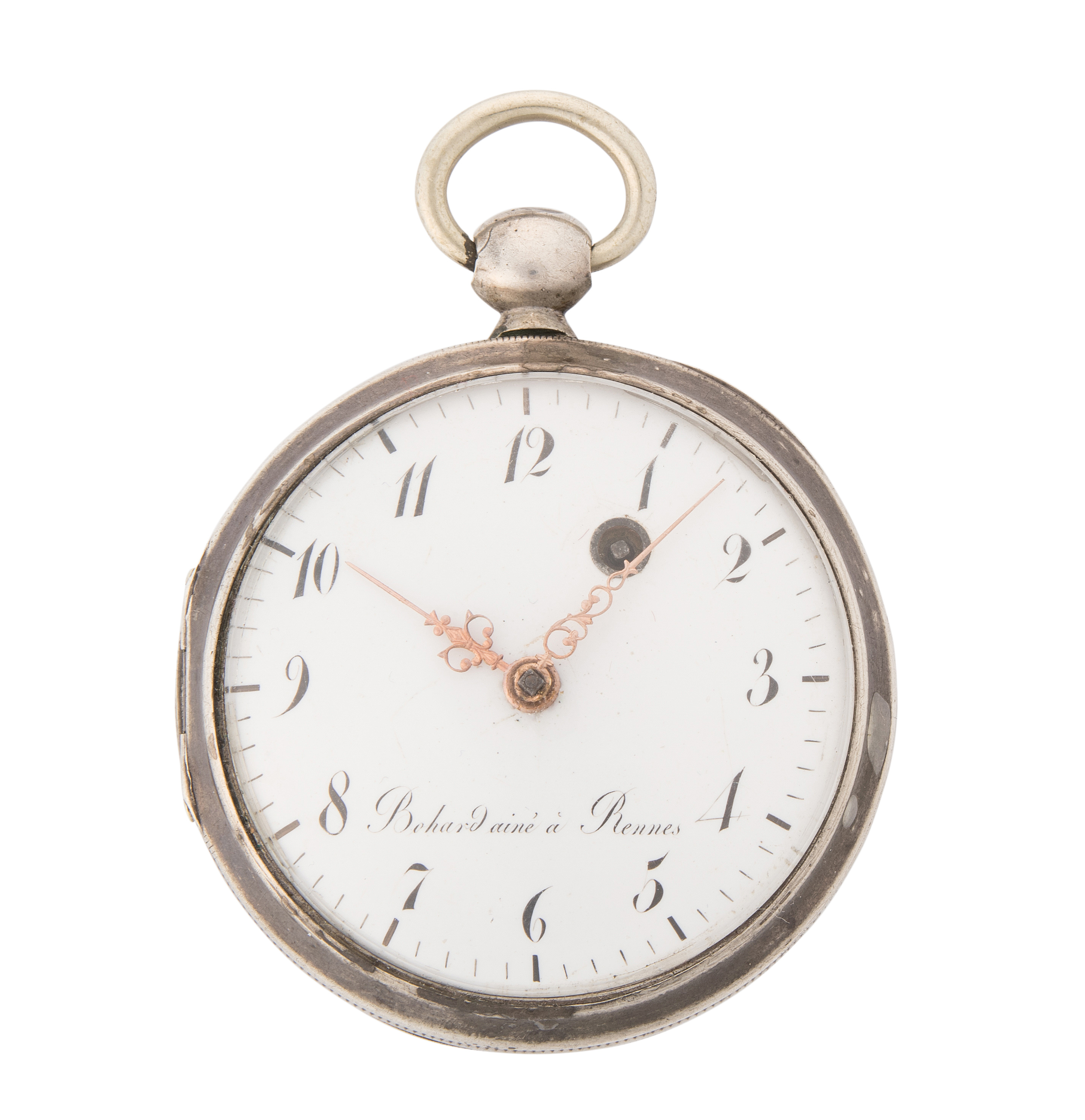 Runde, mechanische Spindeltaschenuhr 18.Jh. mit Schlüsselaufzug in Silbergehäuse. Fein gearbeitetes Messing-Uhrwerk, signiert "Bohard ainé à Rennes", Kette, Schnecke, und grosse Unruhe unter durchbrochenem, verzierten Coq, D 51 mm. Weisses Emailzifferblatt mit schwarzen, arabischen Stundenzahlen, Minutenindizes. Goldfarbene Louis XV-Zeiger. Loch für Schlüsselaufzug bei 1 Uhr. Frontglas lose, muss eingepasst werden. Rückendeckel mit Ornamenten verziert. Gebrauchsspuren.