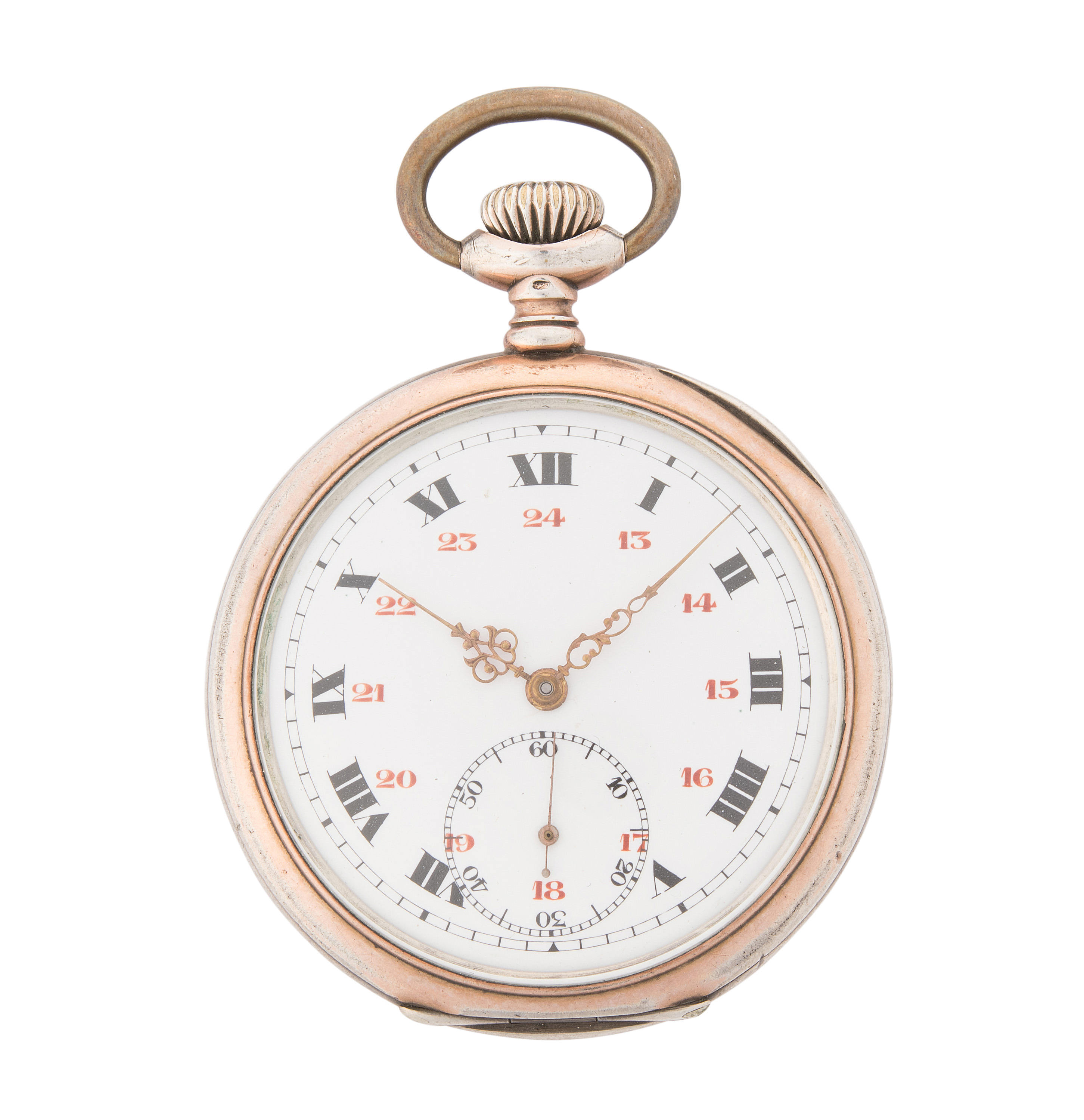 Runde, mechanische Herrentaschenuhr um 1915 in Bicolorgehäuse. Rückendeckel mit Jagdmotiv, Revuewerk, Referenznummer 1374766, D 52 mm. Weisses Emailzifferblatt mit schwarzen, römischen Stundenzahlen, roten, arabischen 24 Stundenzahlen, Minutenindizes. Goldfarbene Louis XV-Zeiger, kleine Sekundenanzeige bei 6 Uhr. Krone und Bügel bei 12 Uhr. Gebrauchsspuren.