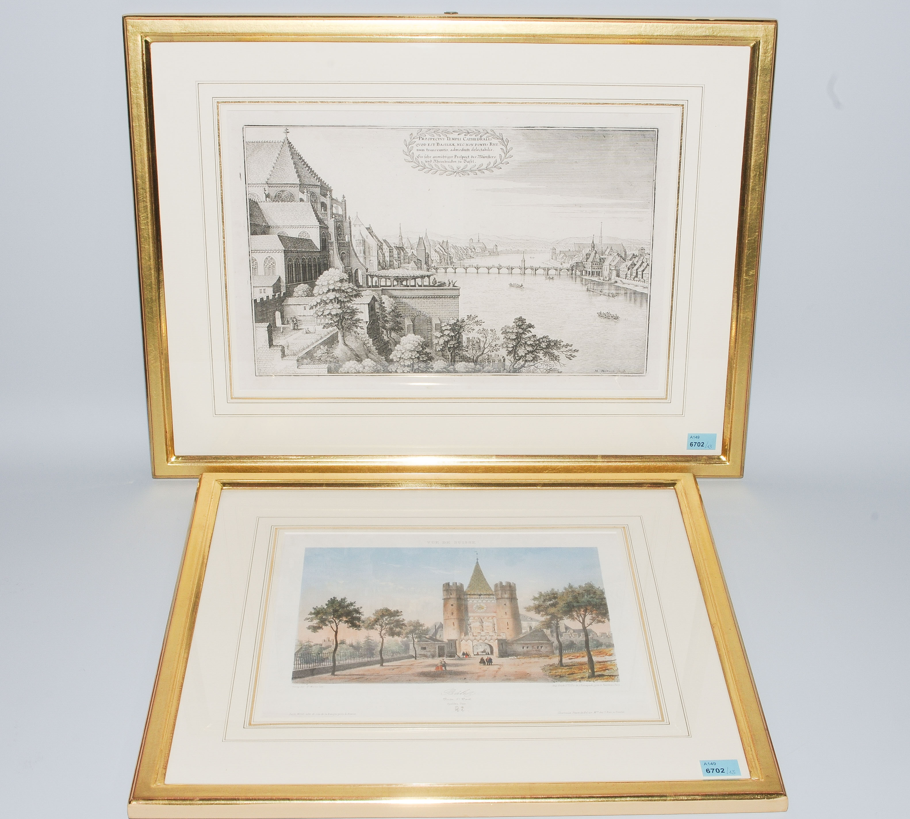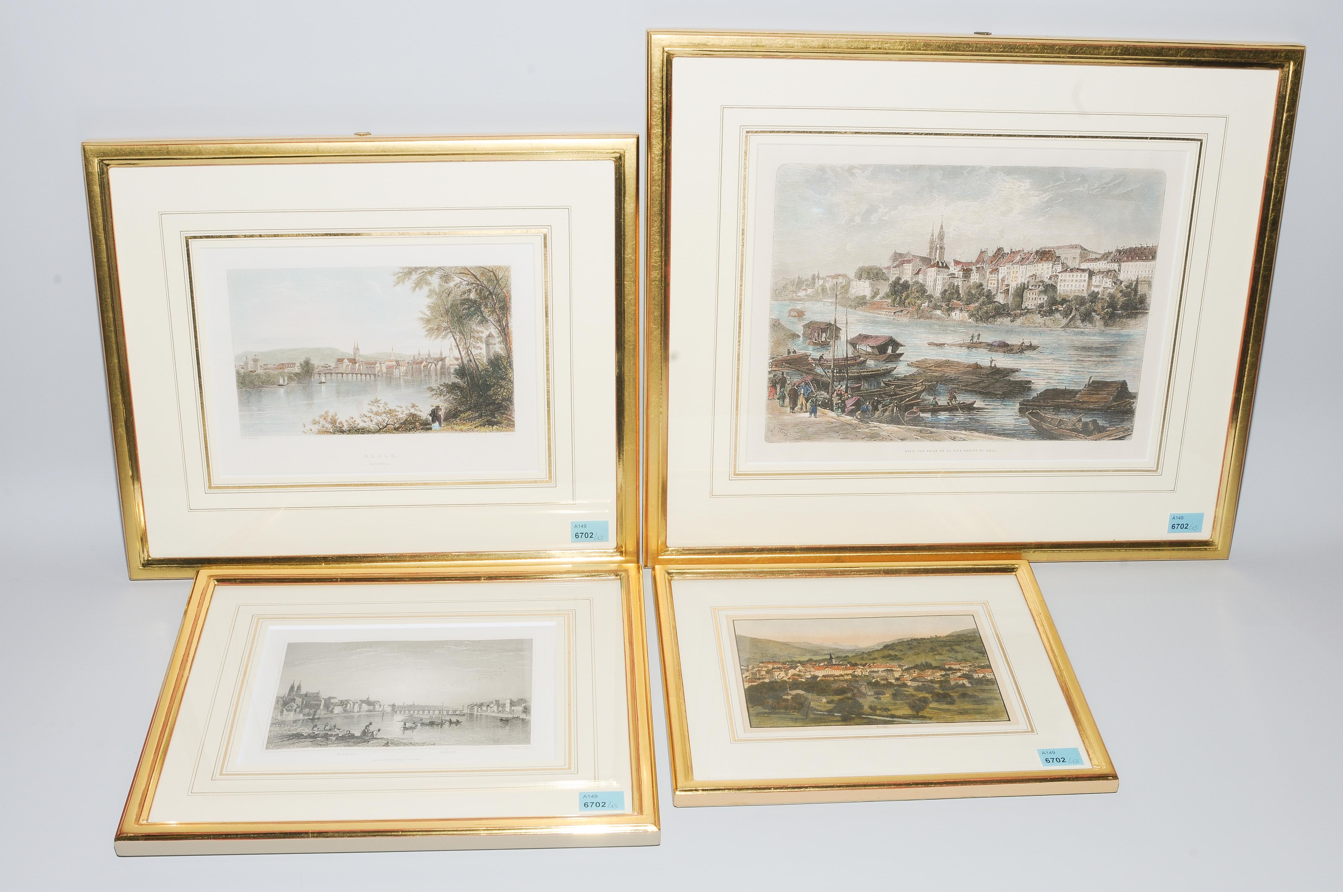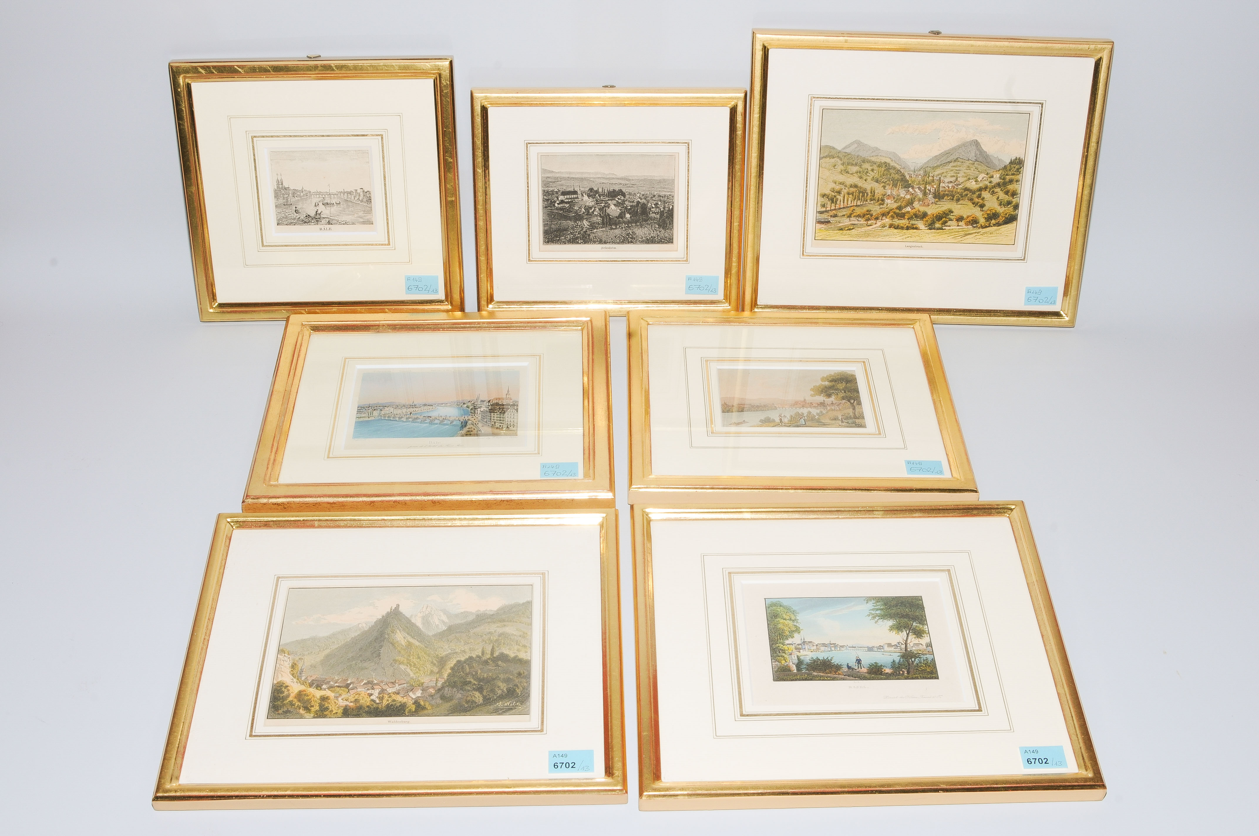 Sammelnummer mit 1 Kupferstich, 3 kol. Aquatintas, 2 (1 Ton-) Lithographien, 2 (1 kol.) Stahlstichen u. 5 (4 kol.) Xylographien, 1642/1890 mit Ansichten v. Arlesheim, Basel, Langenbruck, Liestal u. Waldenburg. 5,5x7 cm bis 20,5x32,6 cm. Zus. 13 Bll. Alle Bll. gerahmt.