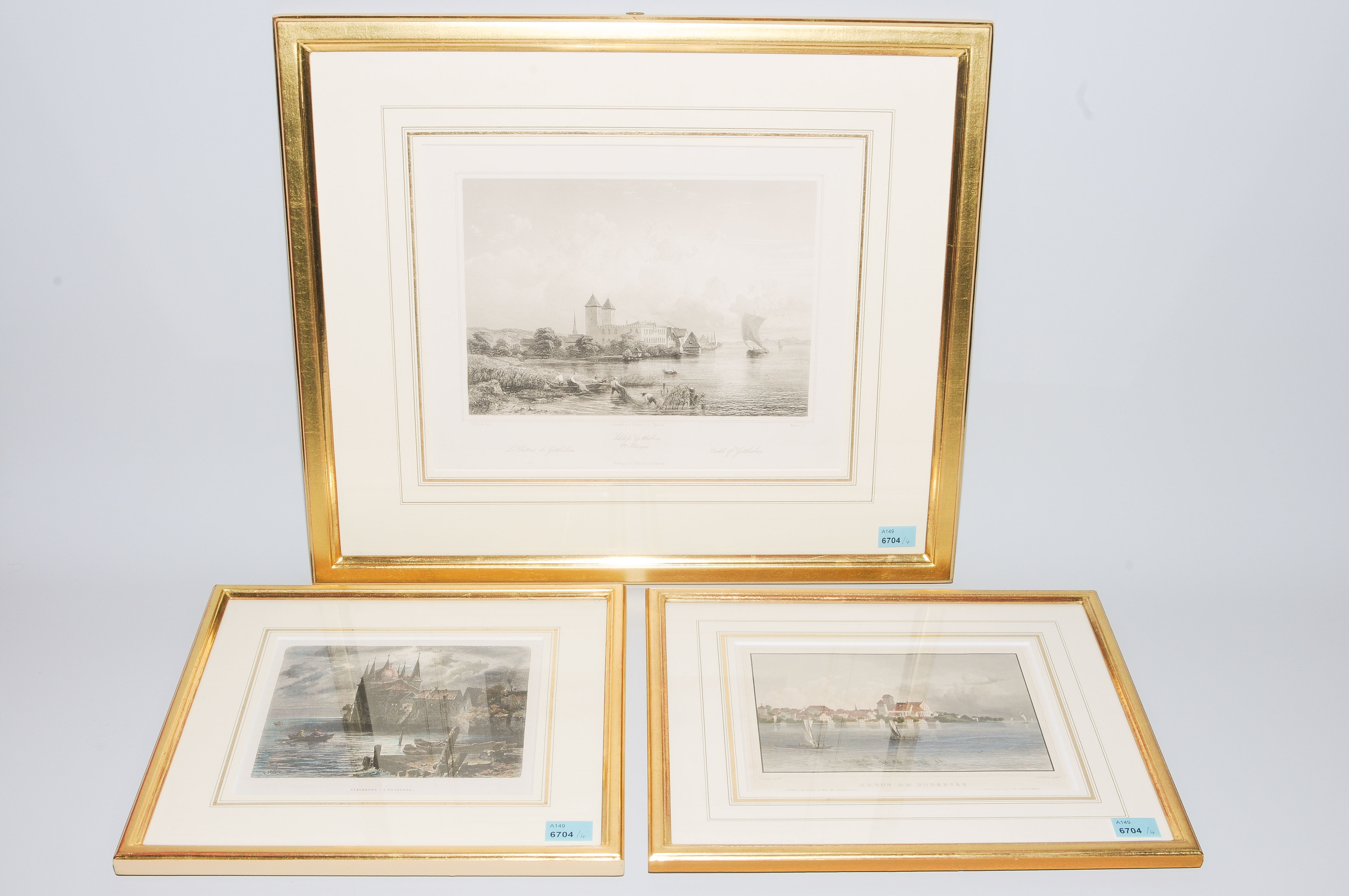 "Vue prise entre Arbon et Horn vers Roschach au Port du Lac de Constance". Kol. Aquatinta v. F. Salathé. Hrsg. v. Bleuler-Verlag, um 1830. 18,4x28,2 cm. BEIGEGEBEN: Arbon / Schloss Gottlieben / Steckborn. 2 (1 kol.) Stahlstiche u. 1 kol. Xylographie, 1853/90. 10,8x16,5 cm bis 18,4x28,3 cm. Zus. 4 Bll. Alle Bll. gerahmt.