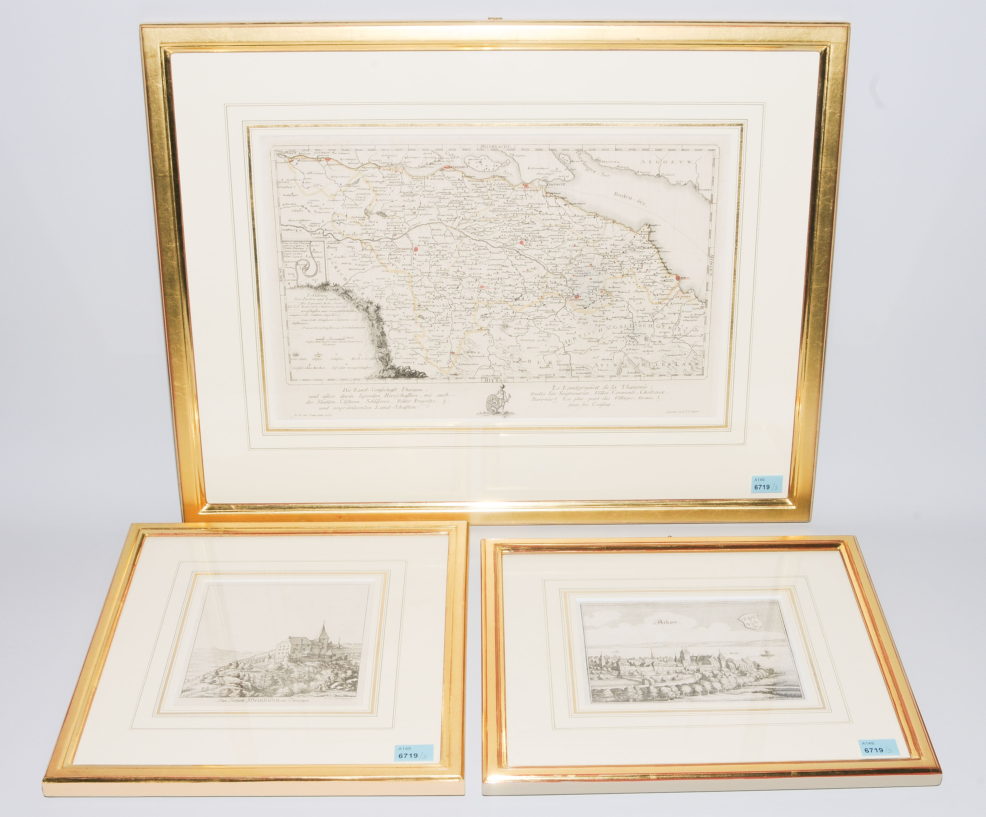"Das Schloss Weinfelden im Thurgeü" / "Arbon" / "Die Land-Grafschafft Thurgeu und allen darin ligenten Herrschafften". 1 Rad. v. J.B. Bullinger, um 1770, 1 Rad. v. Matth. Merian, 1643 u. 1 grenzkol. Kupferstichkarte v. D. Herrliberger, 1767. 12,1x11,8 cm bis 18,4x32,4 cm. Zus. 3 Bll. Alle Bll. gerahmt.