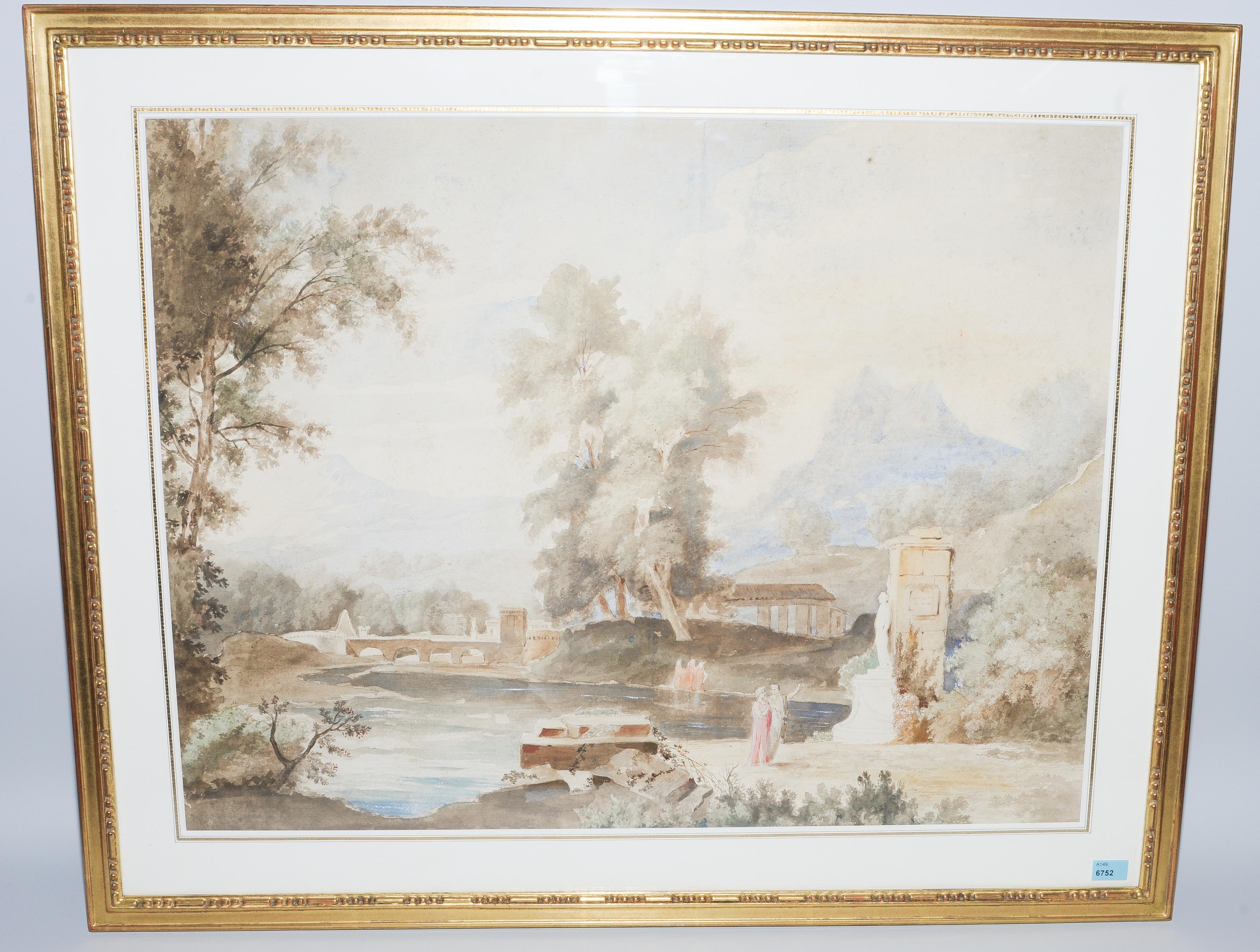 Südliche Ideallandschaft mit antiken Ruinen. Aquarell. 46x60. Gerahmt.