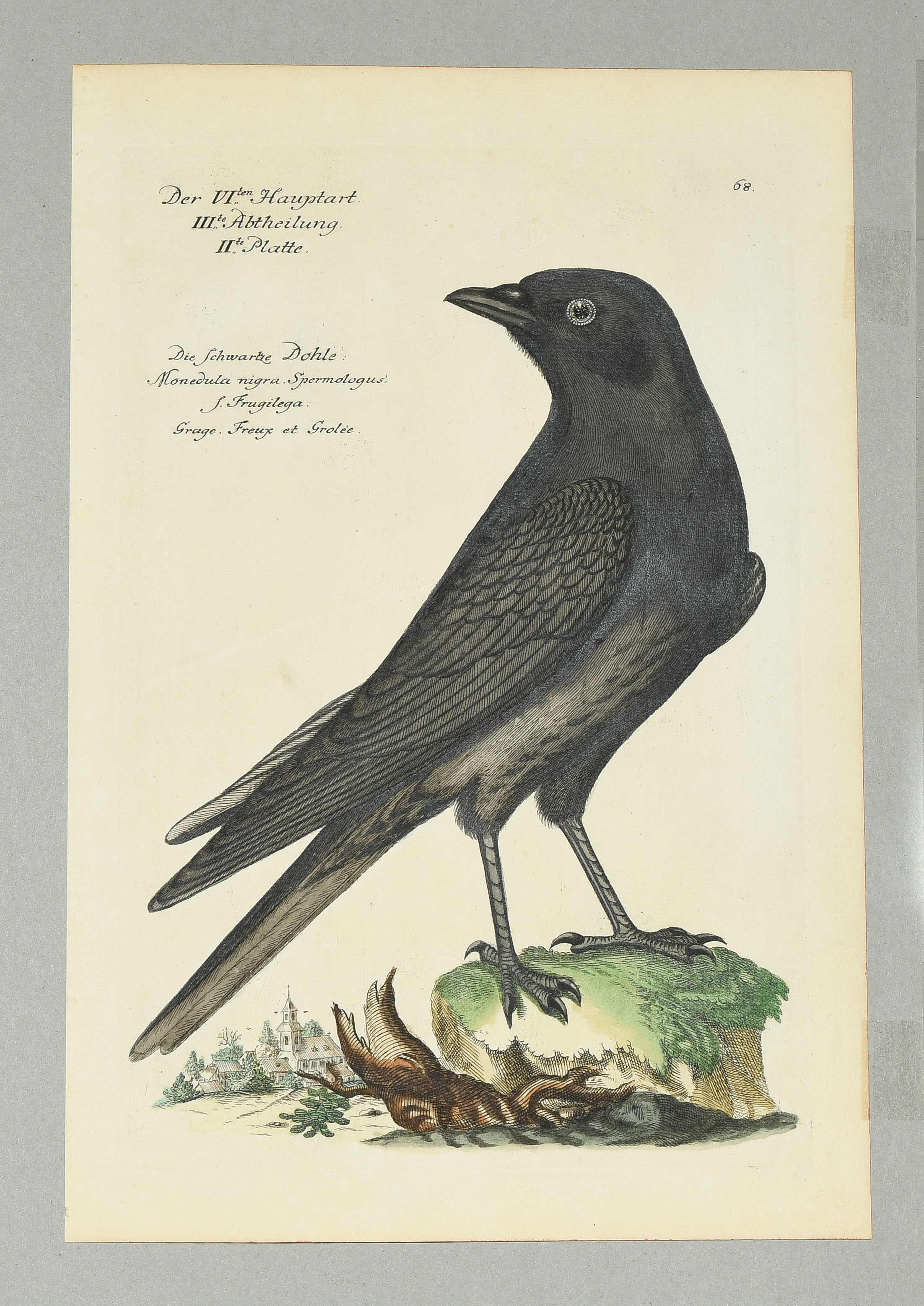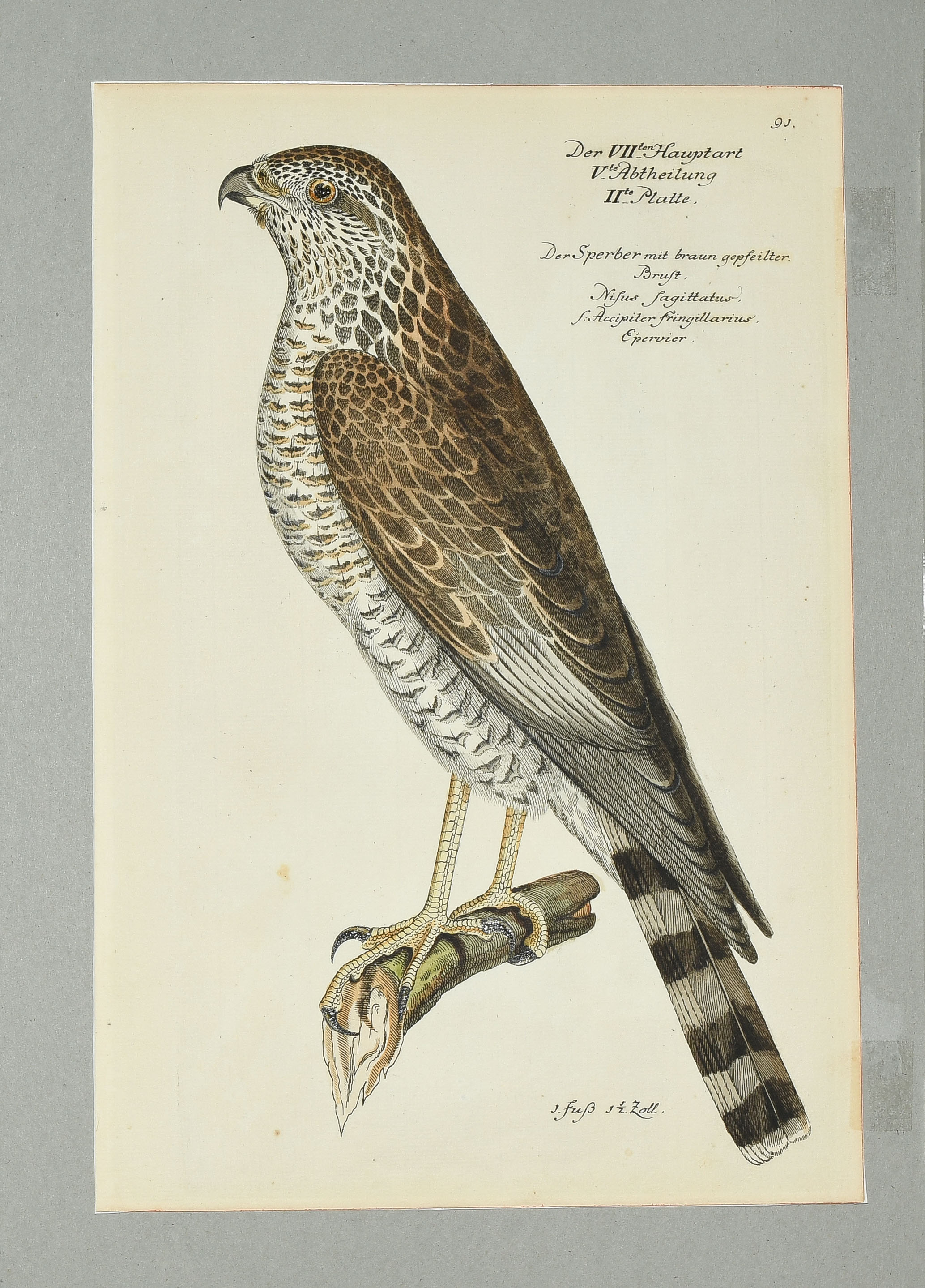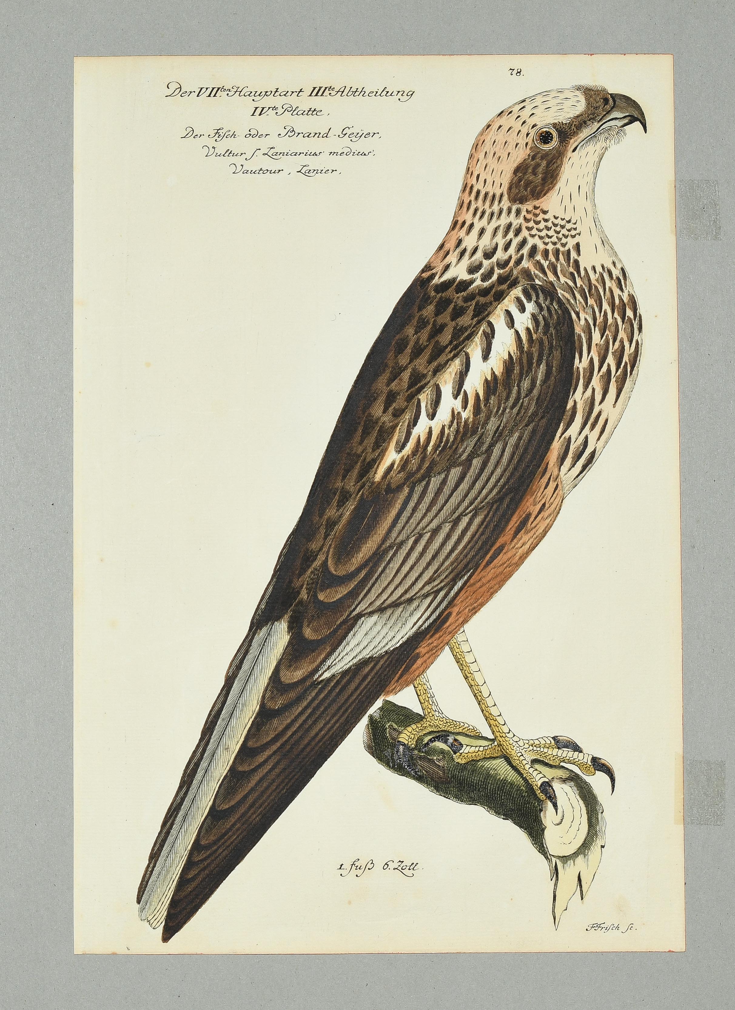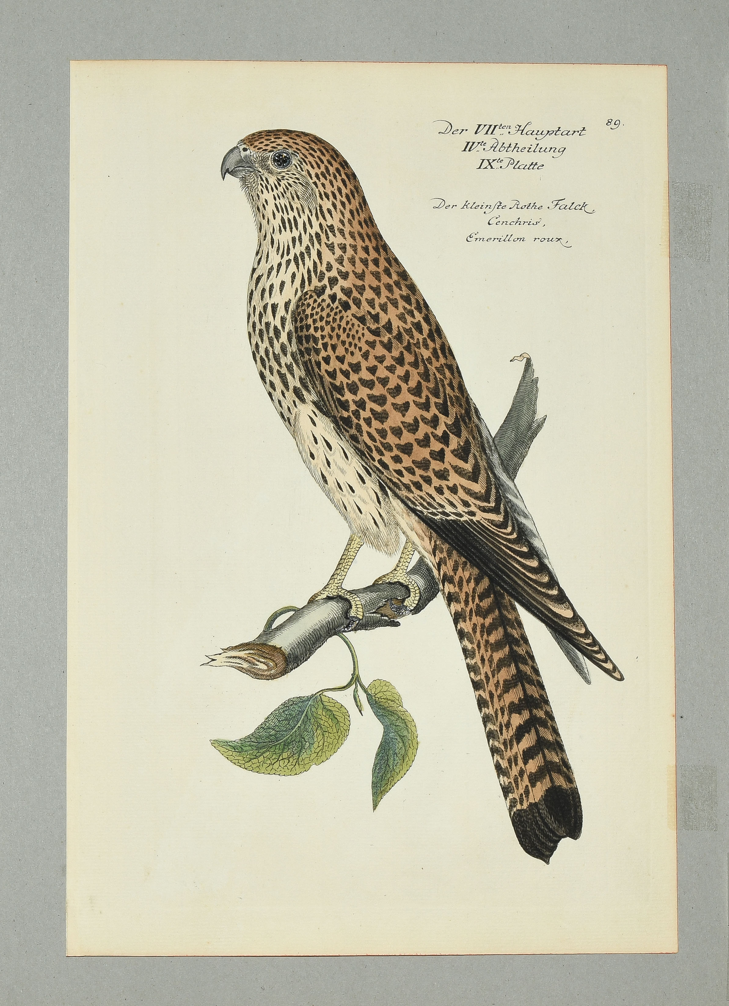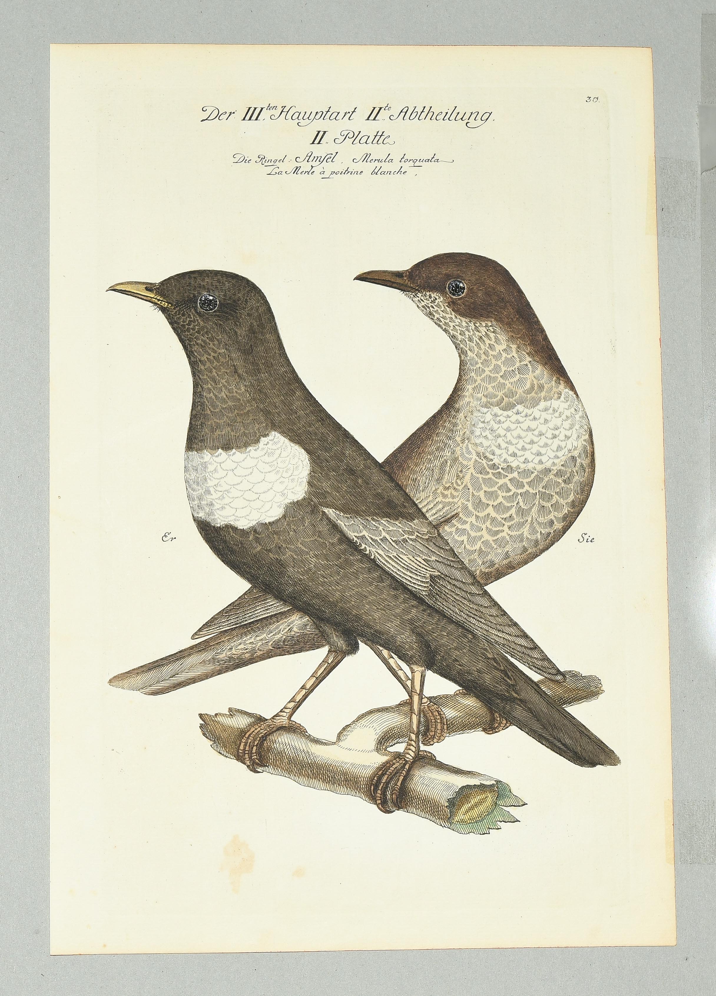 60 kolor. Kupferstiche aus: Joh. Leonh. Frisch.Vorstellung der Vögel Deutschlands und beyläufig auch einiger Fremden nach ihren Eigenschaften beschrieben. Berlin: Birnstiel, 1763. 13 Bll. ca 16x22 cm (Blatt), 47 Bll. ca. 33x22 cm. - Nissen, Vogelbücher, Nr. 339. Fragment der vielleichts schönsten Gesamtdarstellung Deutschlands Vogelfauna aus dem 18. Jh. - Alle Bll. in schönem Kolorit der Zeit, sehr gut erhalten und unter Passepartouts.