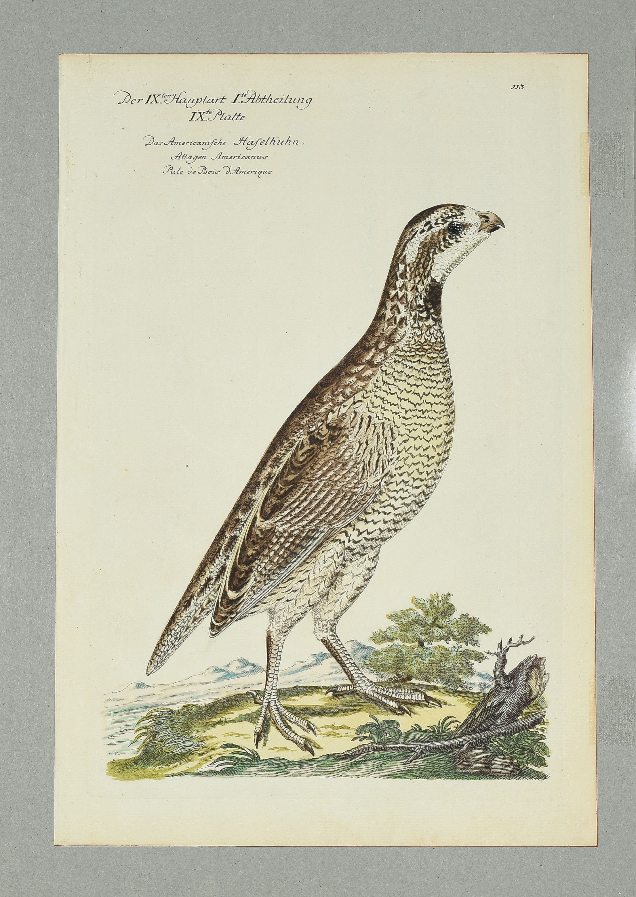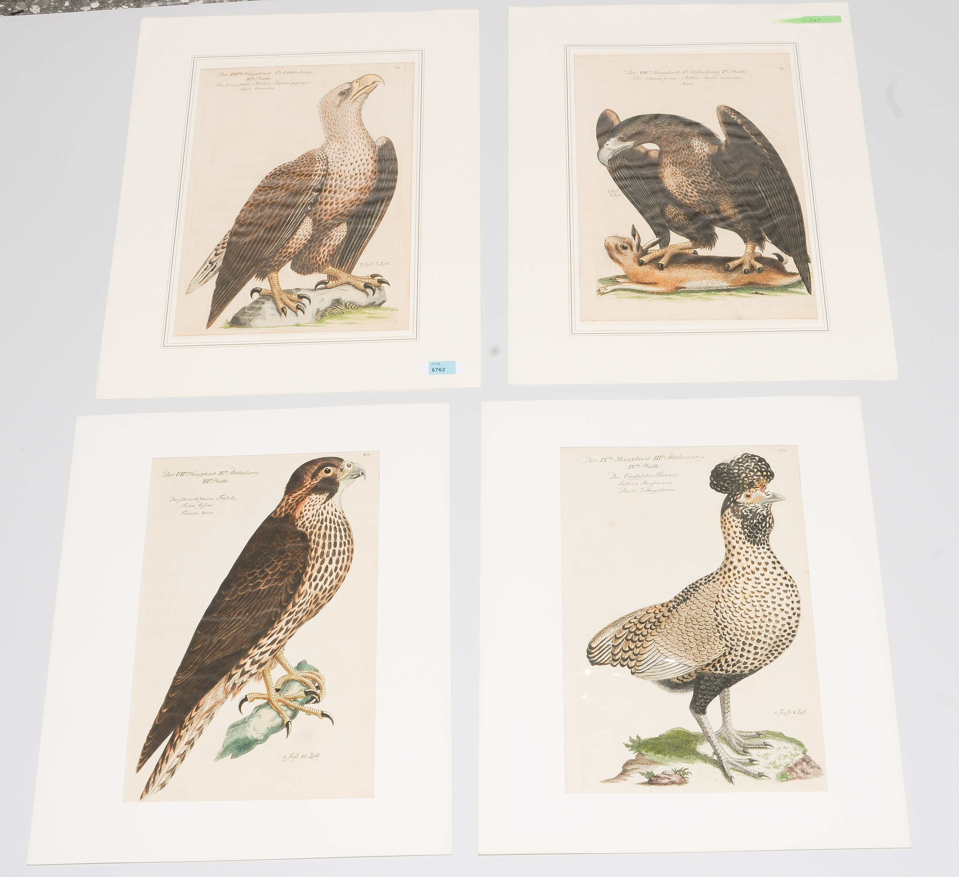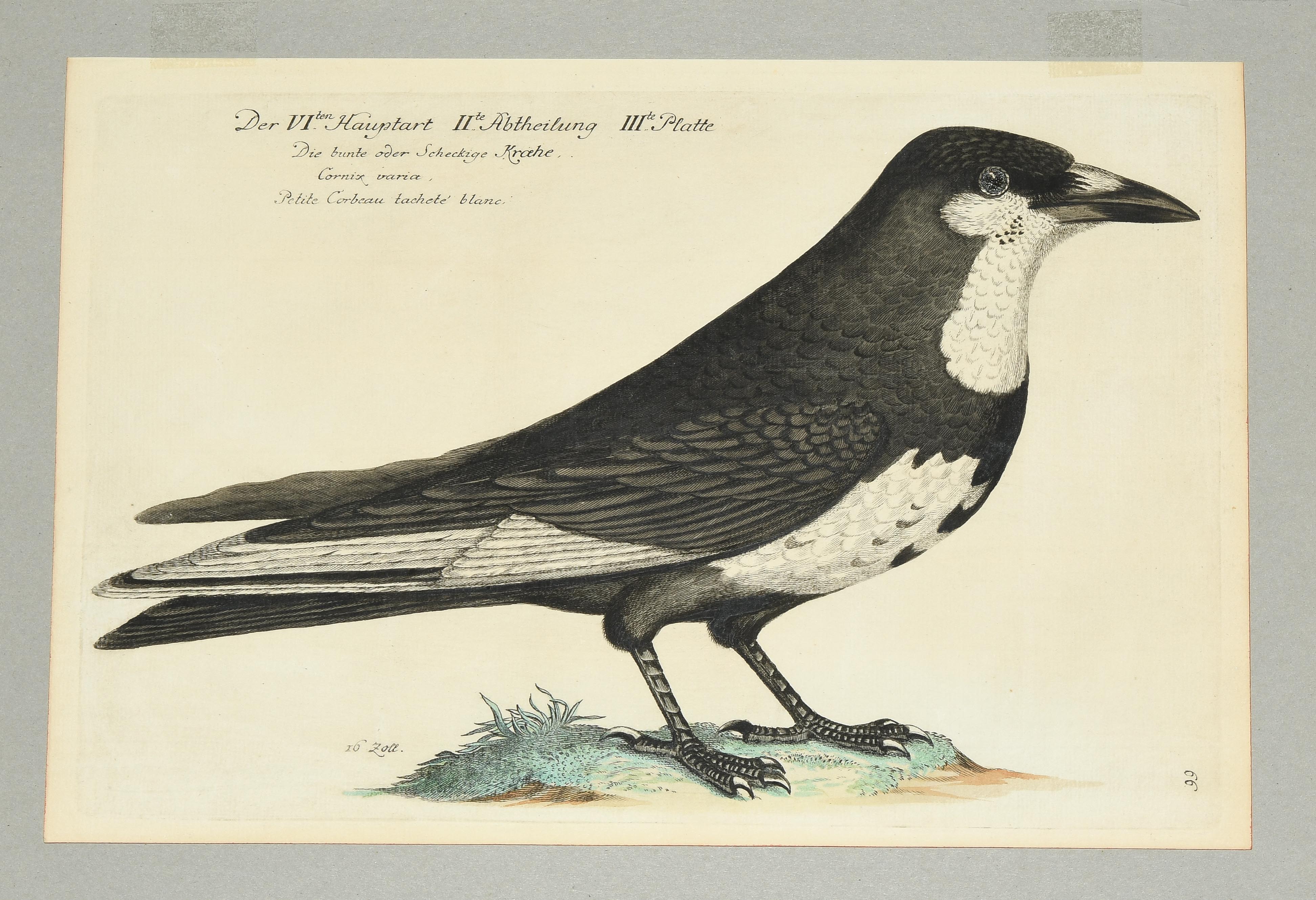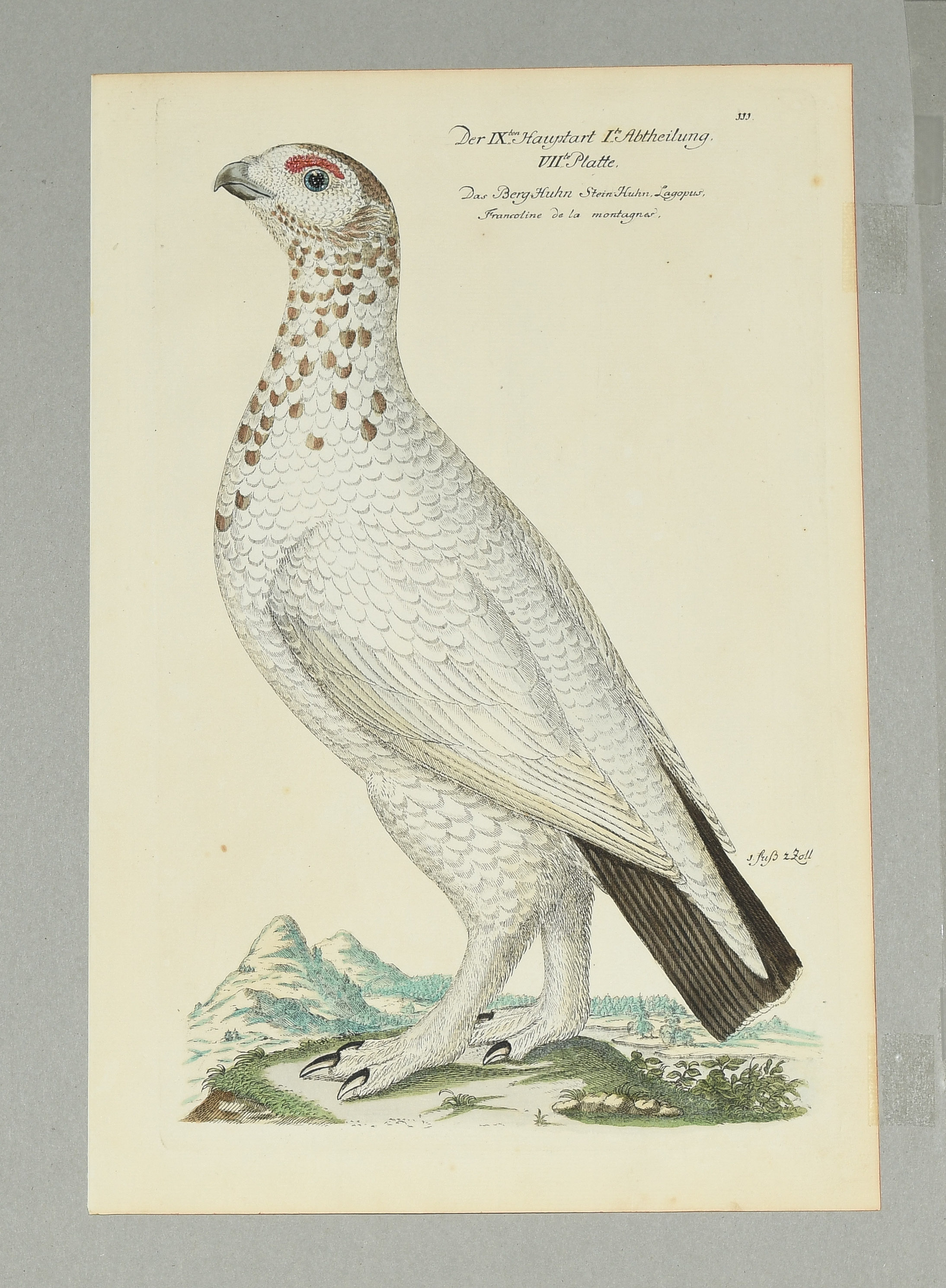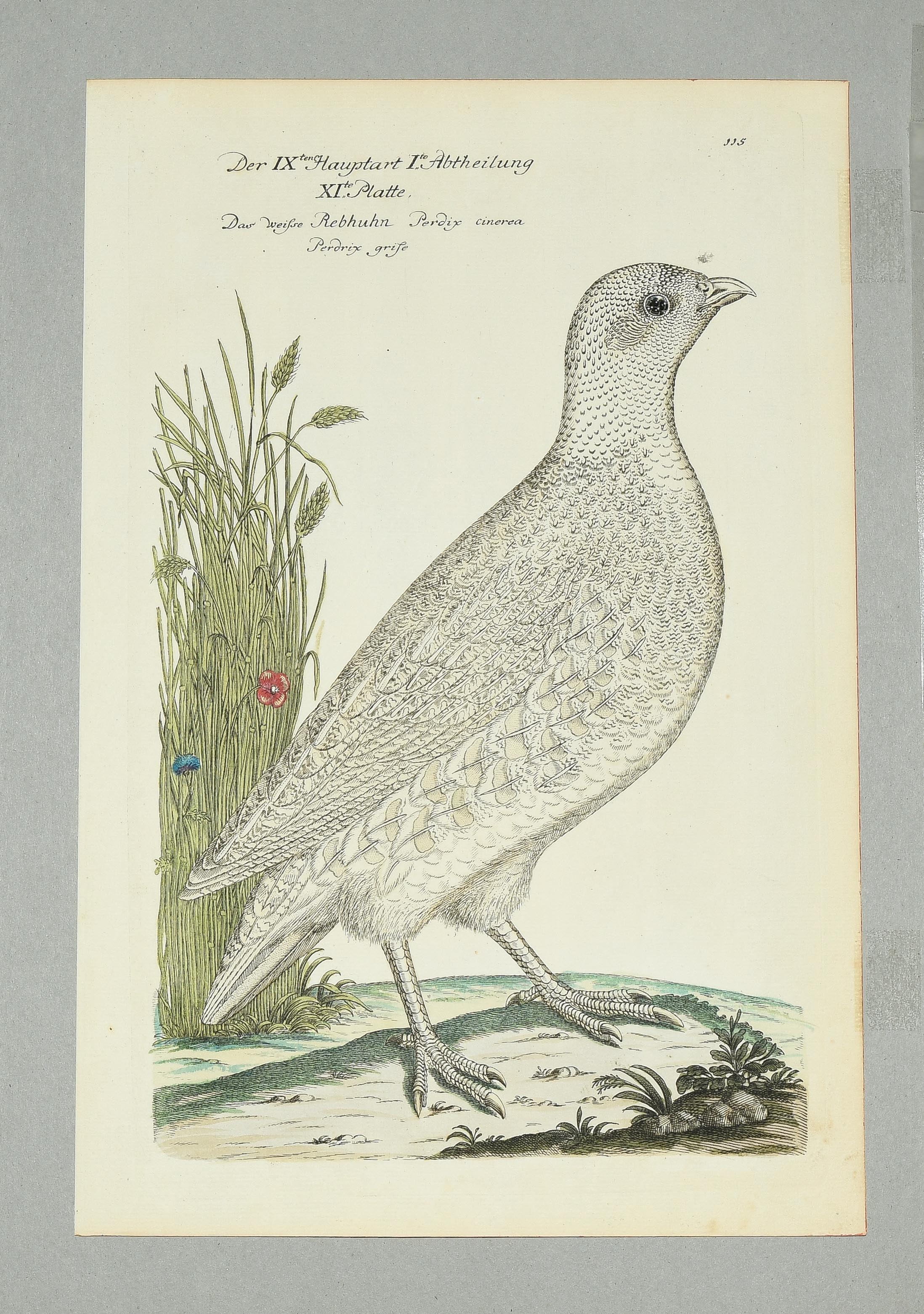 60 kolor. Kupferstiche aus: Joh. Leonh. Frisch.Vorstellung der Vögel Deutschlands und beyläufig auch einiger Fremden nach ihren Eigenschaften beschrieben. Berlin: Birnstiel, 1763. 13 Bll. ca 16x22 cm (Blatt), 47 Bll. ca. 33x22 cm. - Nissen, Vogelbücher, Nr. 339. Fragment der vielleichts schönsten Gesamtdarstellung Deutschlands Vogelfauna aus dem 18. Jh. - Alle Bll. in schönem Kolorit der Zeit, sehr gut erhalten und unter Passepartouts.