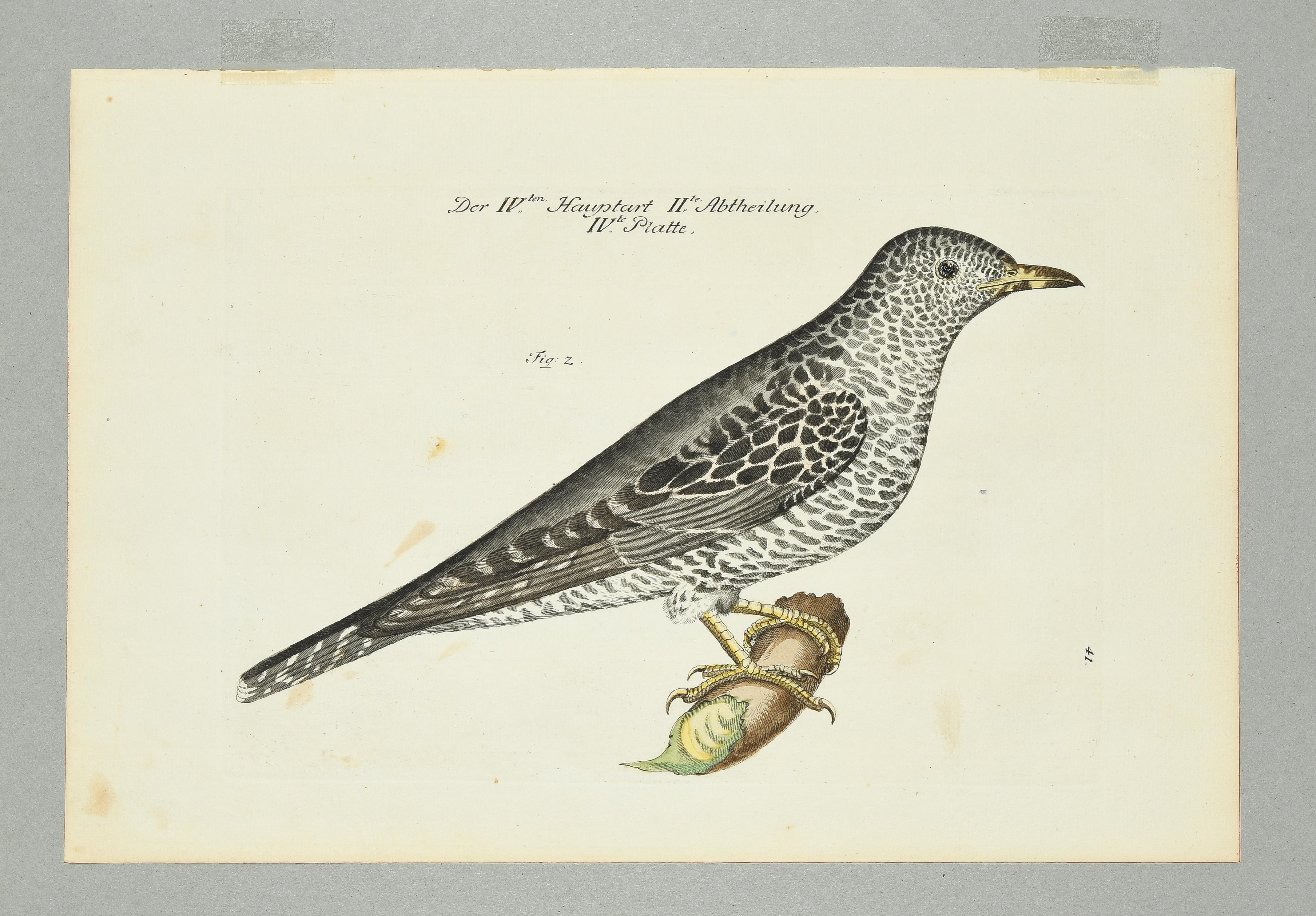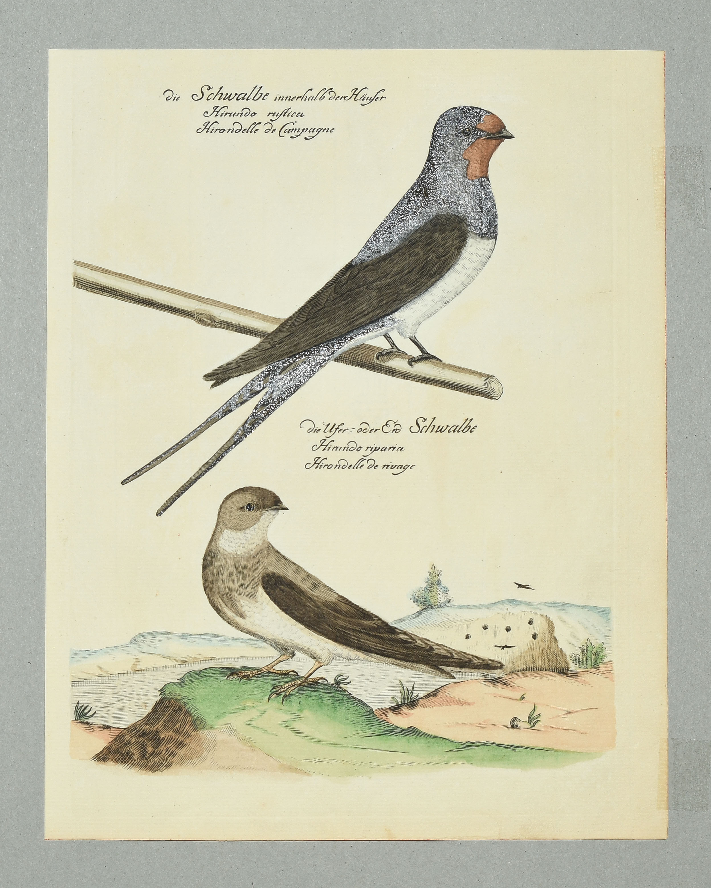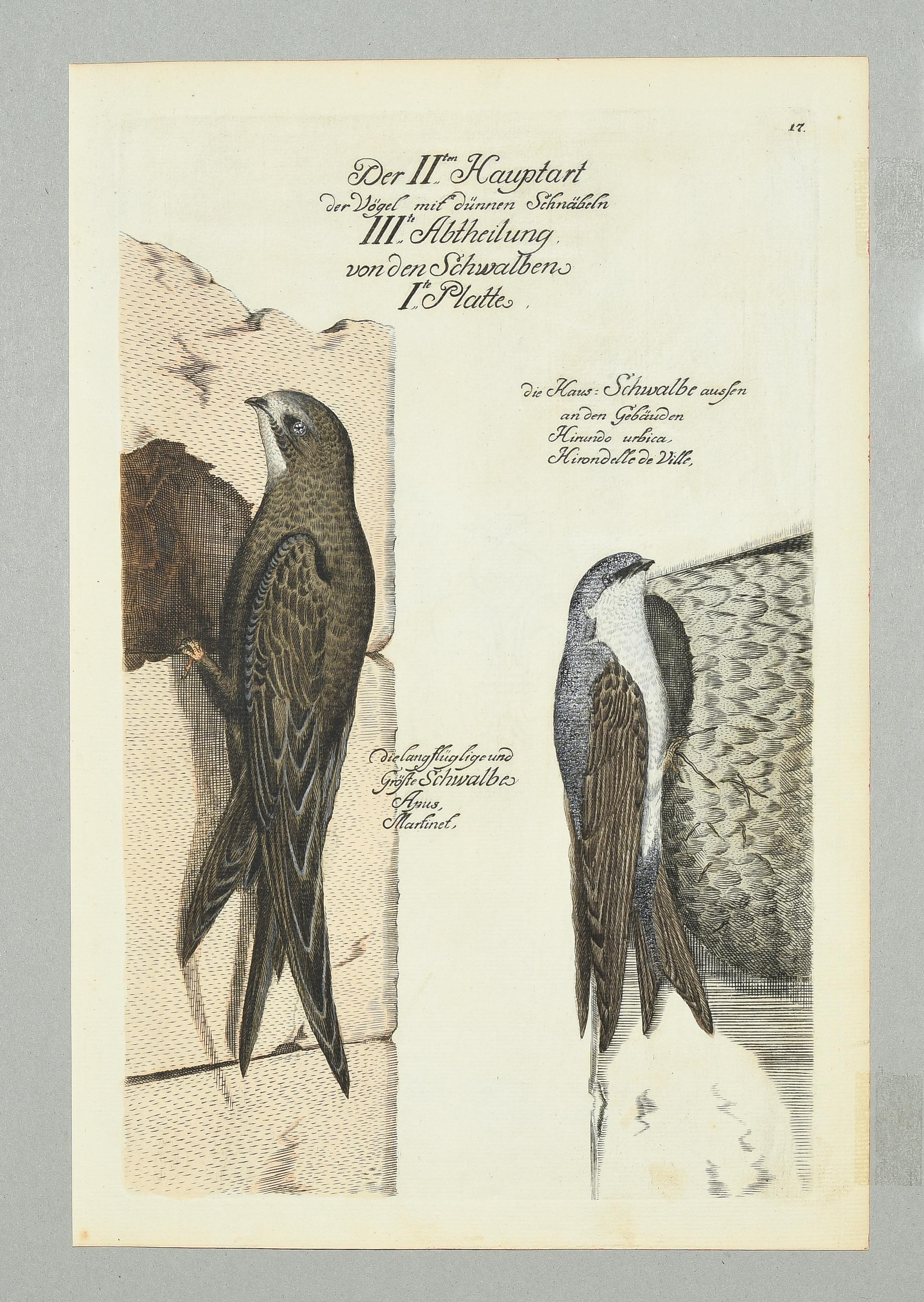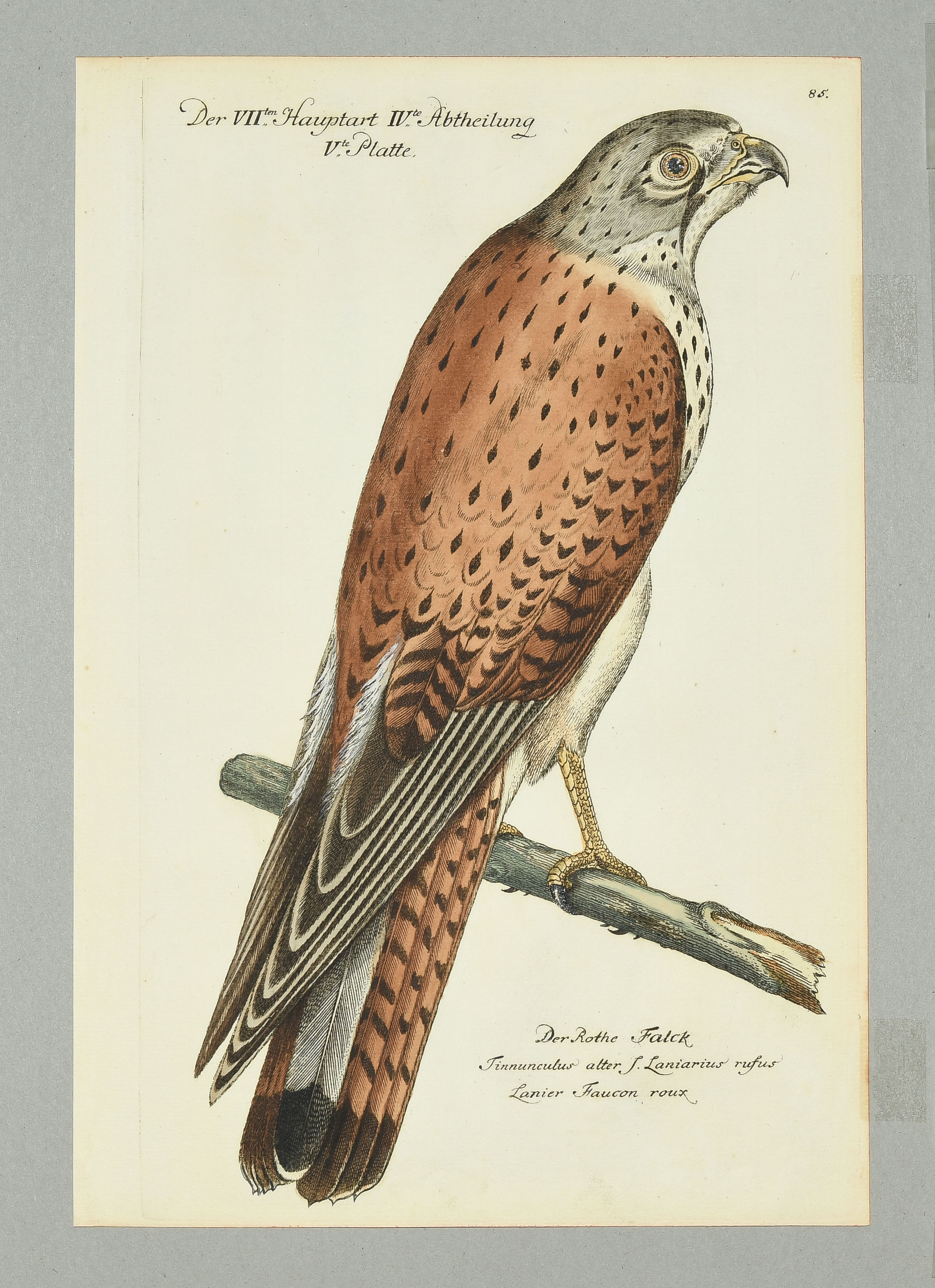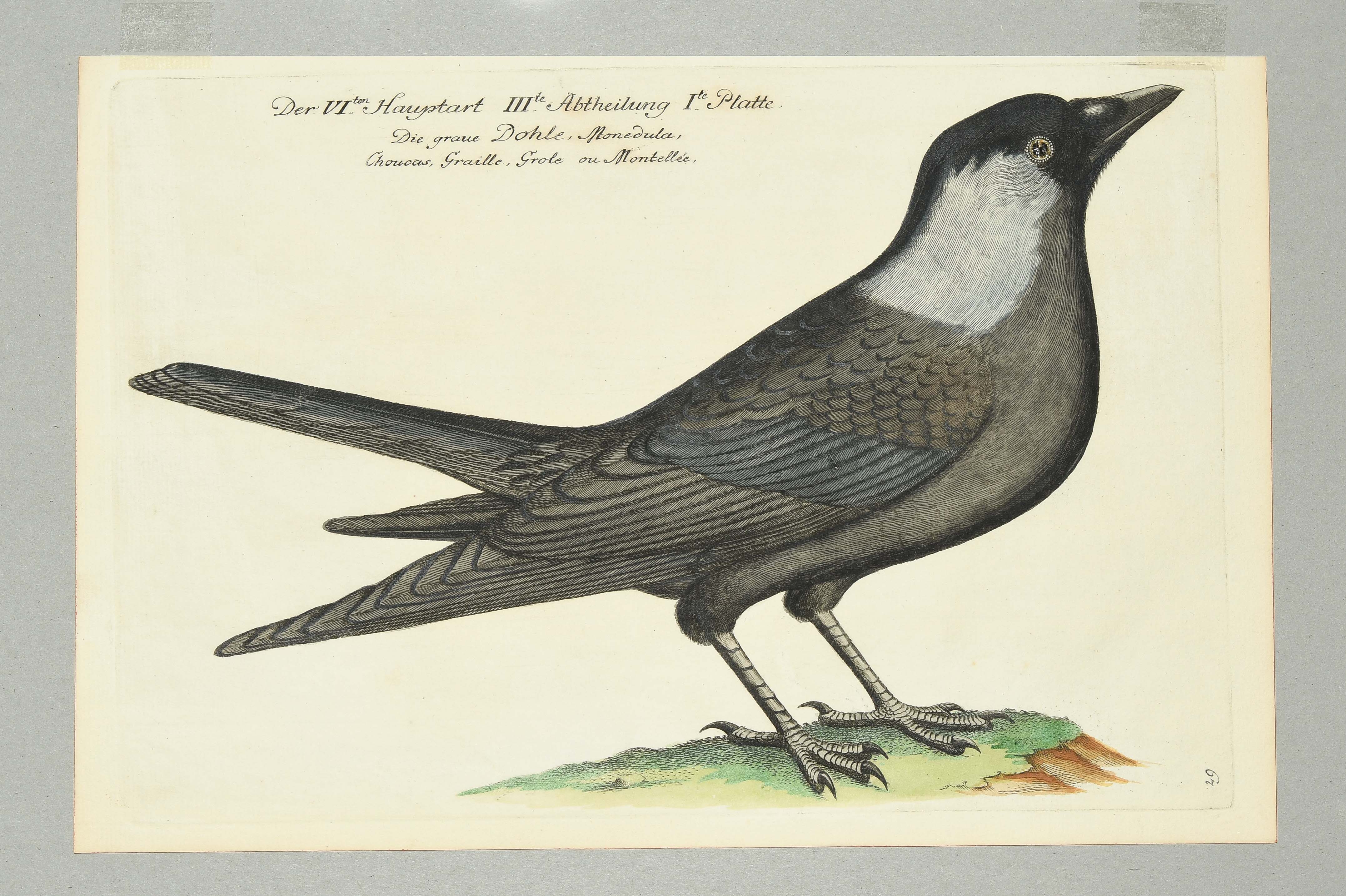 60 kolor. Kupferstiche aus: Joh. Leonh. Frisch.Vorstellung der Vögel Deutschlands und beyläufig auch einiger Fremden nach ihren Eigenschaften beschrieben. Berlin: Birnstiel, 1763. 13 Bll. ca 16x22 cm (Blatt), 47 Bll. ca. 33x22 cm. - Nissen, Vogelbücher, Nr. 339. Fragment der vielleichts schönsten Gesamtdarstellung Deutschlands Vogelfauna aus dem 18. Jh. - Alle Bll. in schönem Kolorit der Zeit, sehr gut erhalten und unter Passepartouts.