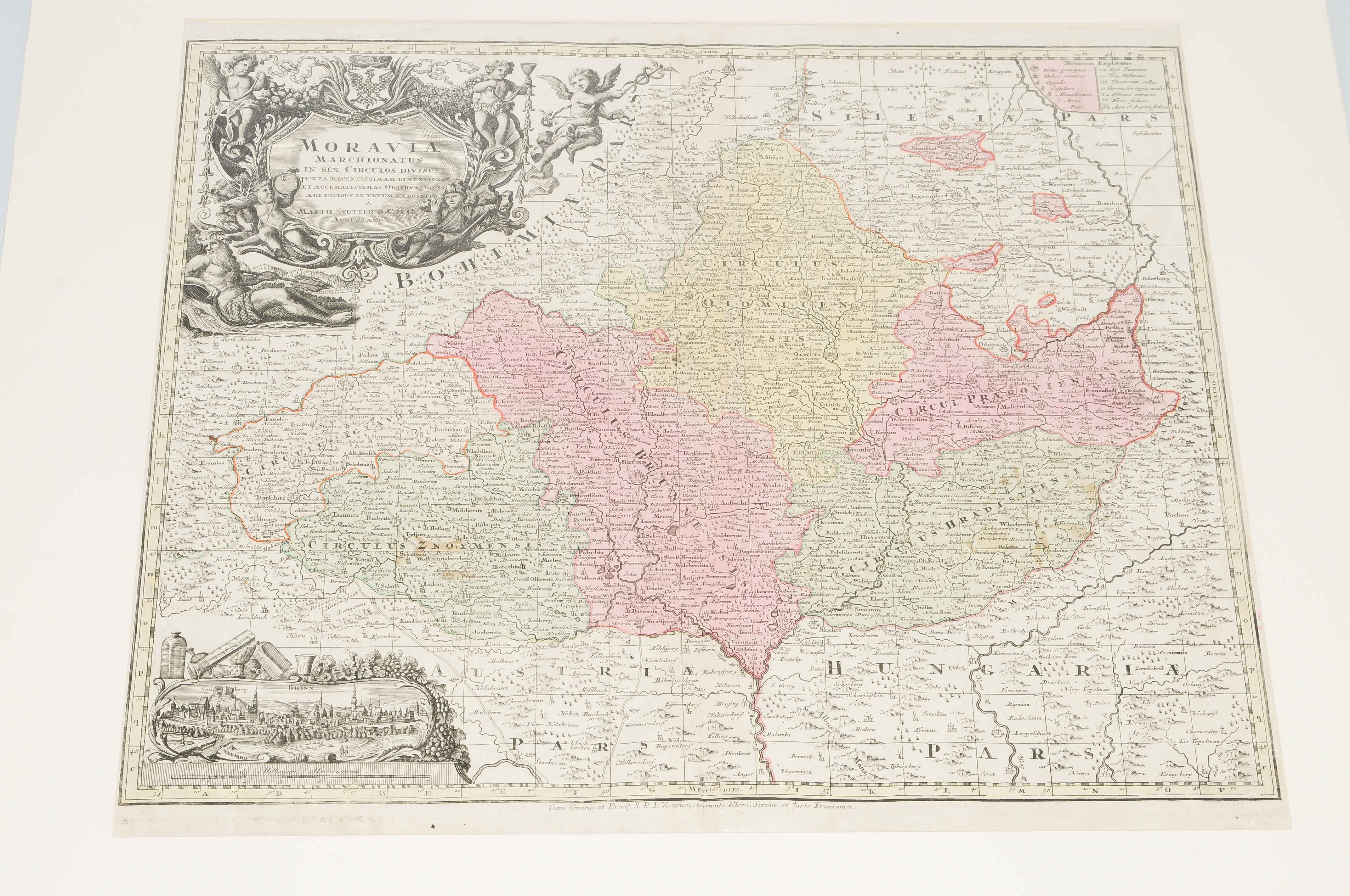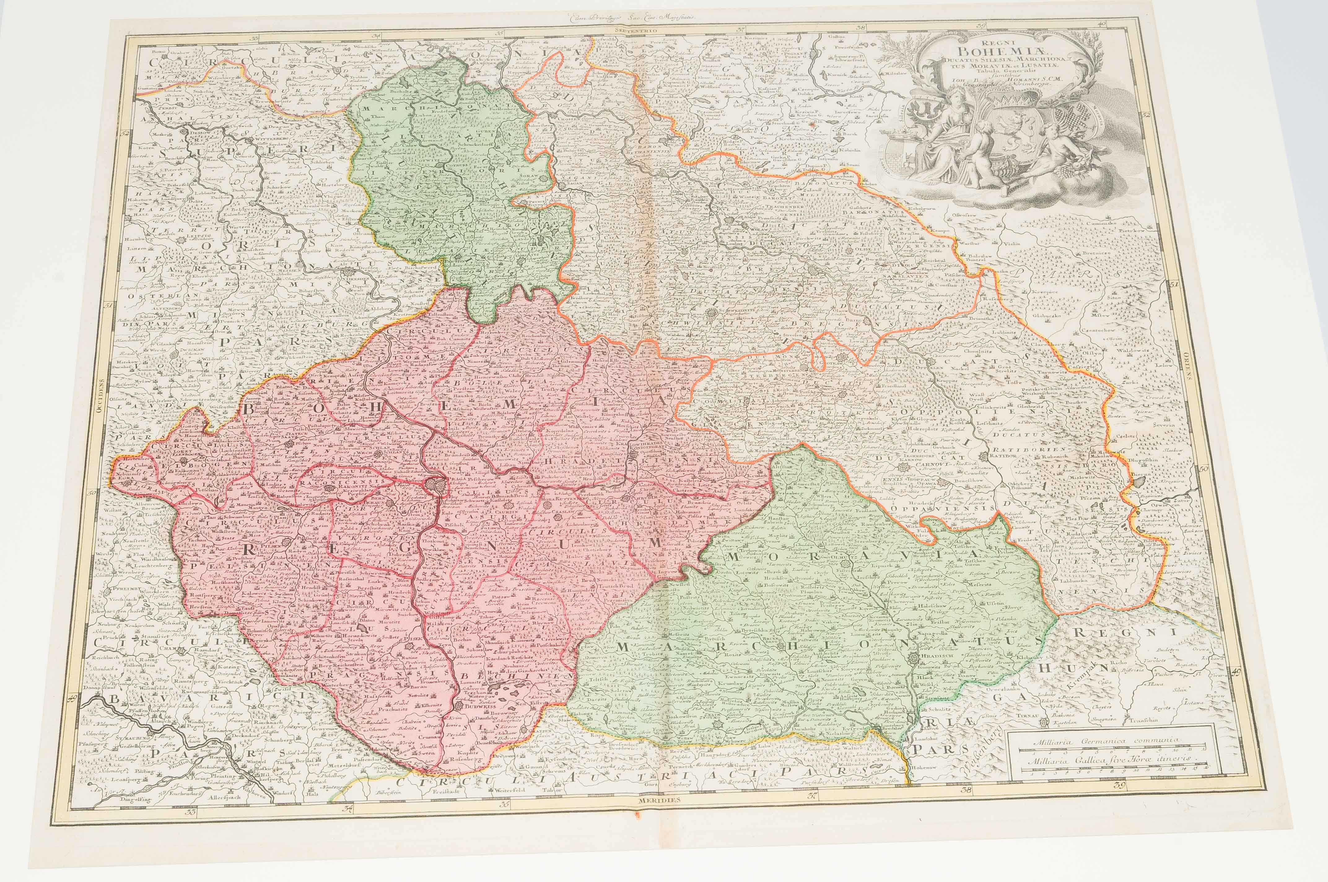 "REGNI BOHEMIAE...tabula generalis". Kolor. Kupferstichkarte, hg. von J. B. Homann, Nürnberg, um 1720/ 30. 46,5x56 cm. - Mit grosser figürl. Titelkartusche. Beigelegt: Mähren. "MORAVIA MARCHIONATUS IN SEX CIRCULOS DIVISUS...". Kolor. Kupferstichkarte, hg. von J. B. Homann, Nürnberg, um 1720/ 30. 49,3x58 cm.