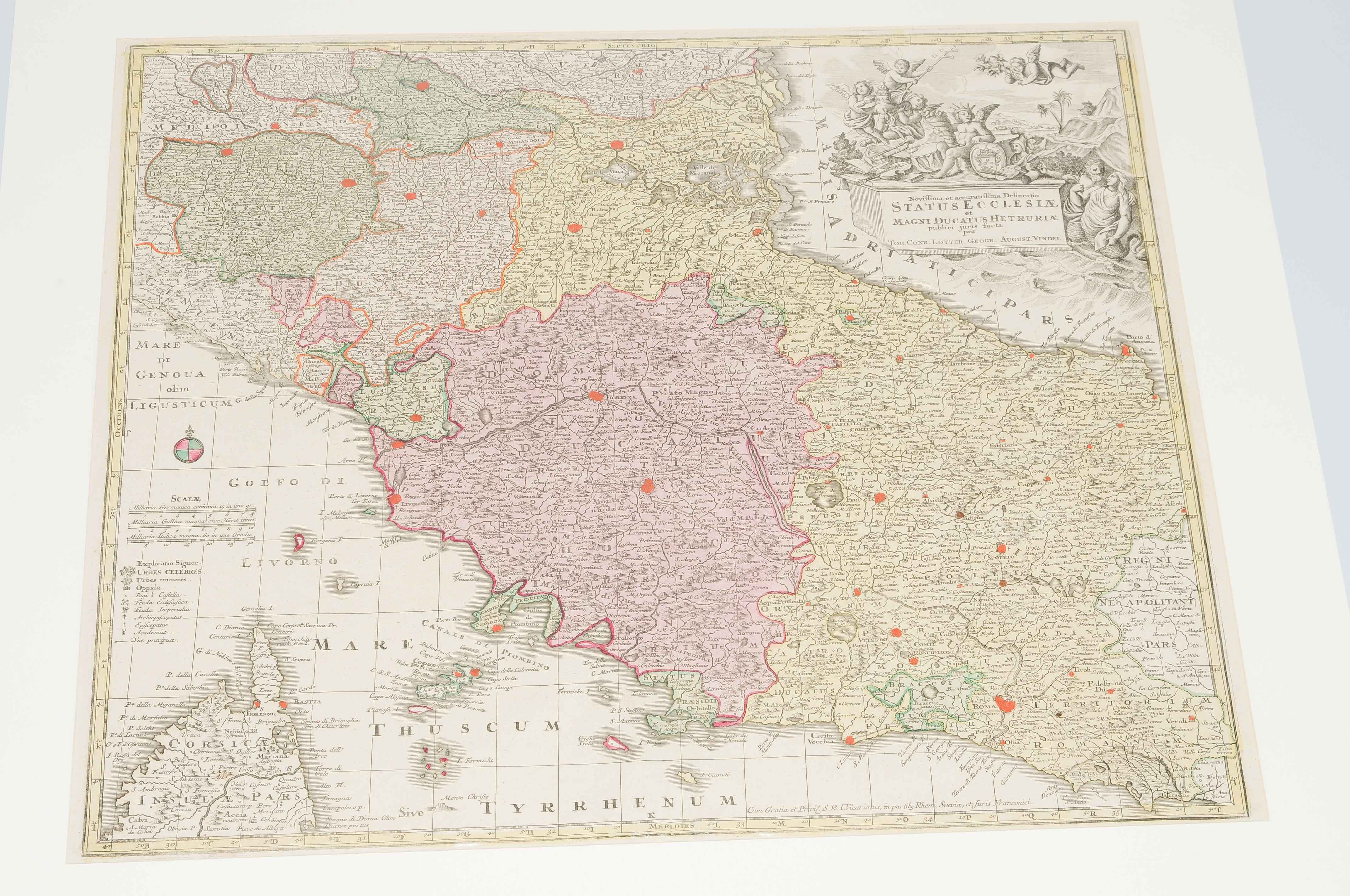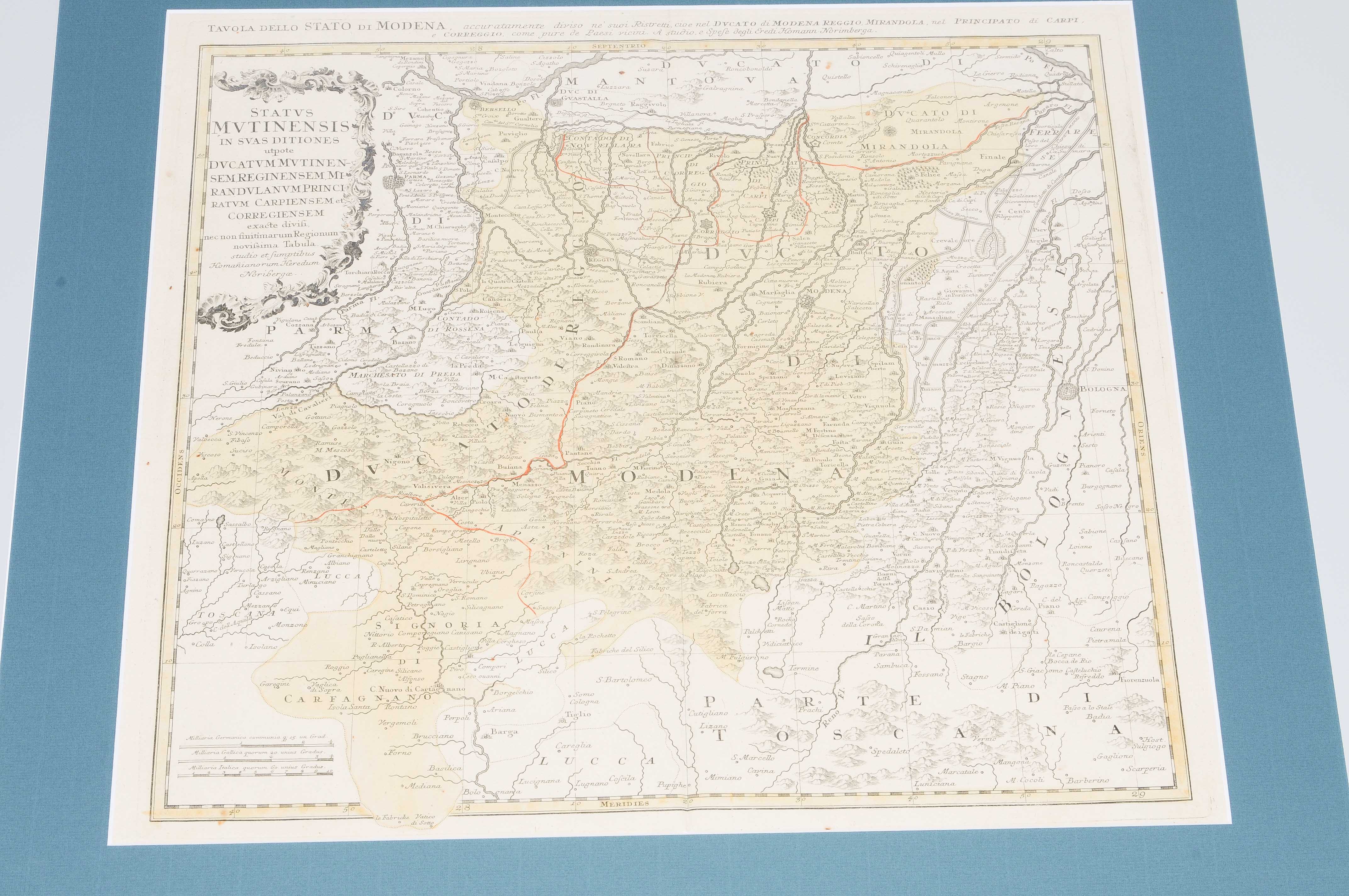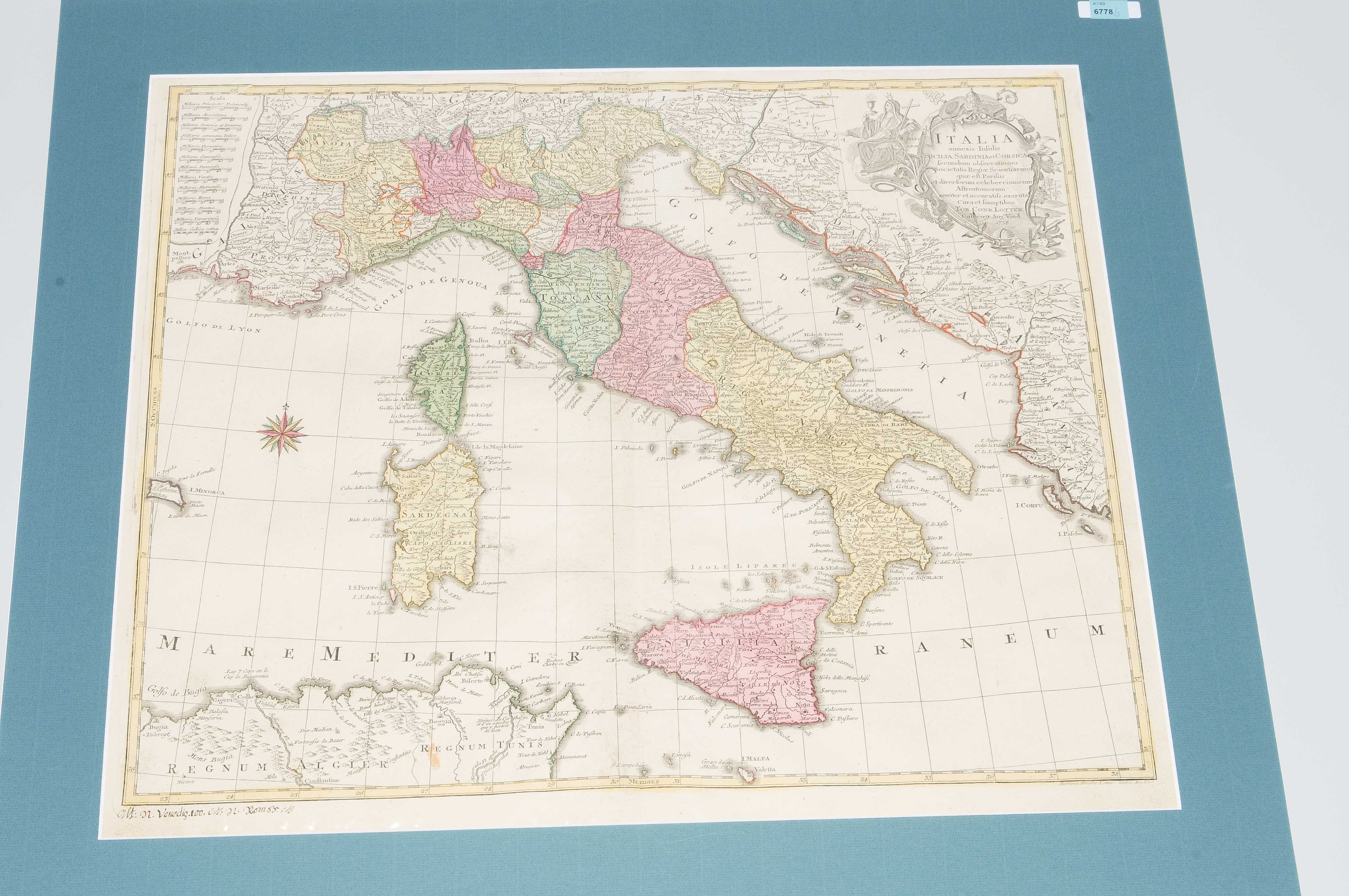 "ITALIA annexis Insulis...exarata". Kolor. Kupferstichkarte, hg. von T. C. Lotter, Augsburg, 1758. 46,5x56 cm. Mit dekor. Kartusche. Beigelegt: 2 Bll. Kirchenstaat mit Toskana. "Novissima ...Delineatio STATVS ECCLESIAE". Kolor. Kupferstichkarte, hg. von T. C. Lotter, Augsburg, um 1770. 48,5x57 cm. Mit gr. figürl. Kartusche. Beigelegt: Modena. "STATVS MVTINENSIS". Kolor. Kupferstichkarte, hg. von Homanns Erben, Nürnberg, um 1730. 45,6X49,cm. Mit dekor. Kartusche und Meilenanzeiger..
