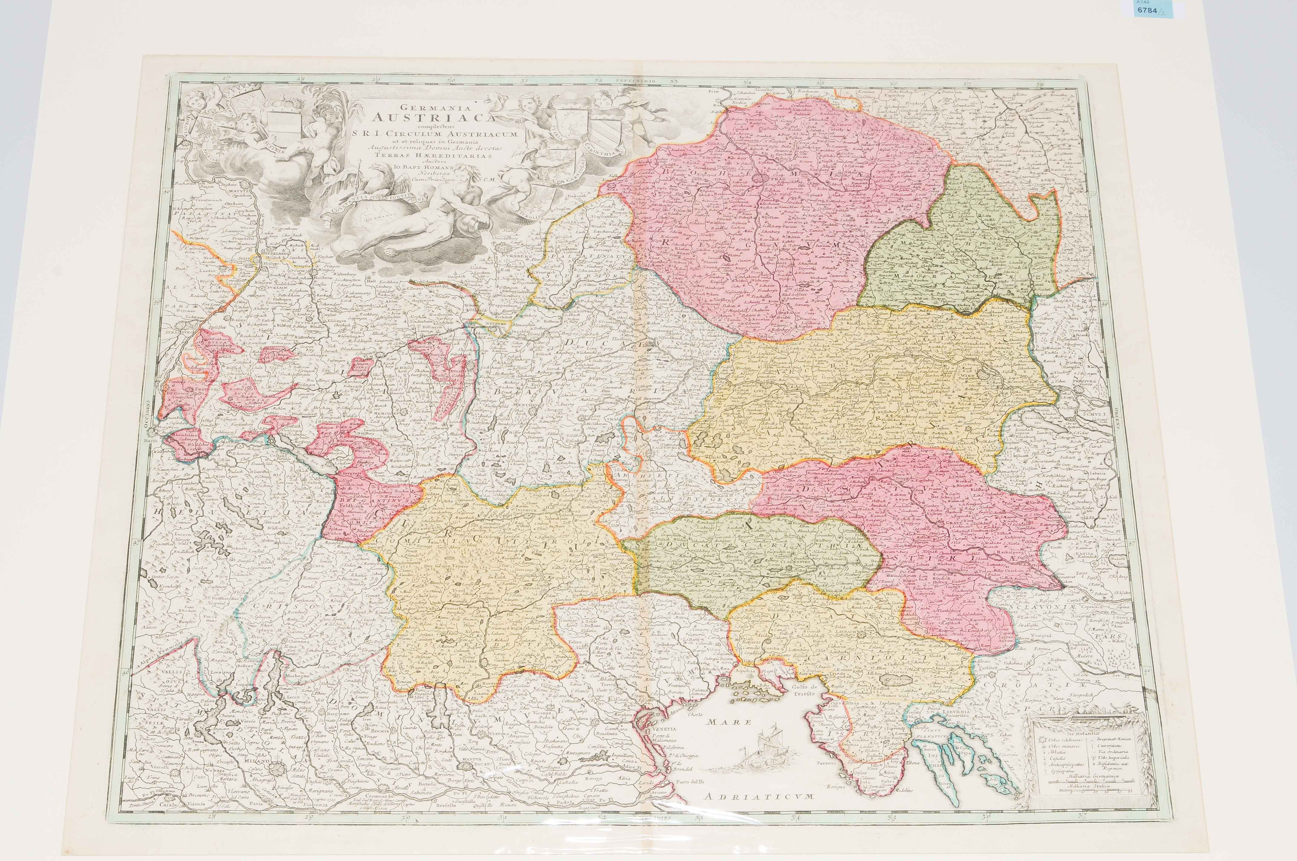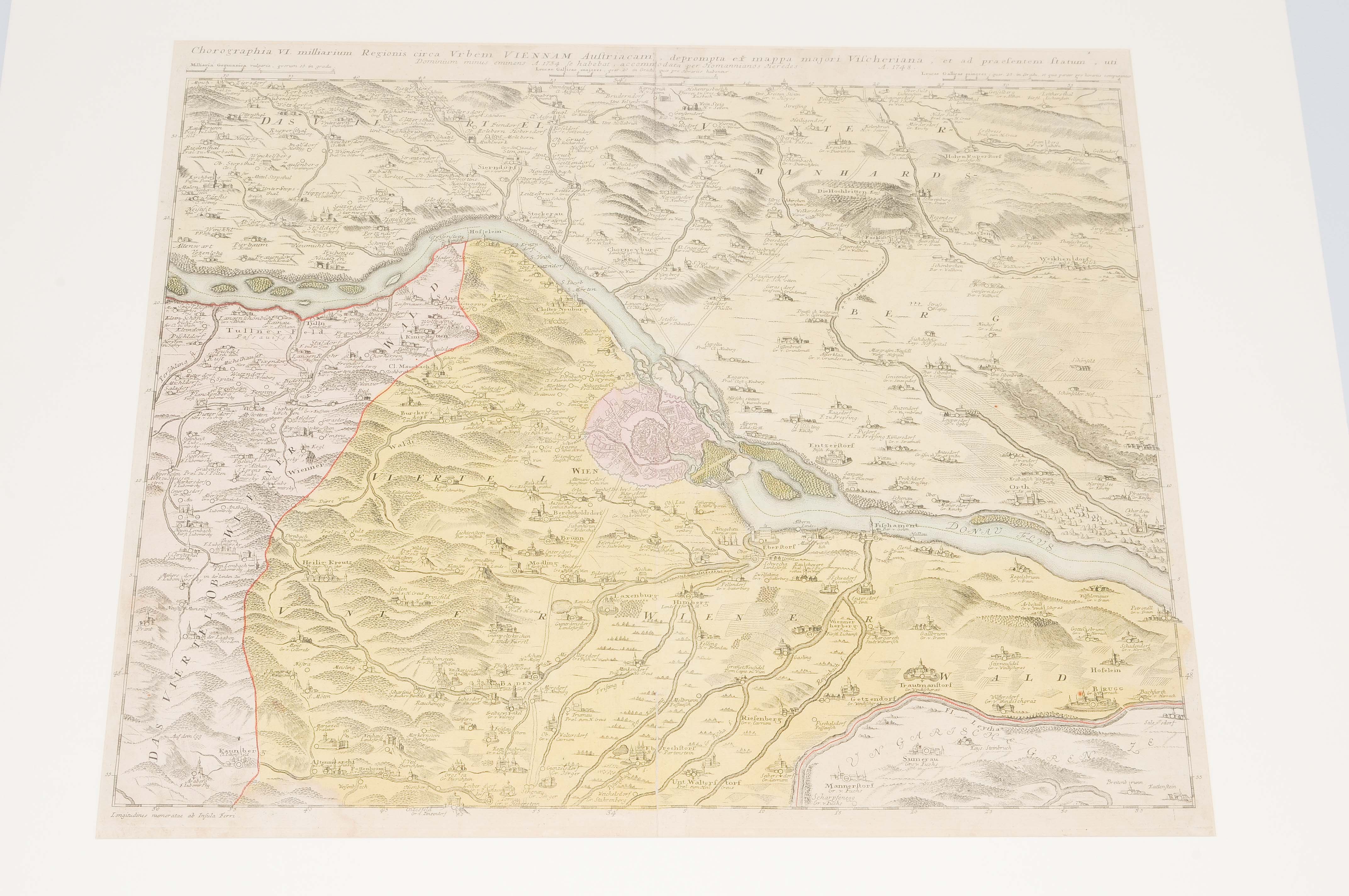 "Chorographia VI. milliarium Regionis circa Vrbem VIENNAM." Kolor. Kupfertichkarte, hg. von Homanns Erben, Nürnberg, 1748. 45,7x55,6 cm. Zeigt Gebiet um Wien von Tulln bis Bruck (W/O) und von Grossmugl bis Ebreichsdorf (N/S). Beigelegt: Österr. Erbländer. "GERMANIA AUSTRIACA ". Kolor. Kupferstichkarte, hg. von Joh. Bapt. Homann, Nürnberg, um 1720. 48x56 cm. Mit gr. figürl. Wappenkartusche. Umfasst die österr. Erbländer mit böhm. Kronländern und Vorderösterreich.