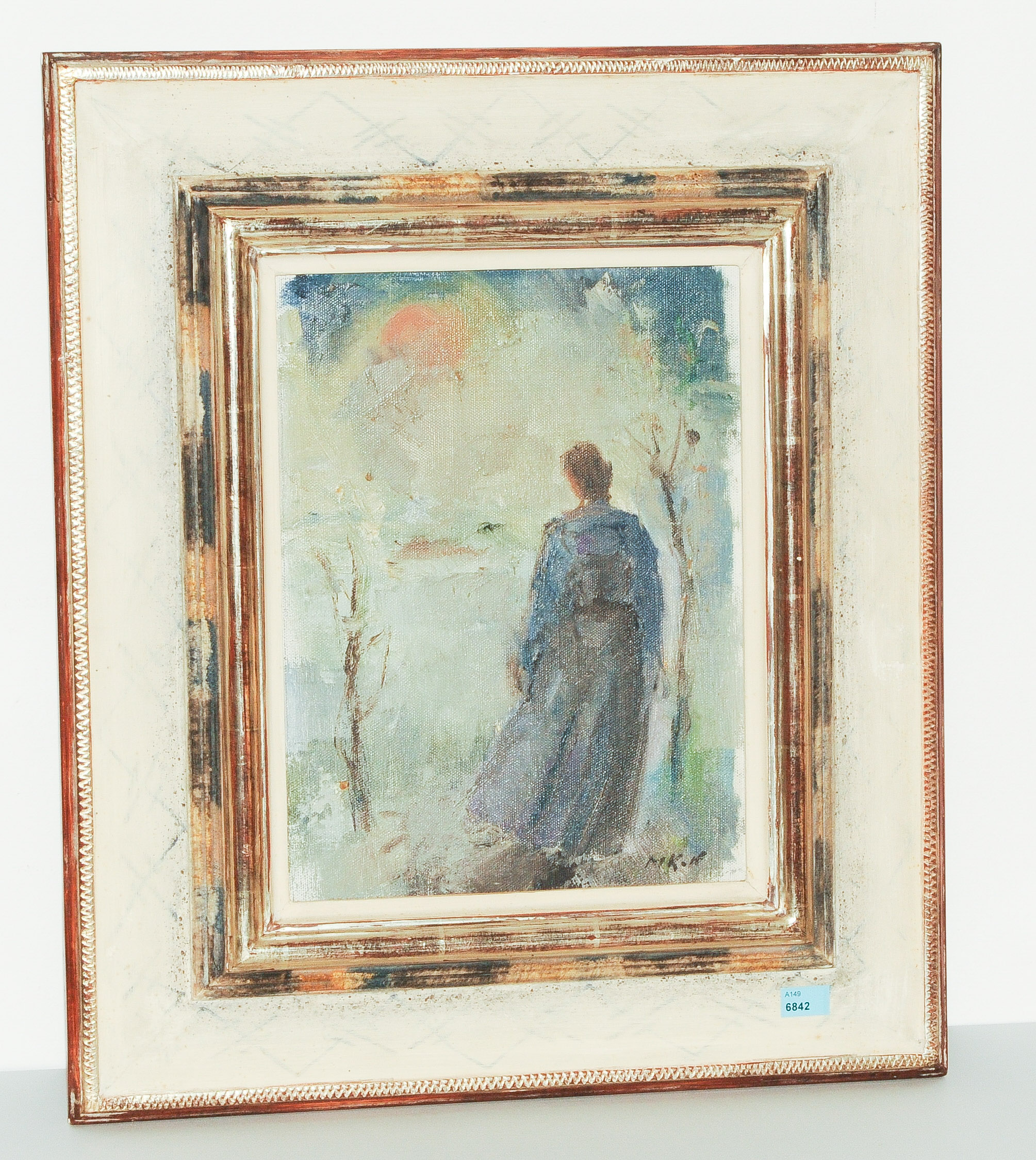 Junge Frau vor Sonnenuntergang. Öl auf Leinwand über Karton. Unten rechts monogrammiert. 31x23,5 cm.