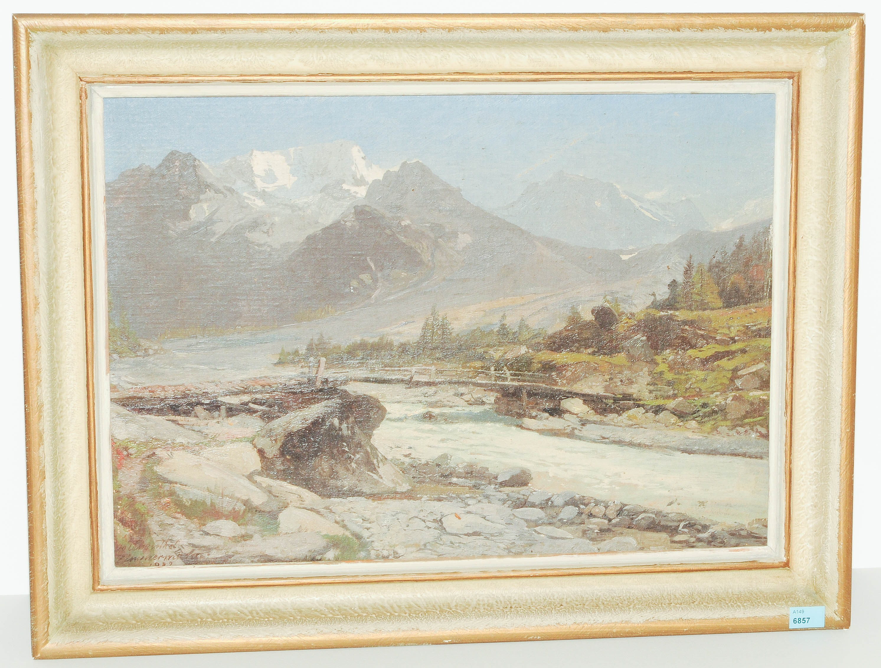 Alpine Landschaft mit Wildbach, 1882. Öl auf Leinwand. Unten links signiert, datiert und unleserlich bezeichnet. 33x46,5 cm.
