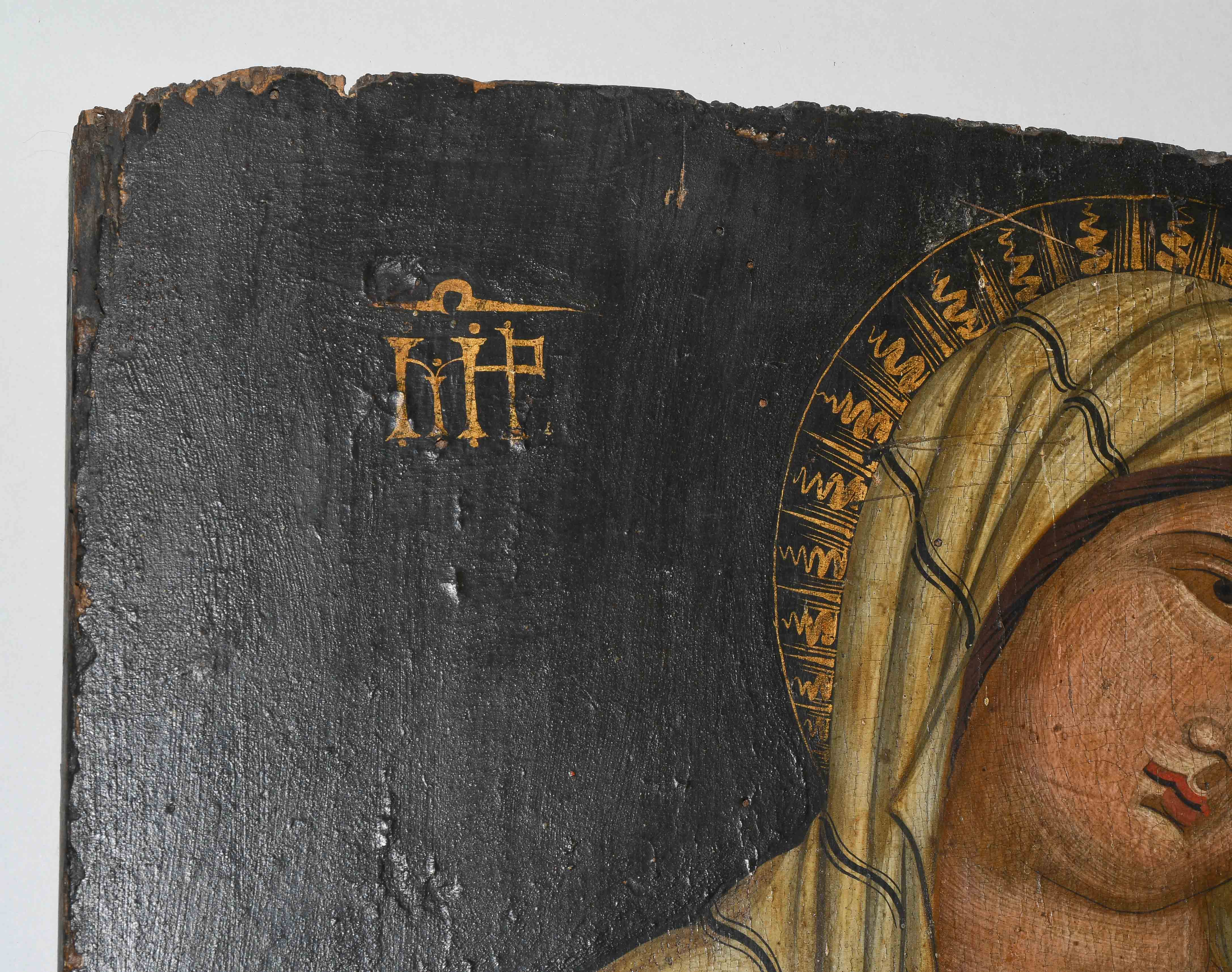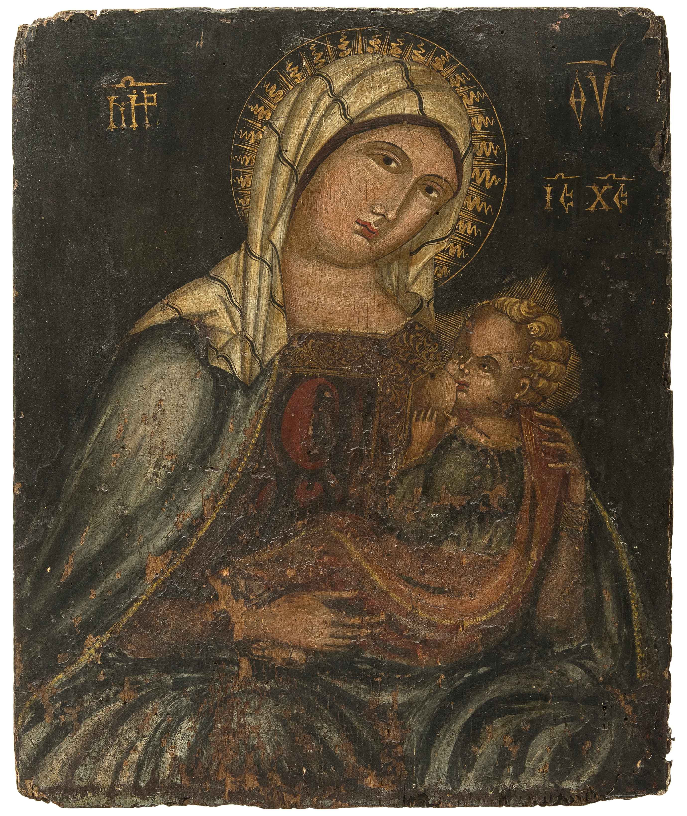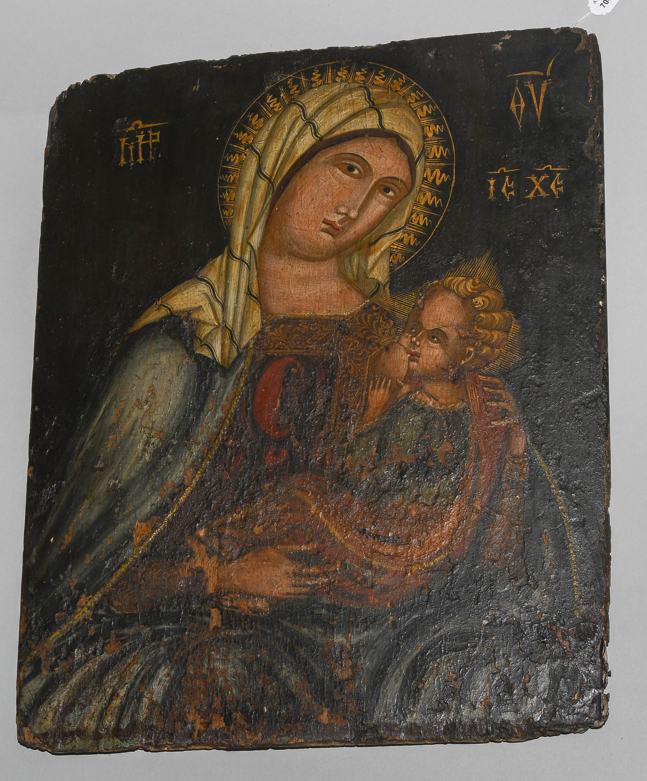 Rumänien, 18.Jh. Tempera über Kreidegrund auf Holz. Vor dunklem Grund Darstellung der Gottesmutter, das Kind in ihrem rechten Arm säugend. 47x39 cm.