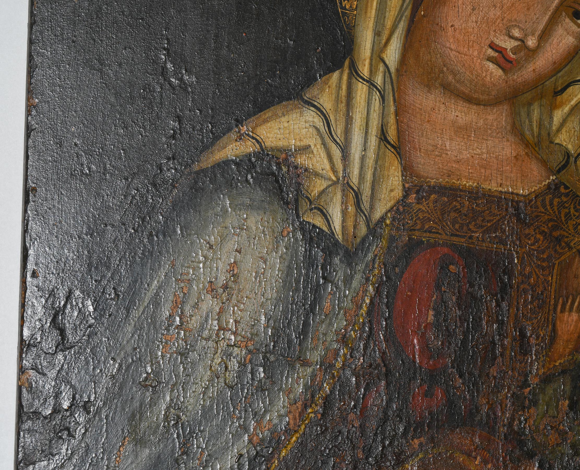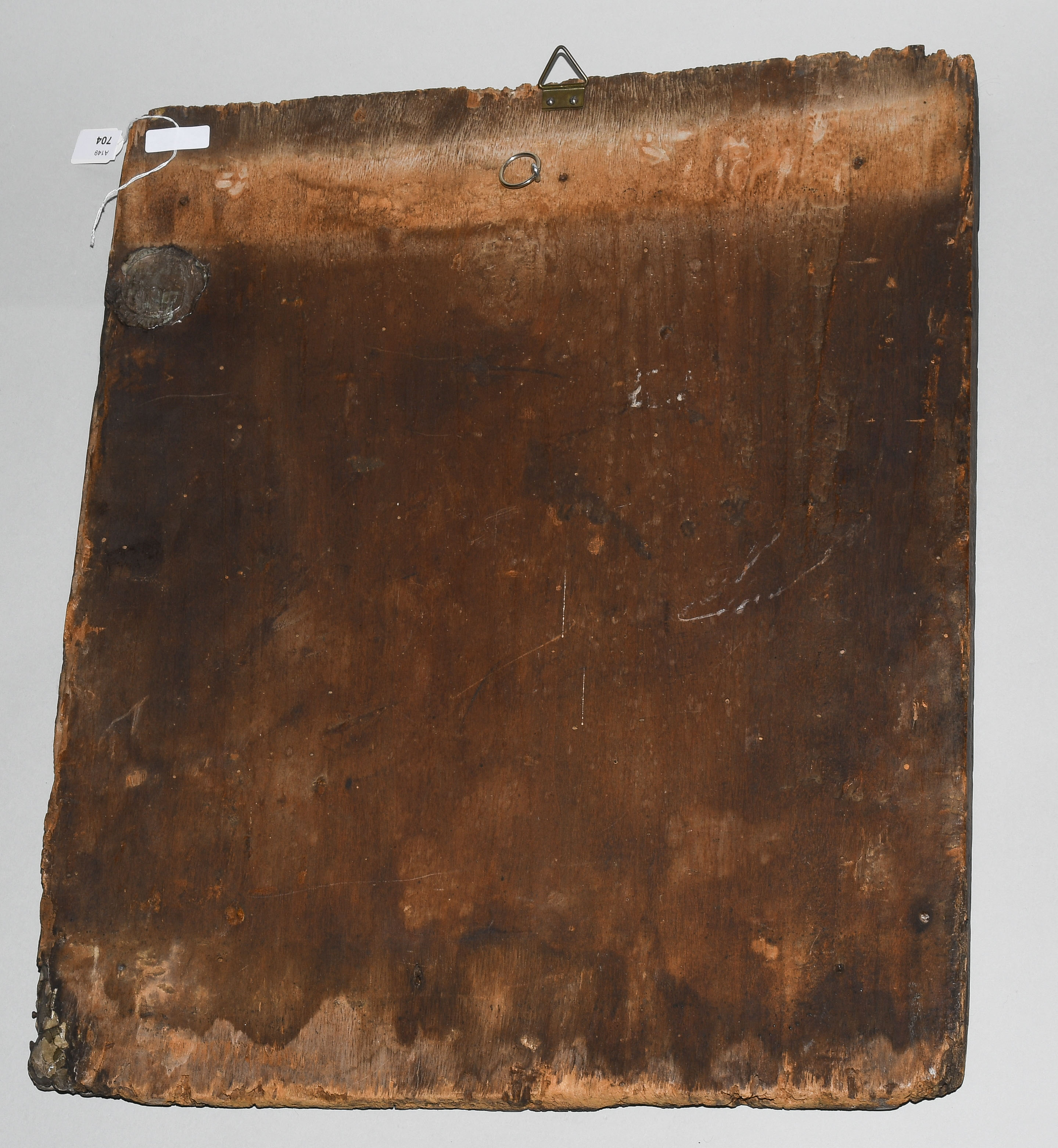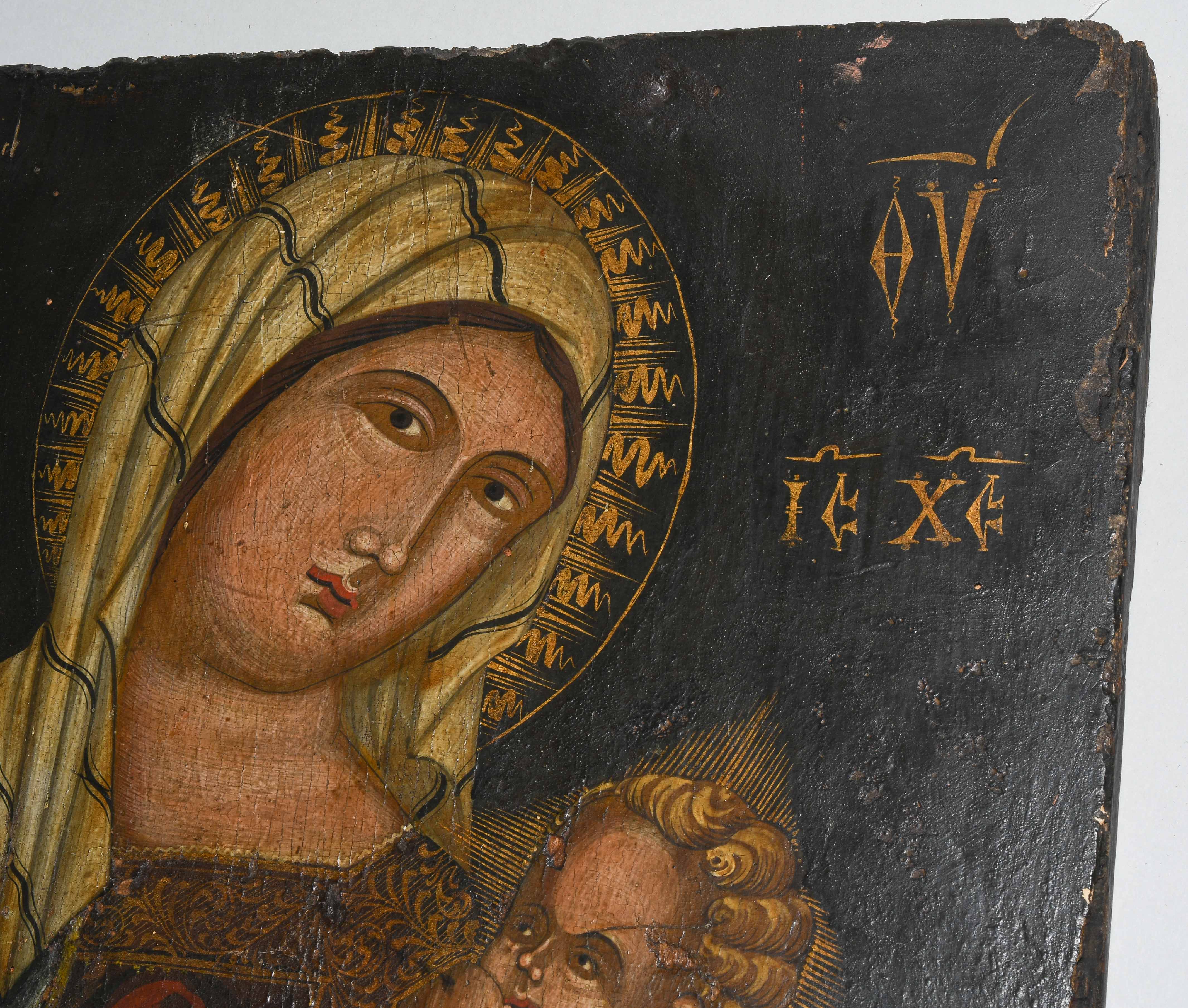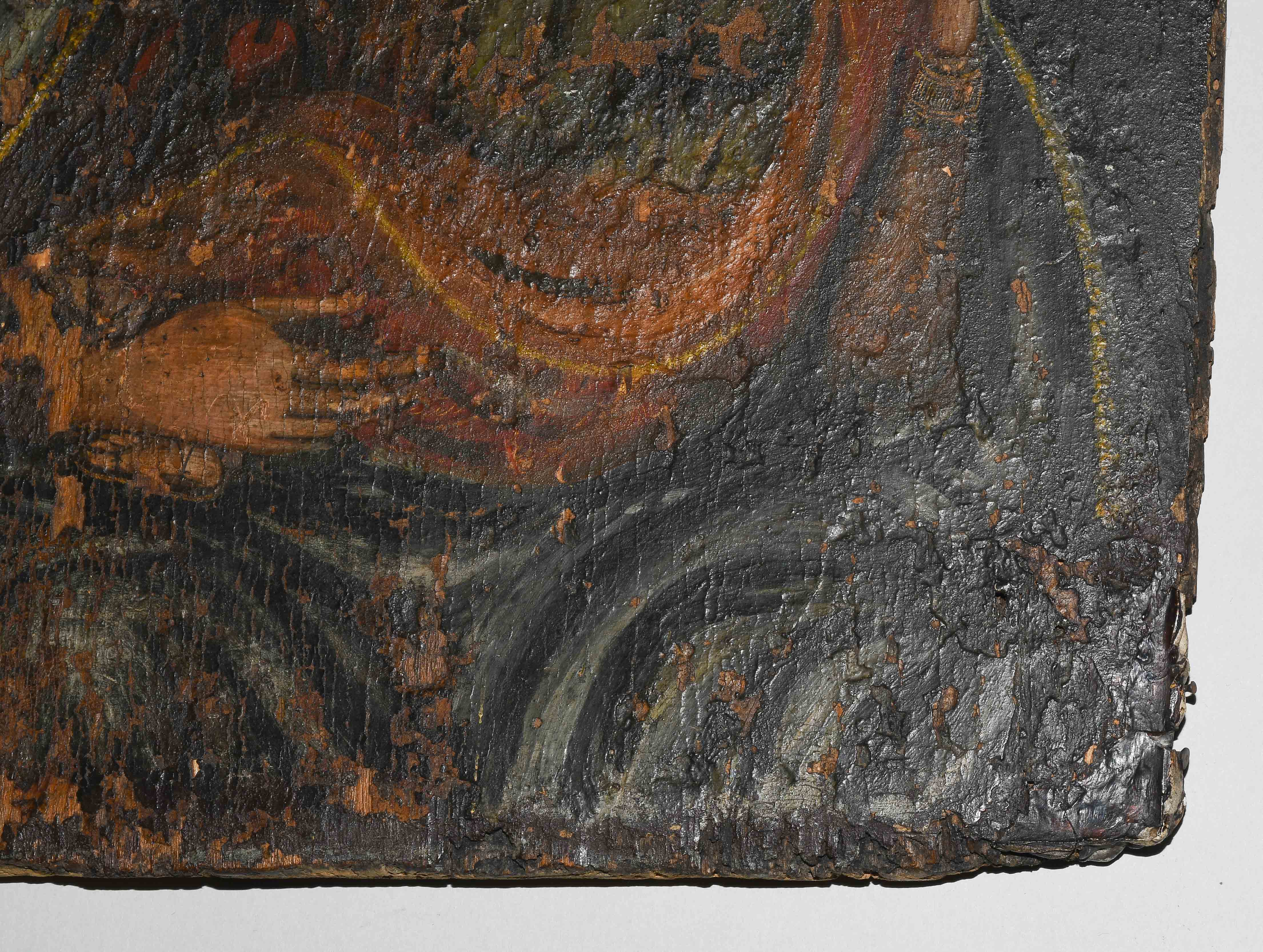 Rumänien, 18.Jh. Tempera über Kreidegrund auf Holz. Vor dunklem Grund Darstellung der Gottesmutter, das Kind in ihrem rechten Arm säugend. 47x39 cm.