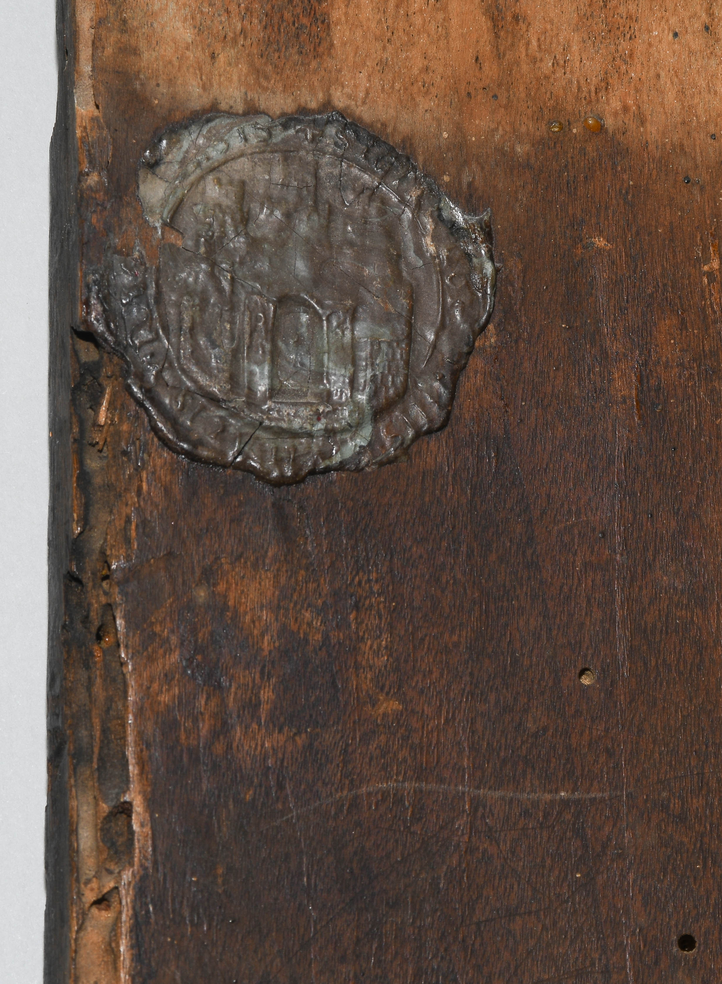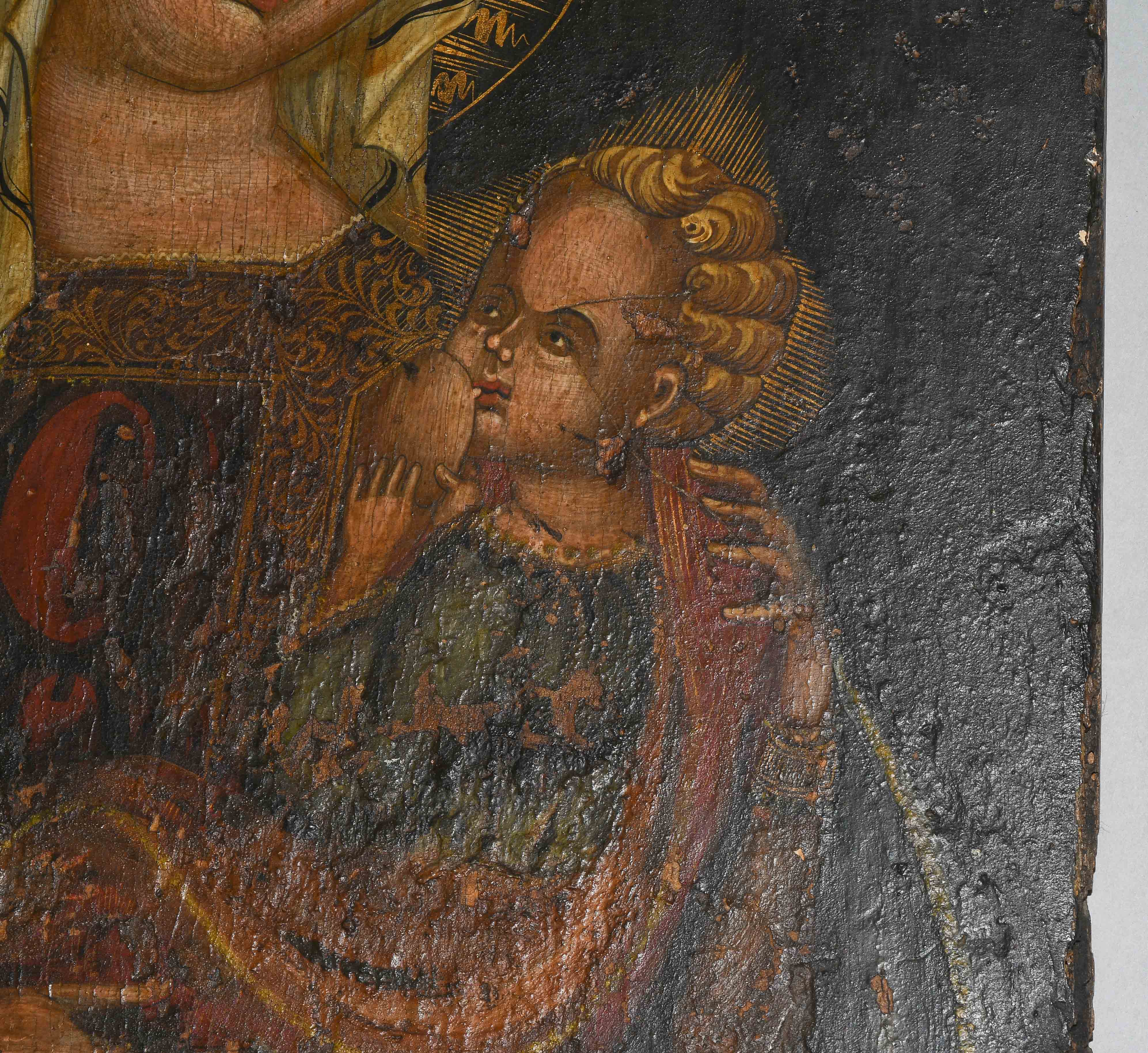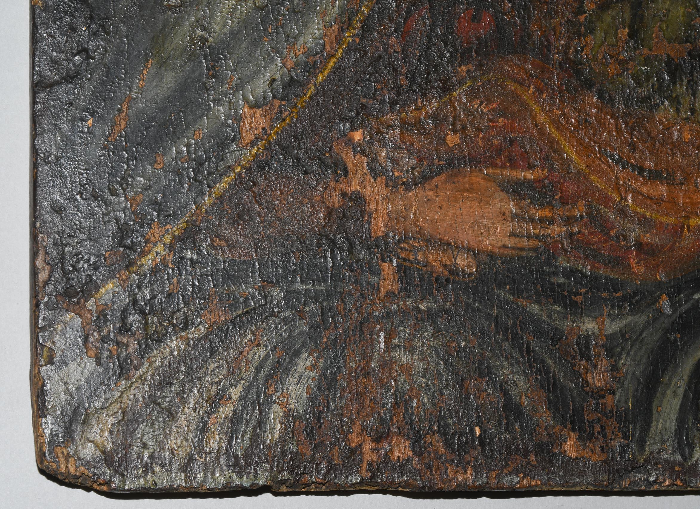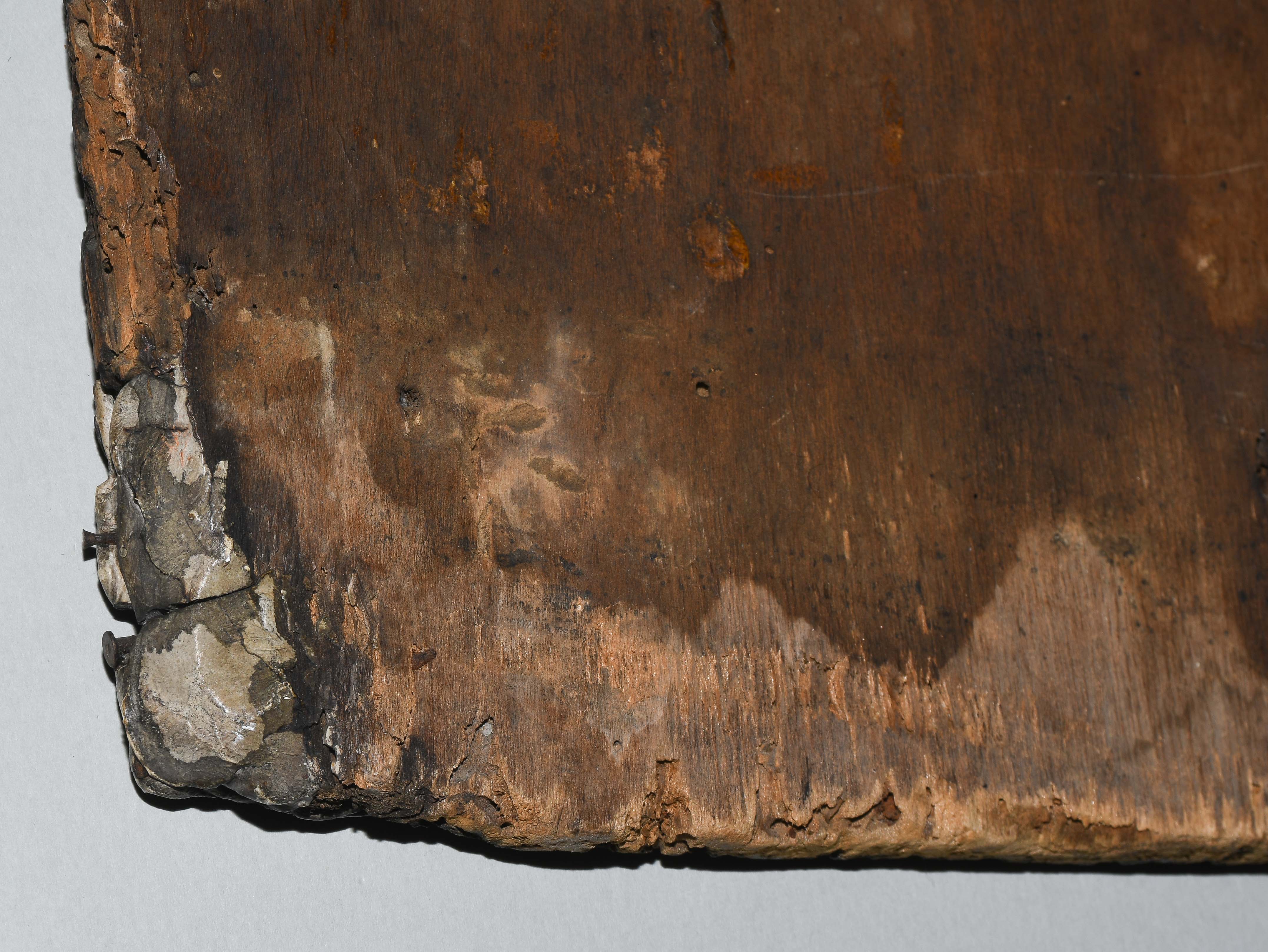- In den unteren 2 Bilddritteln Schad- und Fehlstellen sowie Retouchen. Insektengänge, v.a. randlich mit kleinem Substanzverlust.