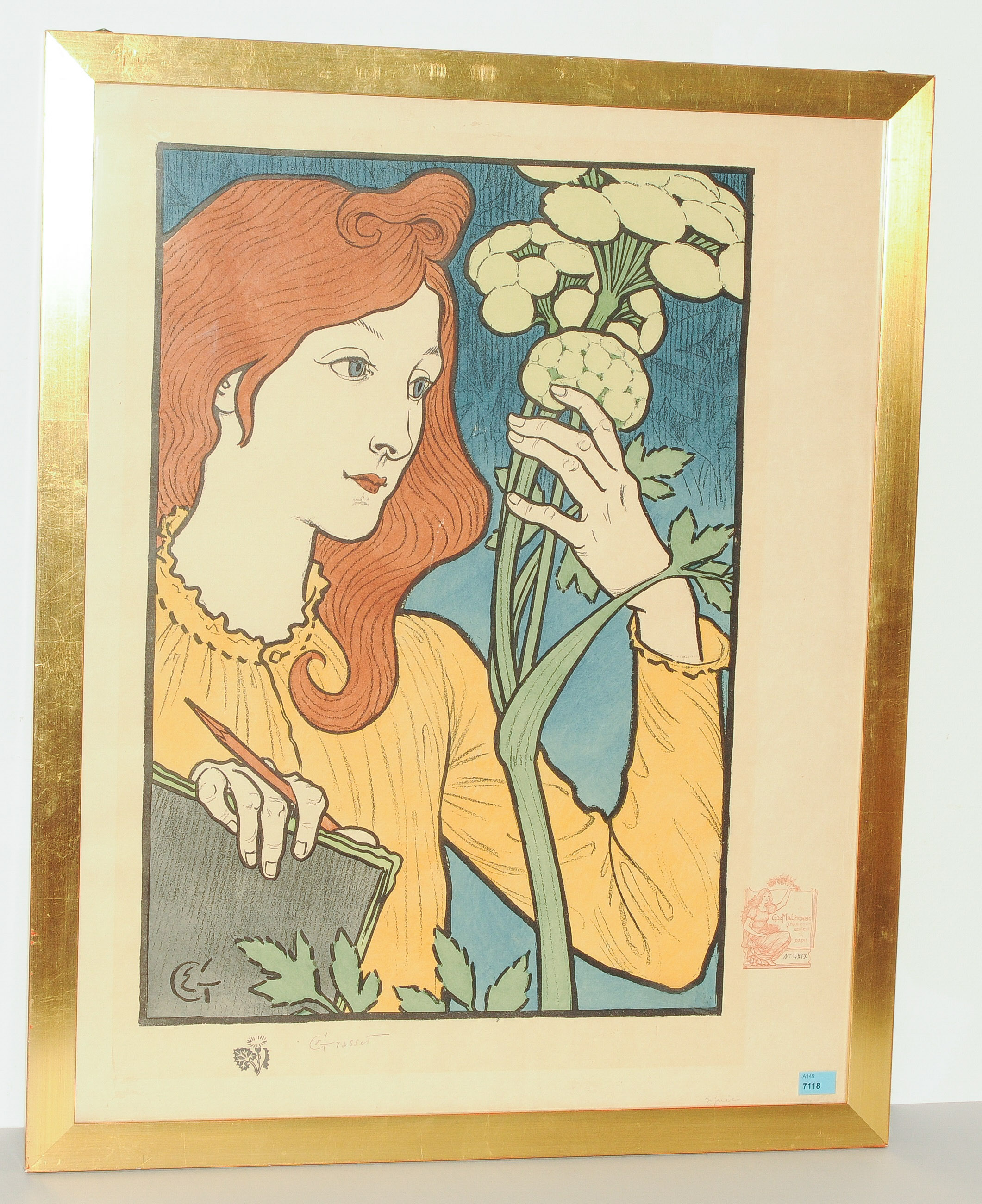 "Salon des Cent". Farbchromolithographie vor dem Text. Unten mittig signiert. Unten links im Druck monogrammiert. Unten rechts bezeichnet: "G. de Malherbe Imprimeur, Paris". Lichtmass 62x49 cm. Gerahmt.