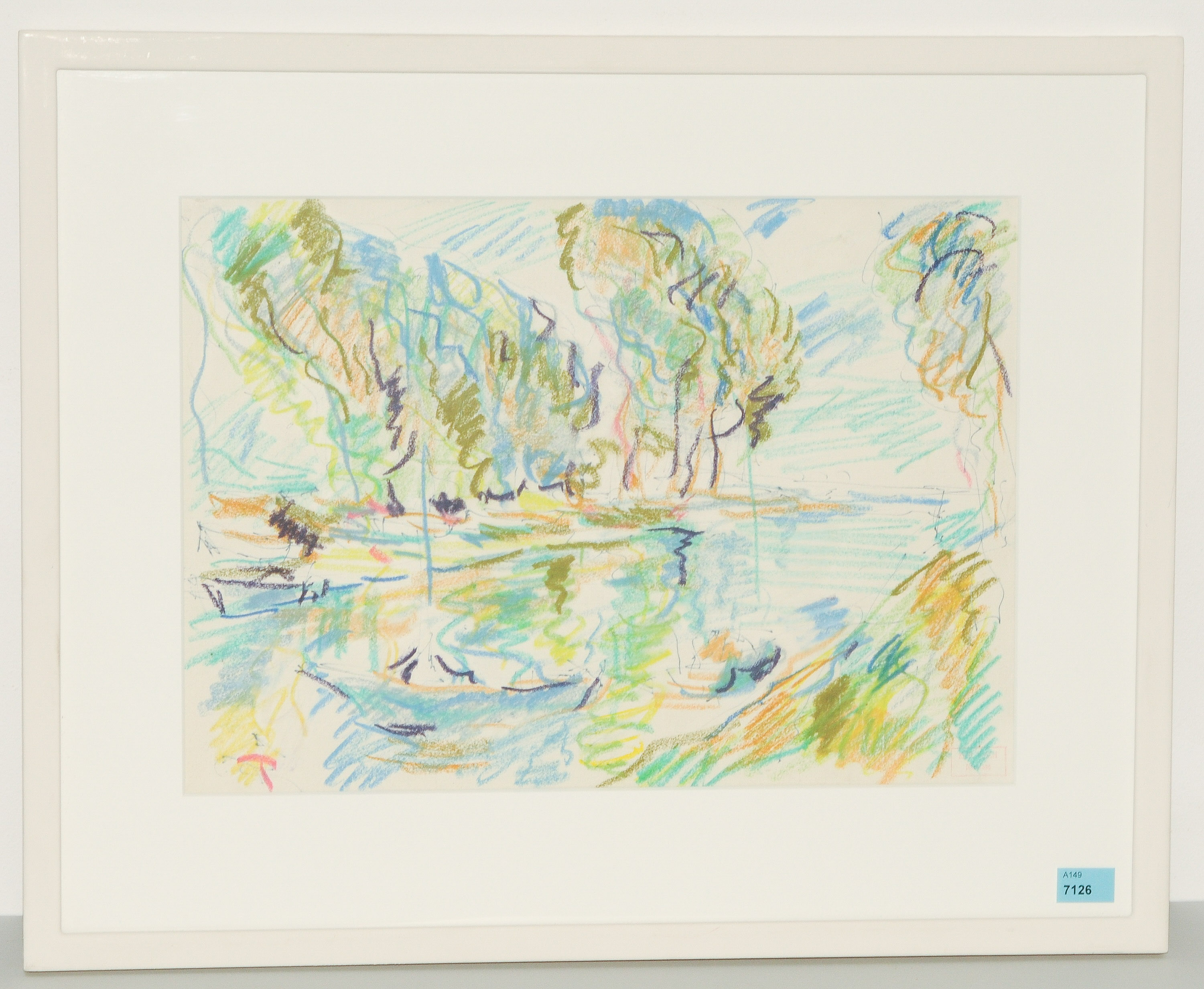 Flusslandschaft. Mischtechnik auf Papier. Unten rechts mit Nachlassstempel. Lichtmass 24,5x35 cm. Gerahmt.