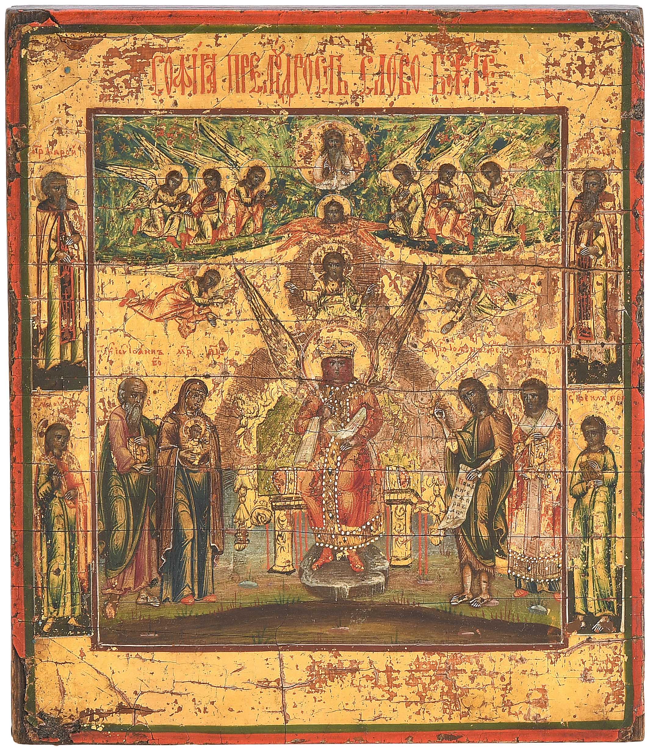 Russisch, 1.Hälfte 19.Jh. Tempera über Kreidegrund auf Holz. Auf Goldgrund Darstellung der thronenden Hl. Sophia, flankiert von der Gottesmutter des Zeichens und Johannes d. Evangelist (links) bzw. von Johannes d. Vorläufer und Johannes Chrysostomos (rechts). Über der Szene erscheint Christus Pantokrator, begleitet von 2 Engeln. In der Mitte des oberen Bildrands Gottvater vor Aureole, verehrt von 6 adorierenden Engeln. 4 Randheilige: (links) Hl. Maron und Heiliger (Titulus unvollständig) bzw. (rechts) Hl. Paisij und Hl. Thekla. 18x15,5 cm.