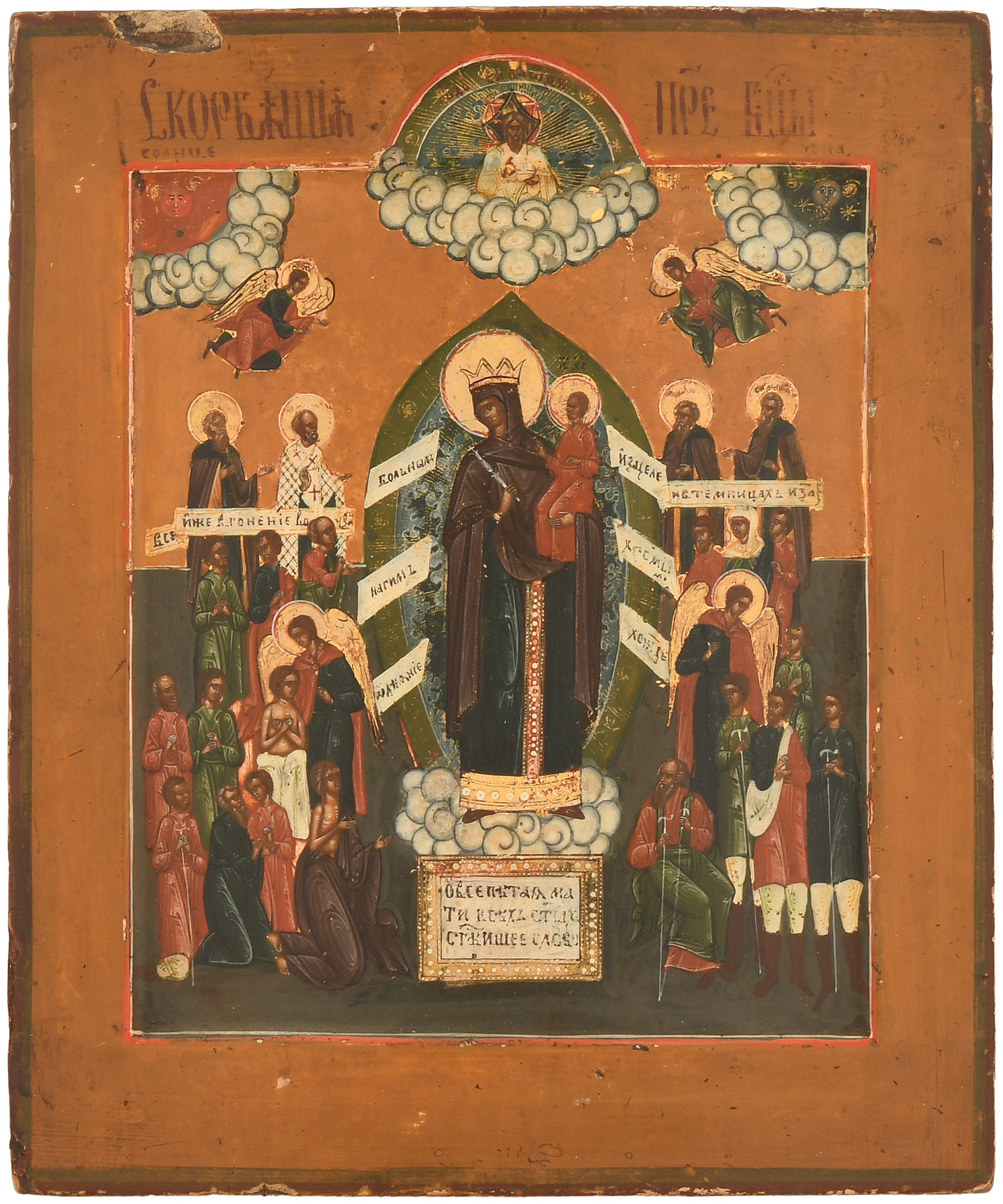 Russisch, Mitte 19.Jh. Tempera über Kreidegrund auf Holz. Im Zentrum des vertieften Mittelfelds vor Mandorla auf Wolkensockel stehende Gottesmutter mit Kind. 2 Engel führen Bedürftige heran, deren Bitten auf Schriftrollen festgehalten sind. In der Mitte des oberen Bildrands erscheint Gottvater über Wolkenband. 26x21,5 cm.