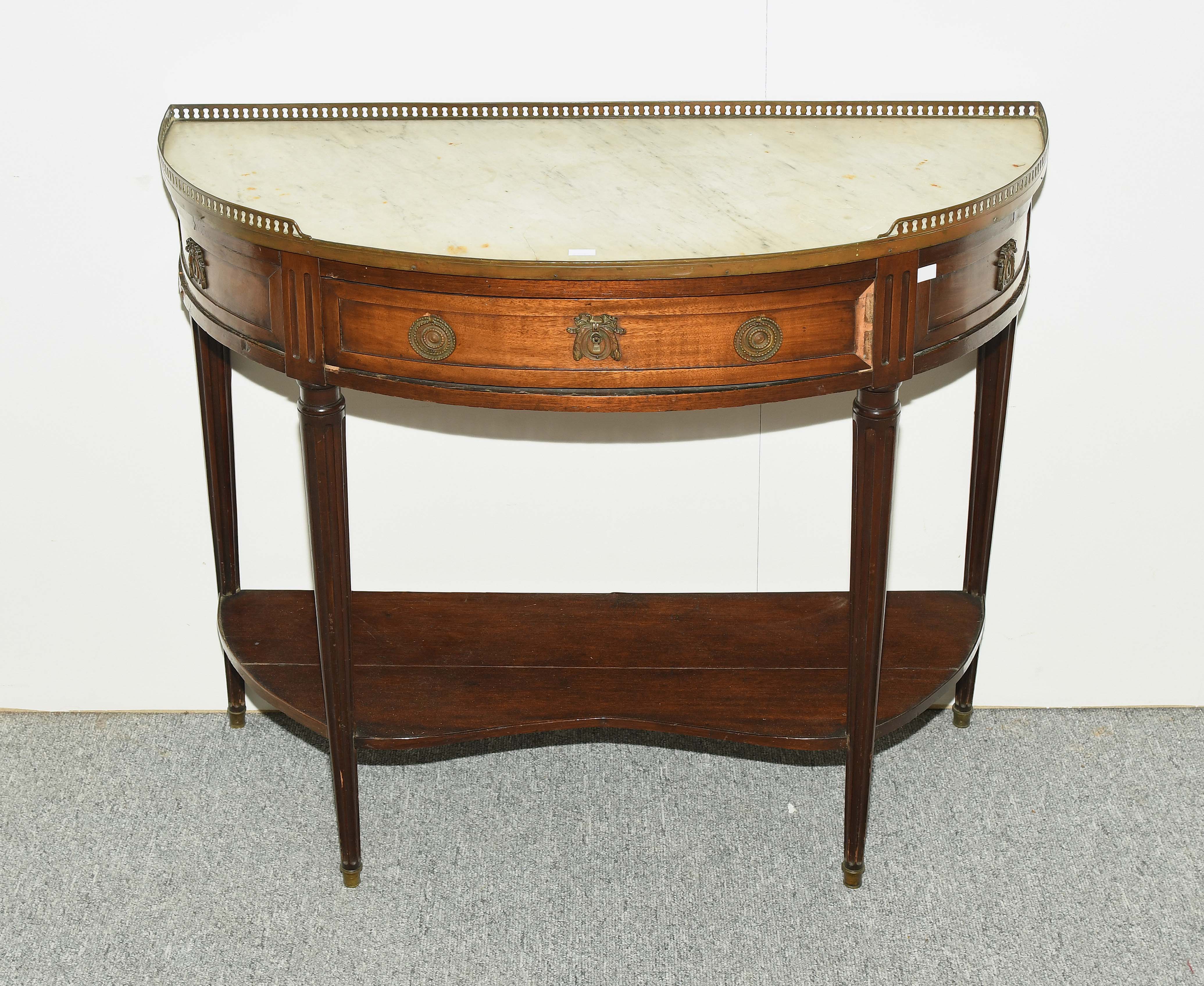 Louis XVI-Stil 19/20. Jh. Mahagoni, Marmor. Halbrundes Gestell auf hohen konischen Beinen, zentrale Schublade, weisse Marmorplatte mit Messingumrandung. Gebrauchsspuren. 97x44x84 cm.