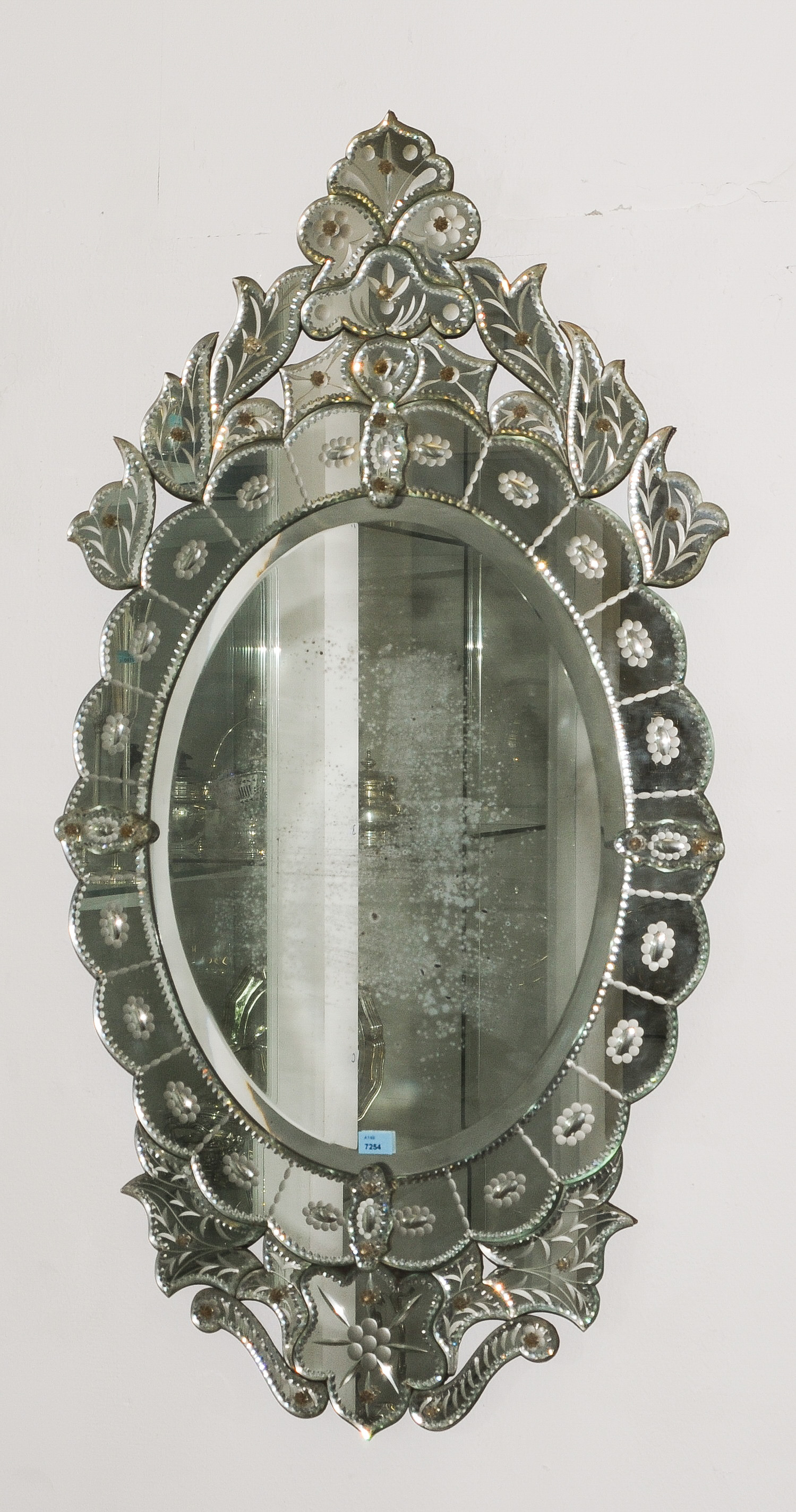 Barock-Stil 20. Jh. Holz, Glas. Ovaler Rahmen mit verspiegelten Kartuschen mit geätztem Dekor gearbeitet. Gebrauchsspuren. 50x95 cm.