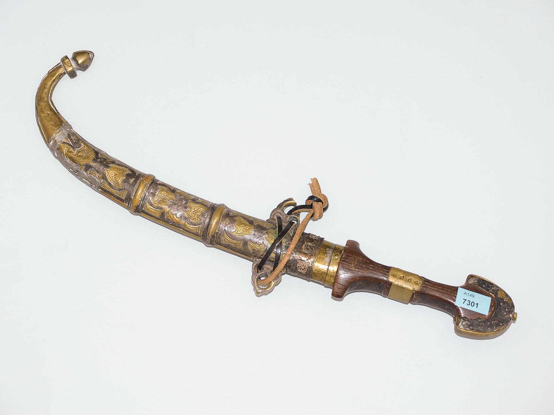 Marokko, um 1900. Holzgriff mit Messingverzierungen. Gekrümmte, Rückenklinge. ortwärts zweischneidig. Ziseliserte Messingscheide mit mit silbernem Dekor. L ca. 41