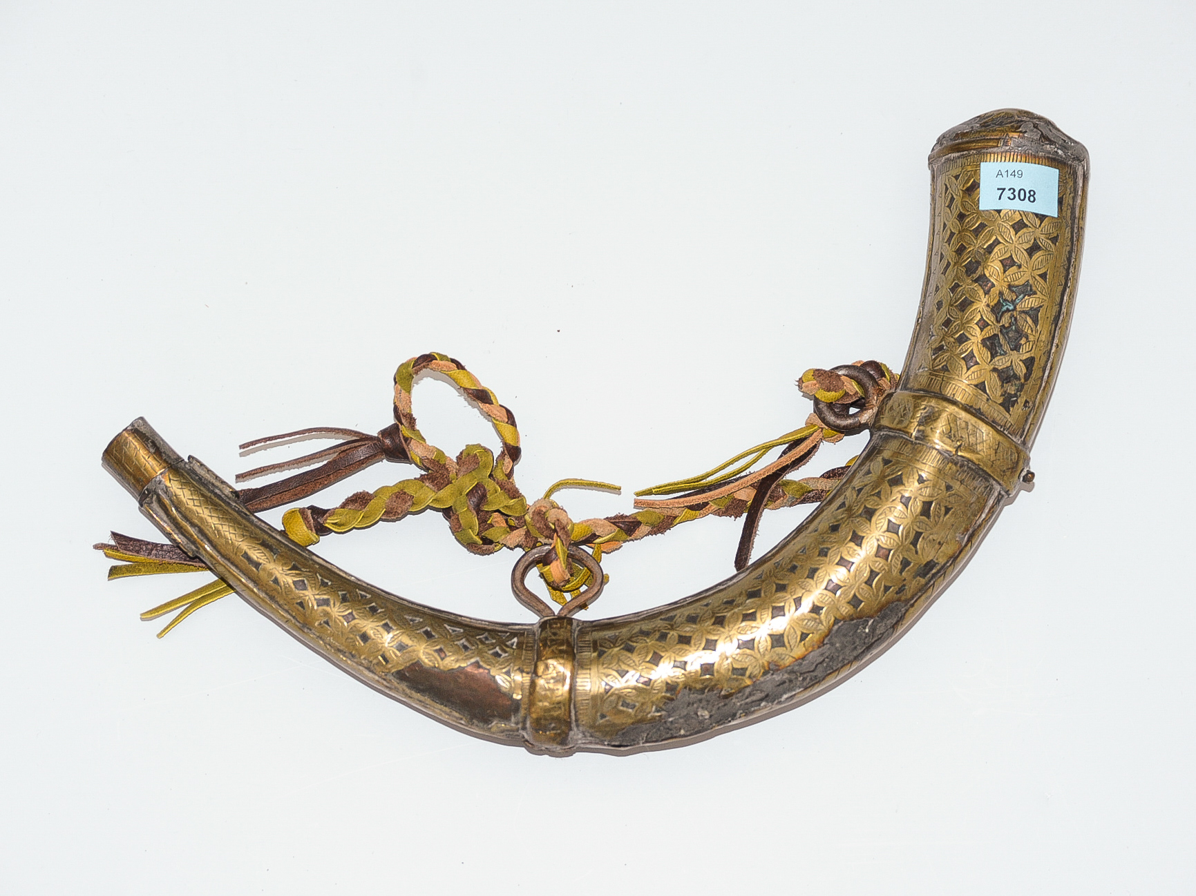 Marokko, 19.Jh.. Kupferhorn, überzogen mit einem durchbrochen gearbeitetes Messinggitterwerk. Fehlstellen. L ca. 35