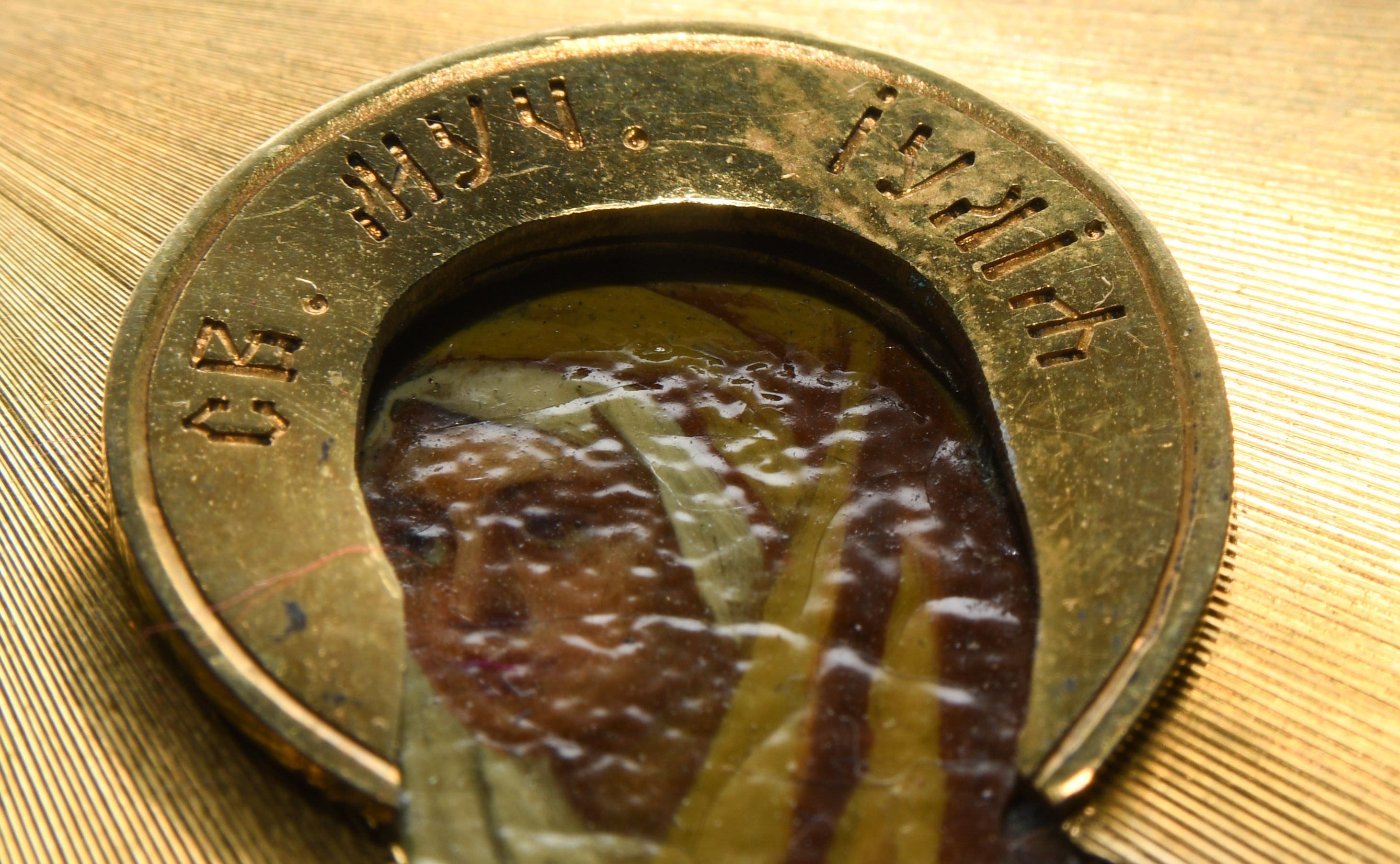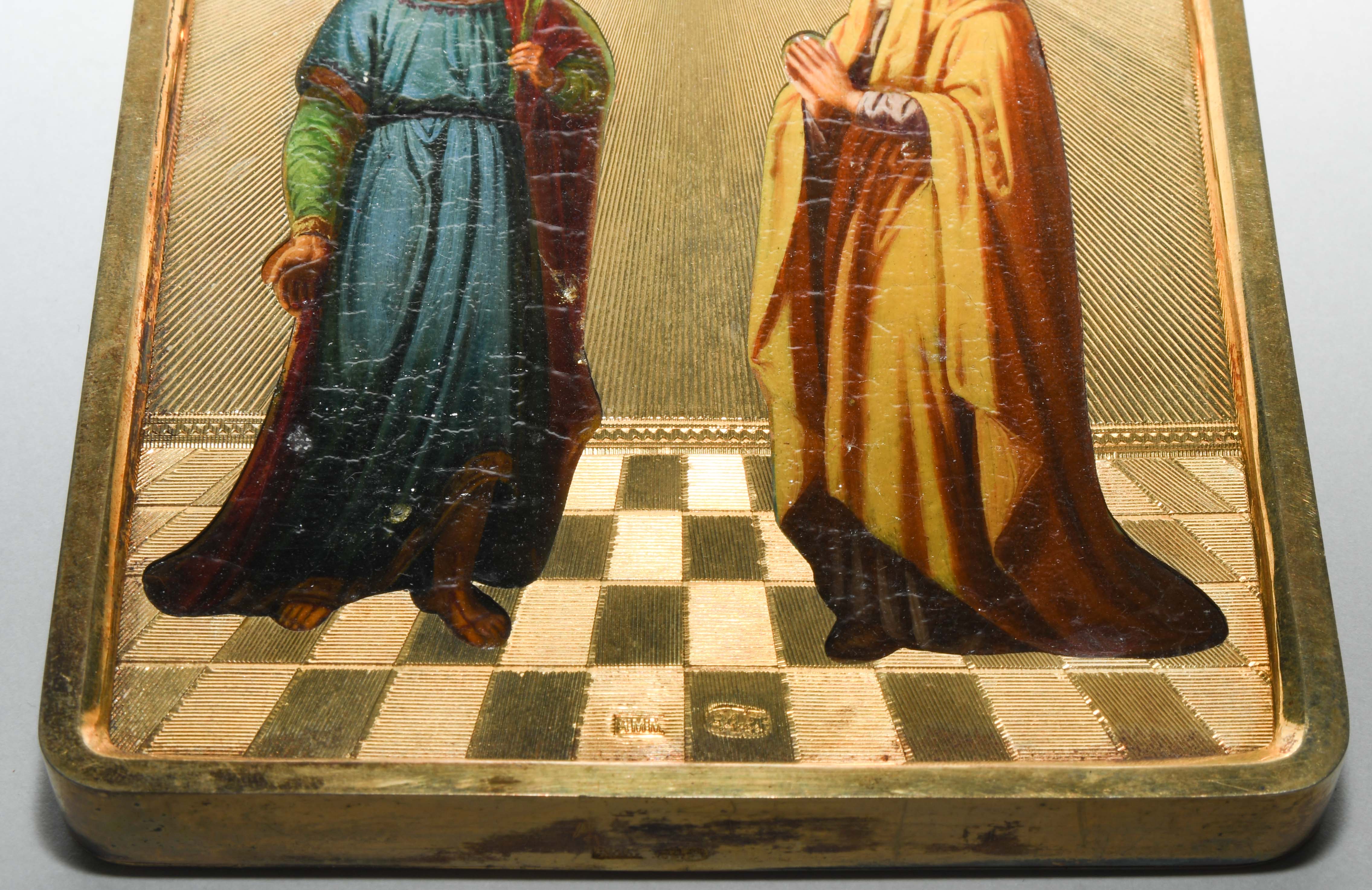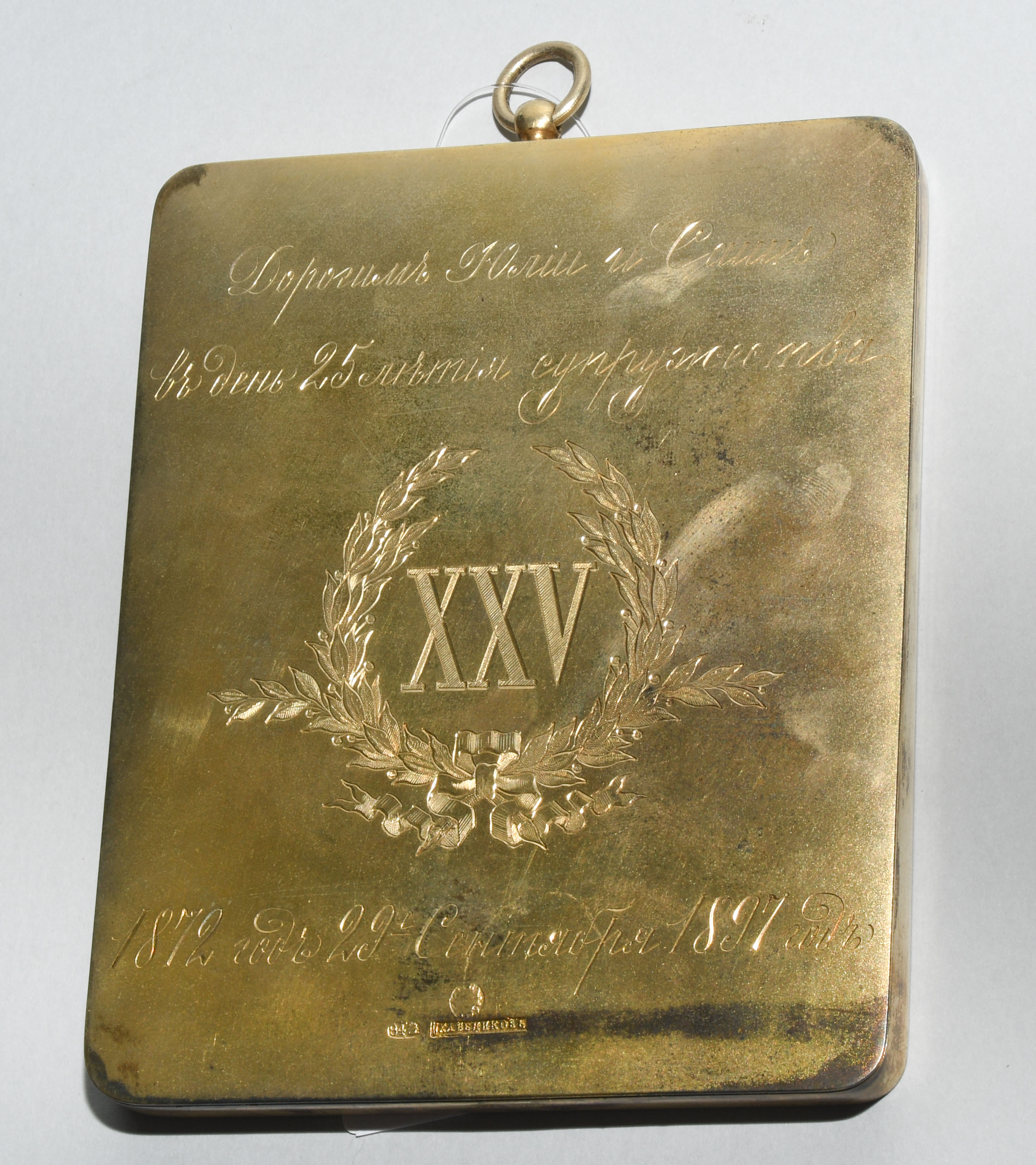 Russisch, datiert 1897. (1) Ikone. Tempera über Kreidegrund auf Holz. Ganzfiguren der hll. Märtyrer Alexander und Julia. (2). Oklad bestehend aus 2 Teilen (Vorder- und Rückseite). Silber, vergoldet. Stadtmarke von Moskau. Recto Marke "AMM" (kyrill.) eines unbekannten Meisters (Anfang 20.Jh.). Verso Marke des Iwan Petrowitsch Chlebnikow (Besitzer einer Silberwaren-Fabrik, 1870–1917). Recto feinste Strahlengravuren und Schachbrettmuster im Vordergrund. Rückseitig Inschrift: "Der lieben Julia und Sasha am Tag der Silbernen Hochzeit, 1872 Jahr, 29. September, 1897 Jahr" sowie röm. Zahl "XXV" umgeben von Lorbeerkranz. Mit Aufhängeöse. 12,5x10 cm.