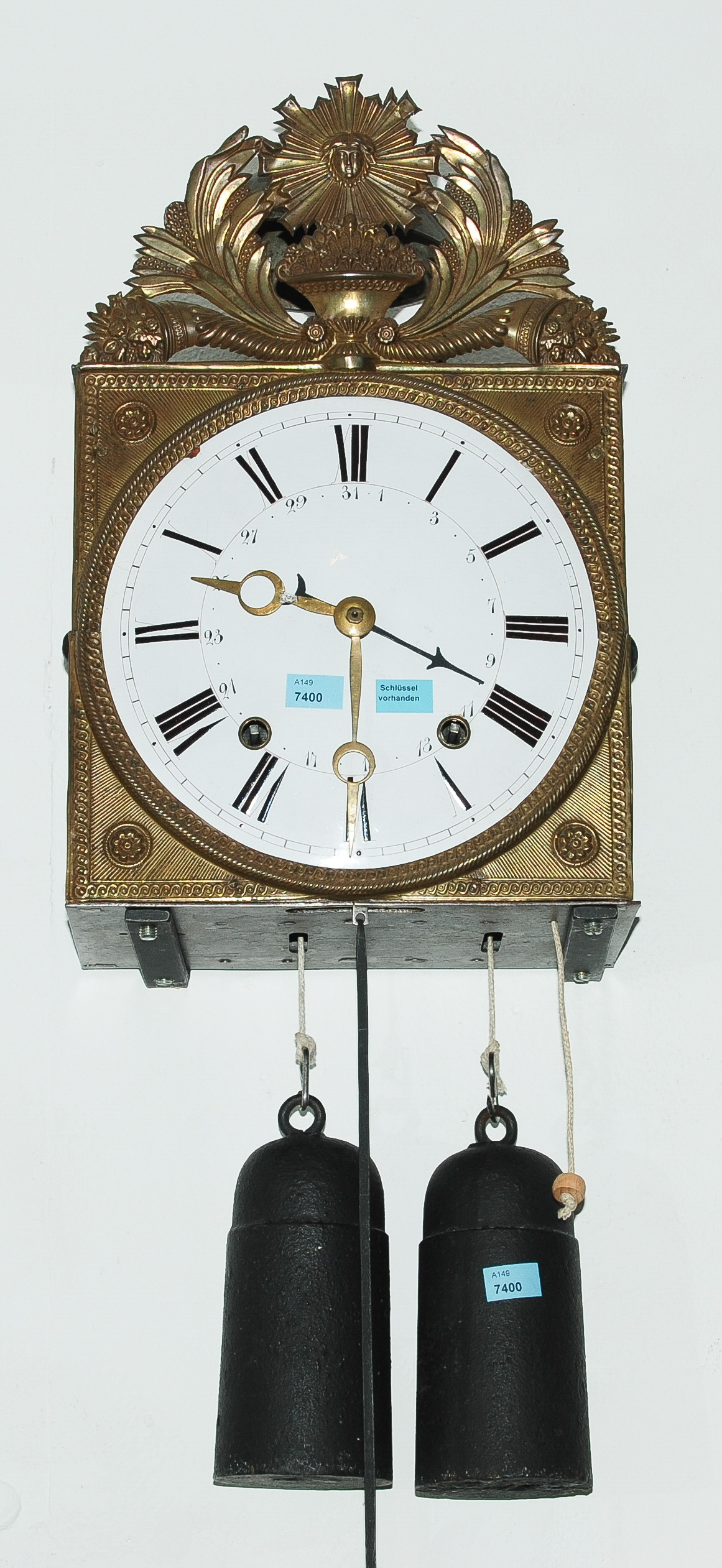 Frankreich, 1.Hälfte 19.Jh. Eisengehäuse mit Seitentürchen. Messingfront mit Sonne und Füllhörnern. Emailzifferblatt mit römischen Stundenzahlen und arabischer Datumsanzeige. Kleine Beschädigung bei 11Uhr. Breguet Zeiger. Stundenzeiger gelötet. Ankerwerk mit Halbstunden- und repetierendem Stundenschlag auf Glocke. Faltpendel. Datumsfunktion. Gehfähig. 38x25 cm. Wandhalterung und Schlüssel vorhanden.