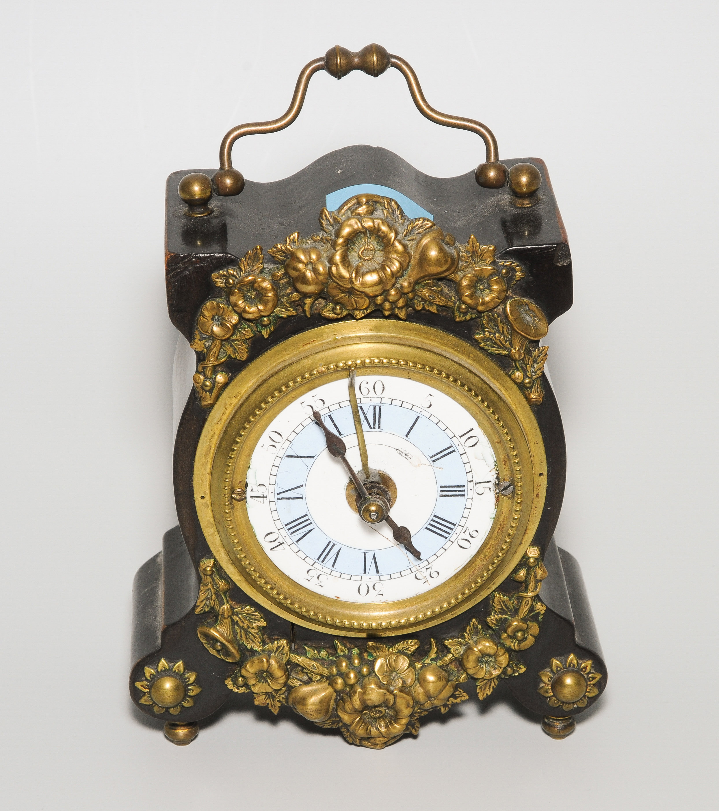 Frankreich, 19.Jh. Schwarzes, geschweiftes Holzgehäuse mit Traggriff. An der Frontseite mit Bronzegussappliken versehen. In Messinglünette gefasstes, zweifarbiges Emailzifferblatt mit römischen Stundenzahlen auf blauem Grund und arabischen Minutenzahlen auf weissem Grund. Beschädigung bei 3 Uhr. Ankerwerk mit integriertem Hinterpendel. Weckerfunktion auf Glocke. Zu revidieren. 13x10 cm.