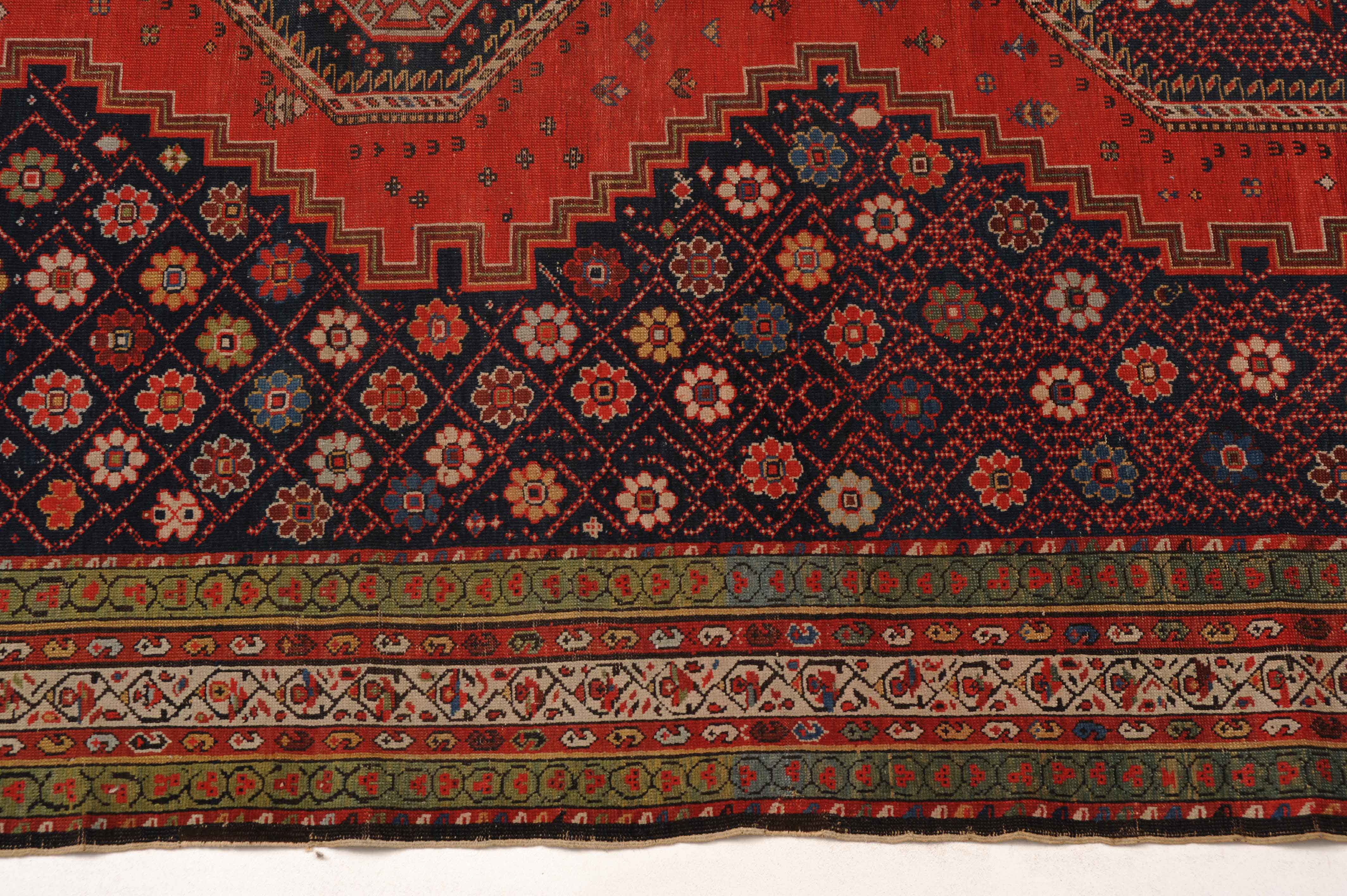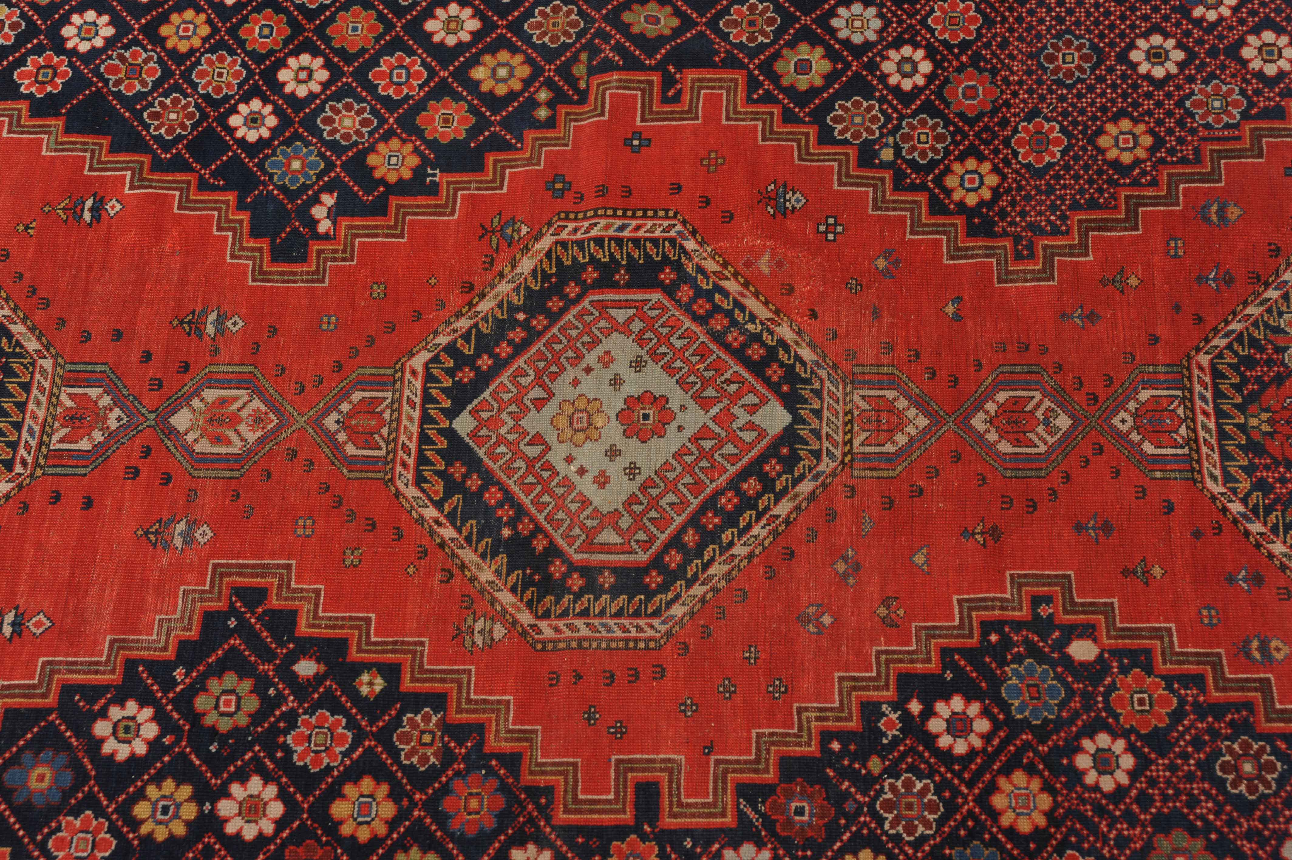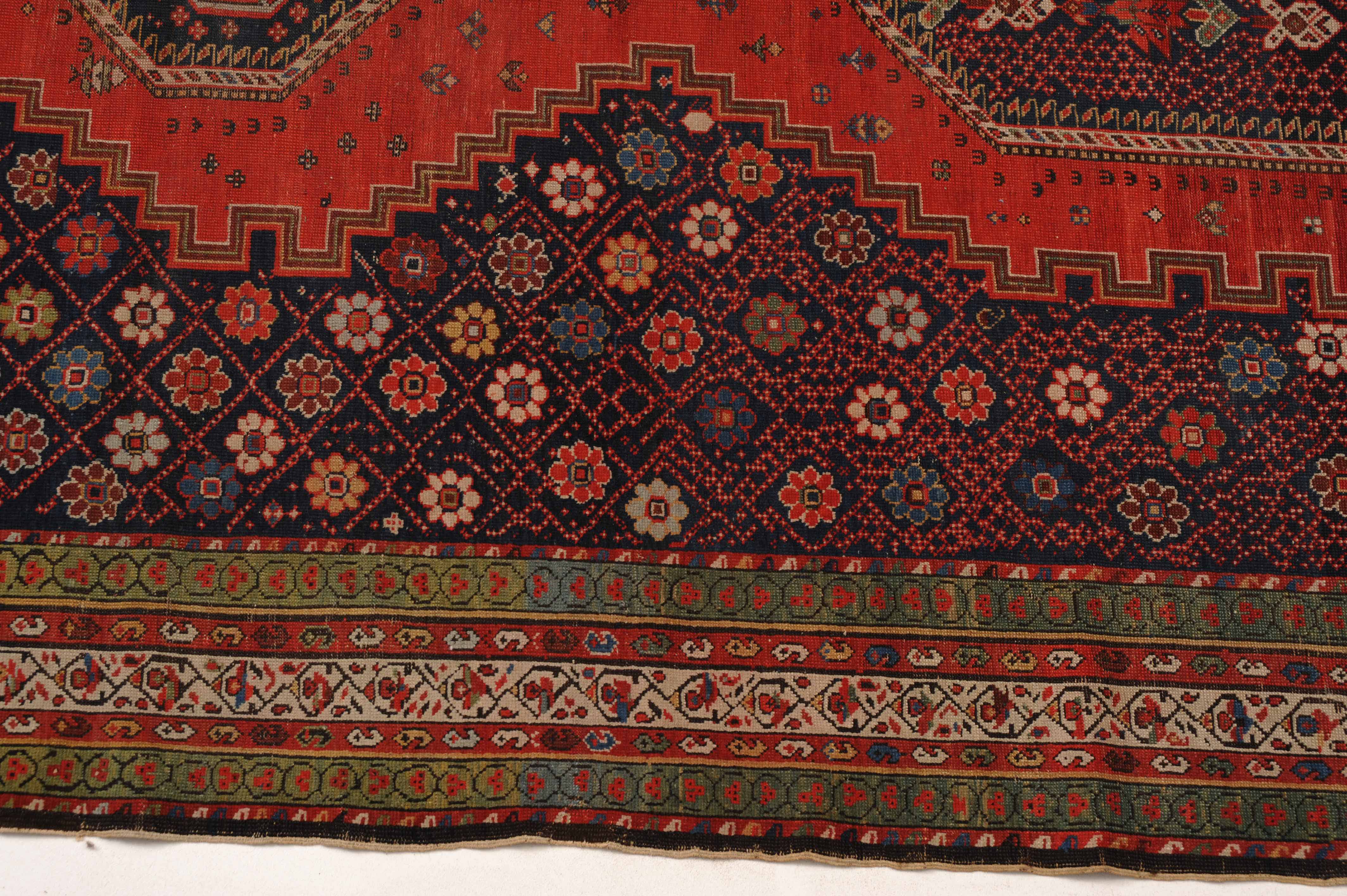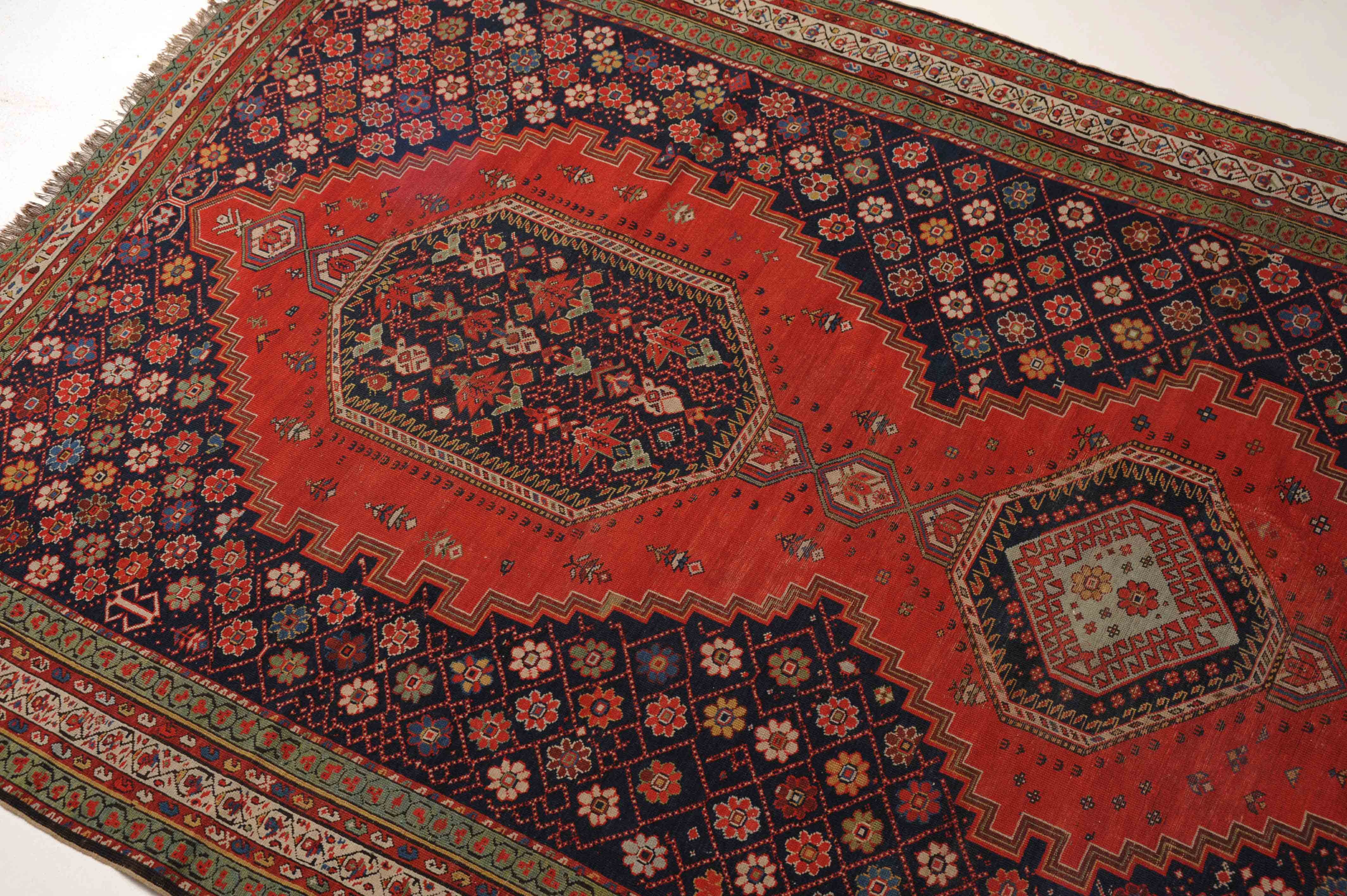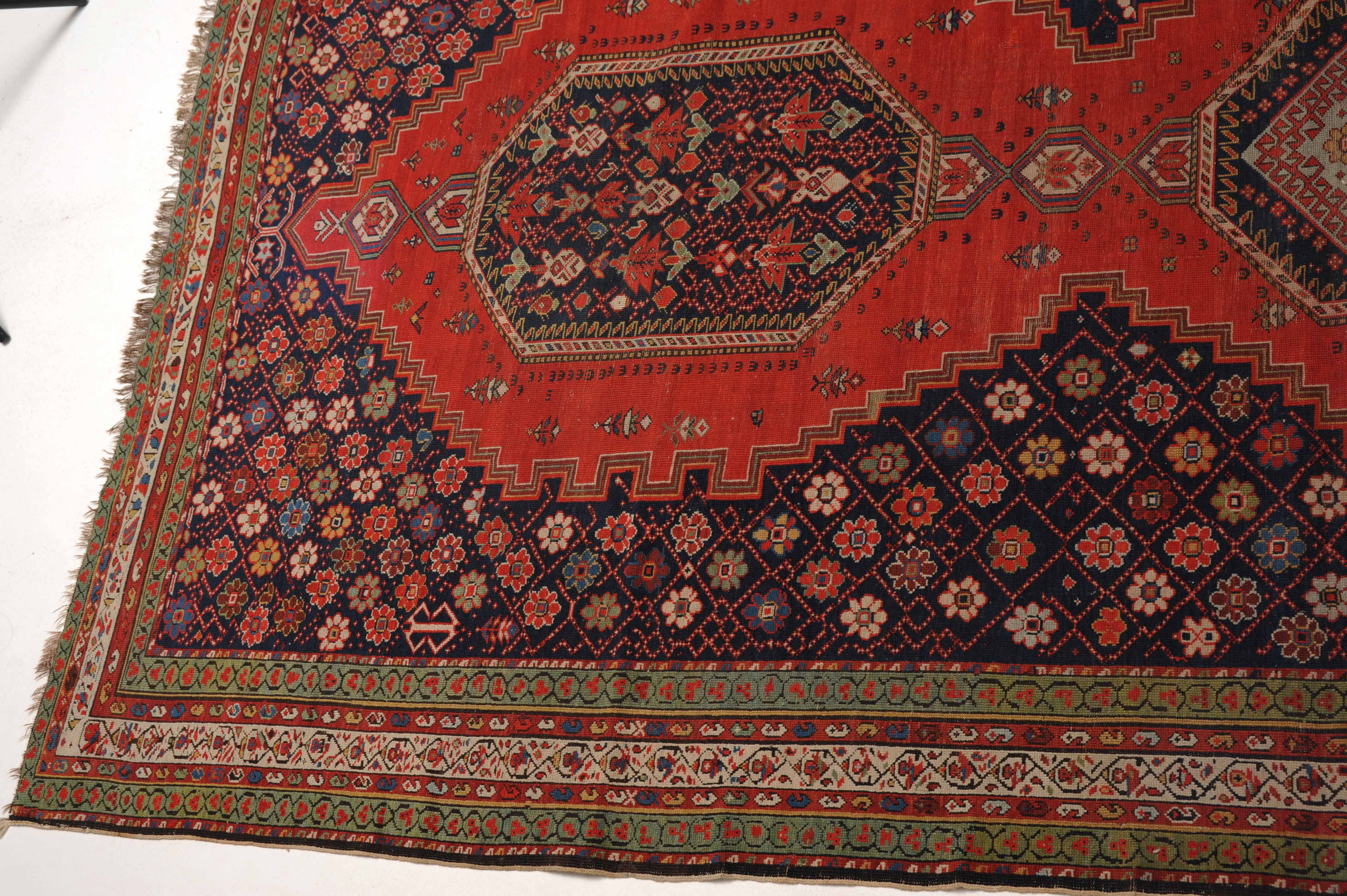 Z-Kaukasus, um 1910. Im roten Mittelfeld thronen 3 mit Blüten und Haken belegte Oktogone mit miteinander verbundenen Ausläufern, flankiert von dekorativen nachtblauen mit Rauten überzogenen Blüten-Eckzwickeln. Grüne Blüten- und rote Boteh-Göls-Borten umranden die weisse Wellenranken-Bordüre. Reparierte Stelle, ansonsten gute Erhaltung. 185x365 cm (ft. 6.1x12).