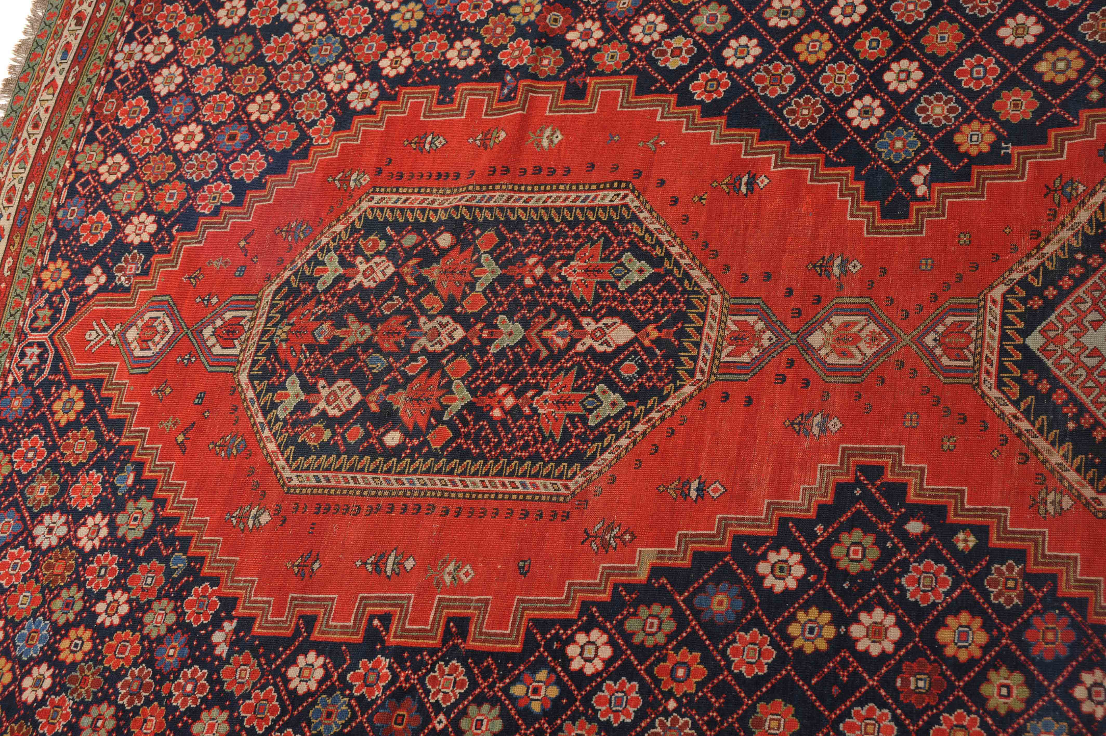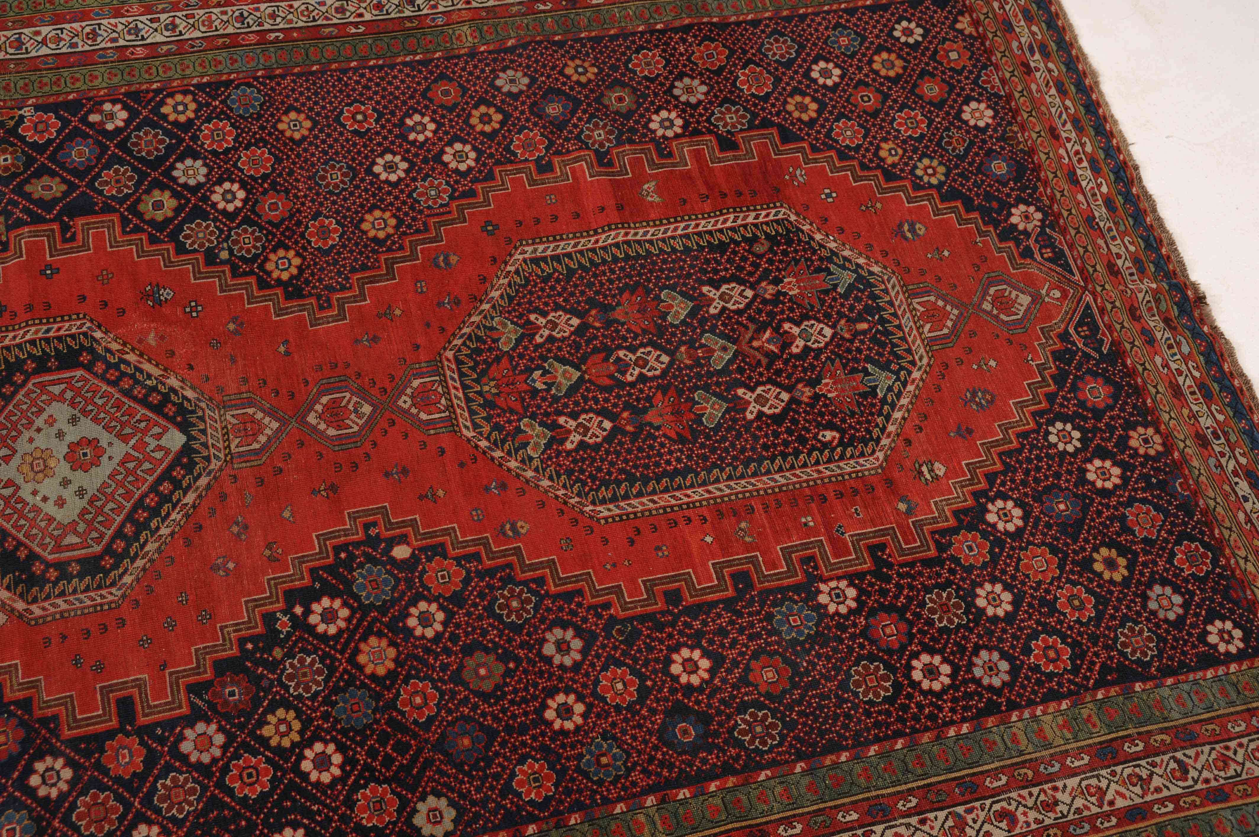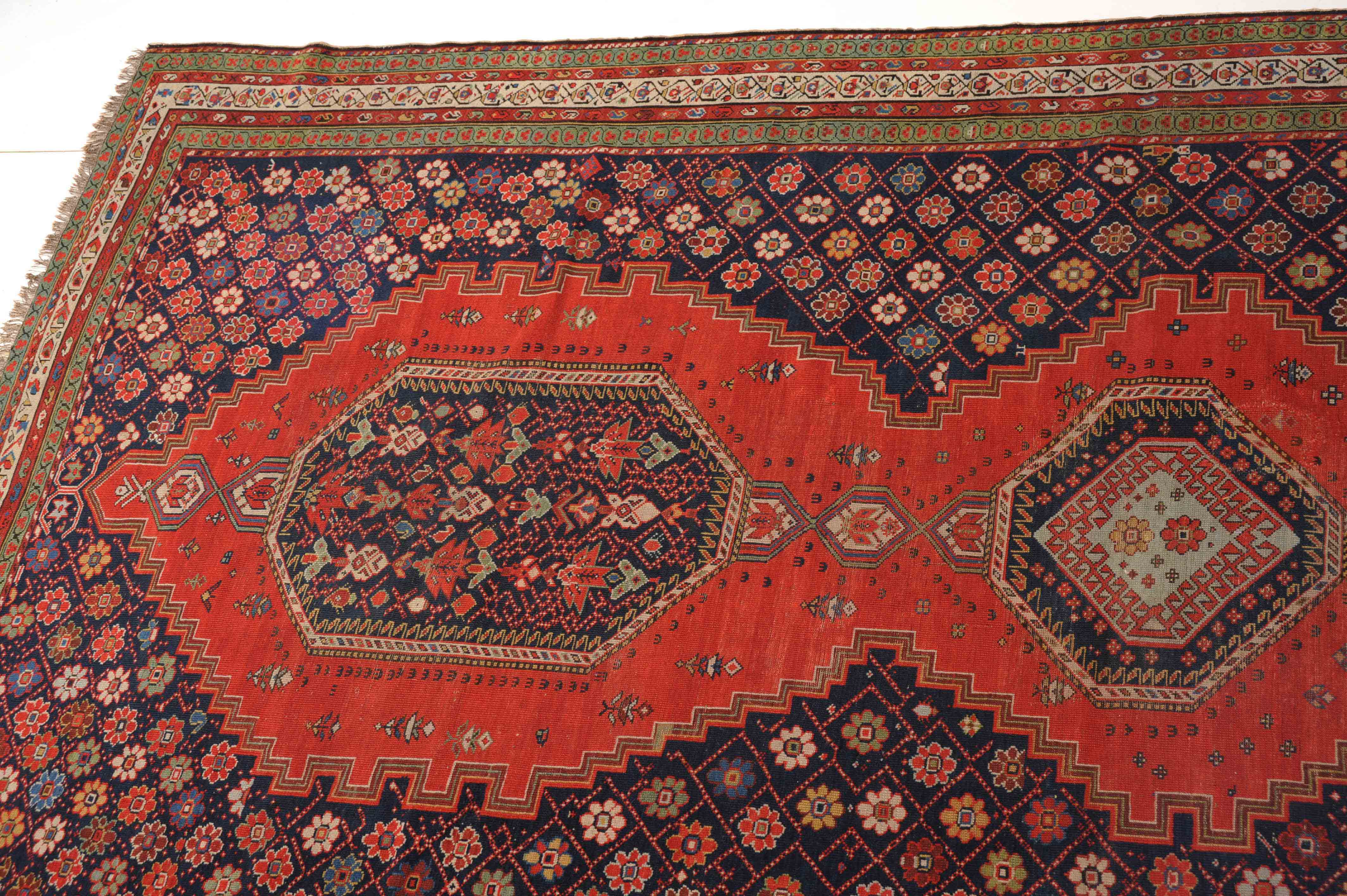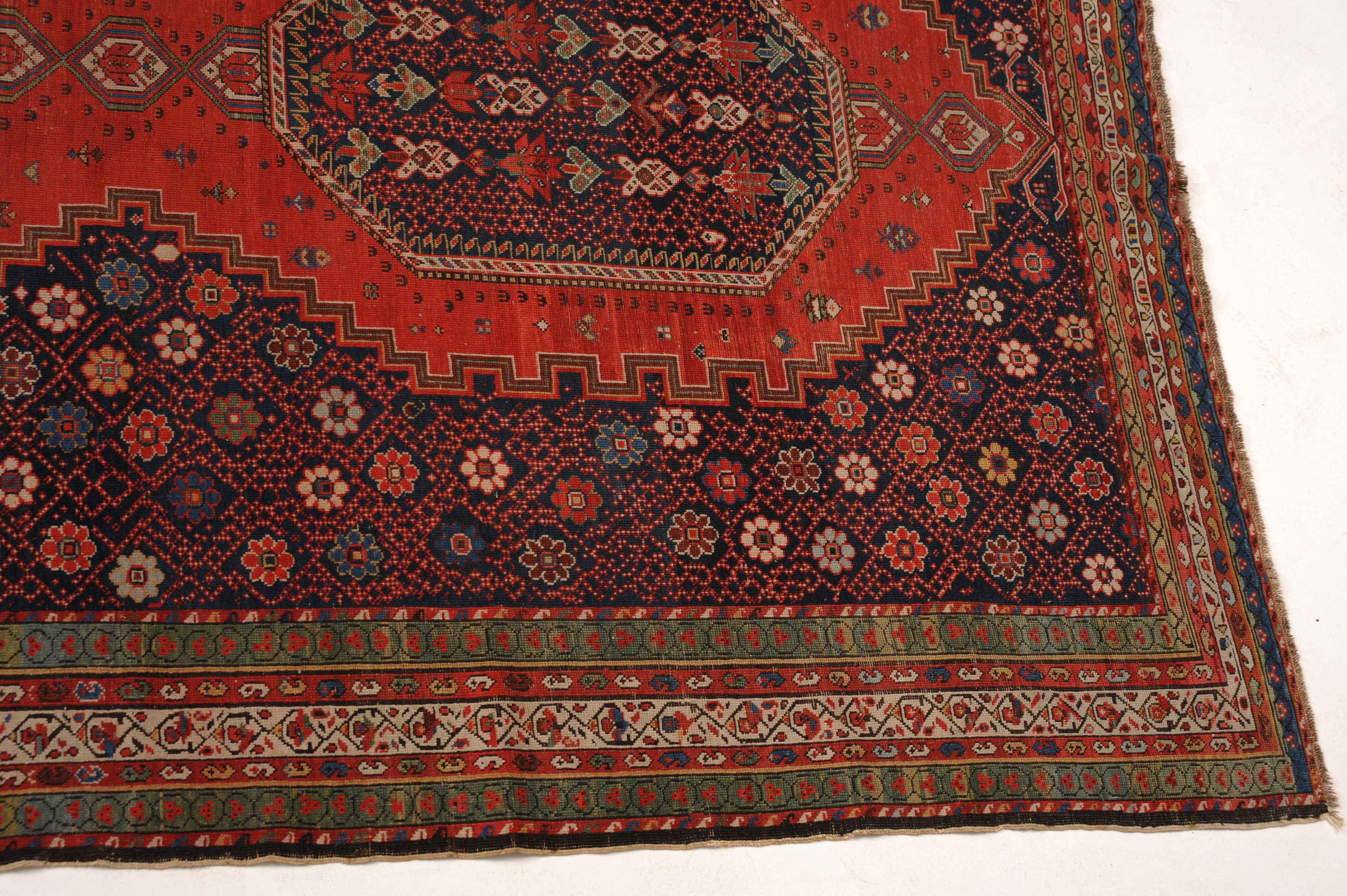Z-Kaukasus, um 1910. Im roten Mittelfeld thronen 3 mit Blüten und Haken belegte Oktogone mit miteinander verbundenen Ausläufern, flankiert von dekorativen nachtblauen mit Rauten überzogenen Blüten-Eckzwickeln. Grüne Blüten- und rote Boteh-Göls-Borten umranden die weisse Wellenranken-Bordüre. Reparierte Stelle, ansonsten gute Erhaltung. 185x365 cm (ft. 6.1x12).