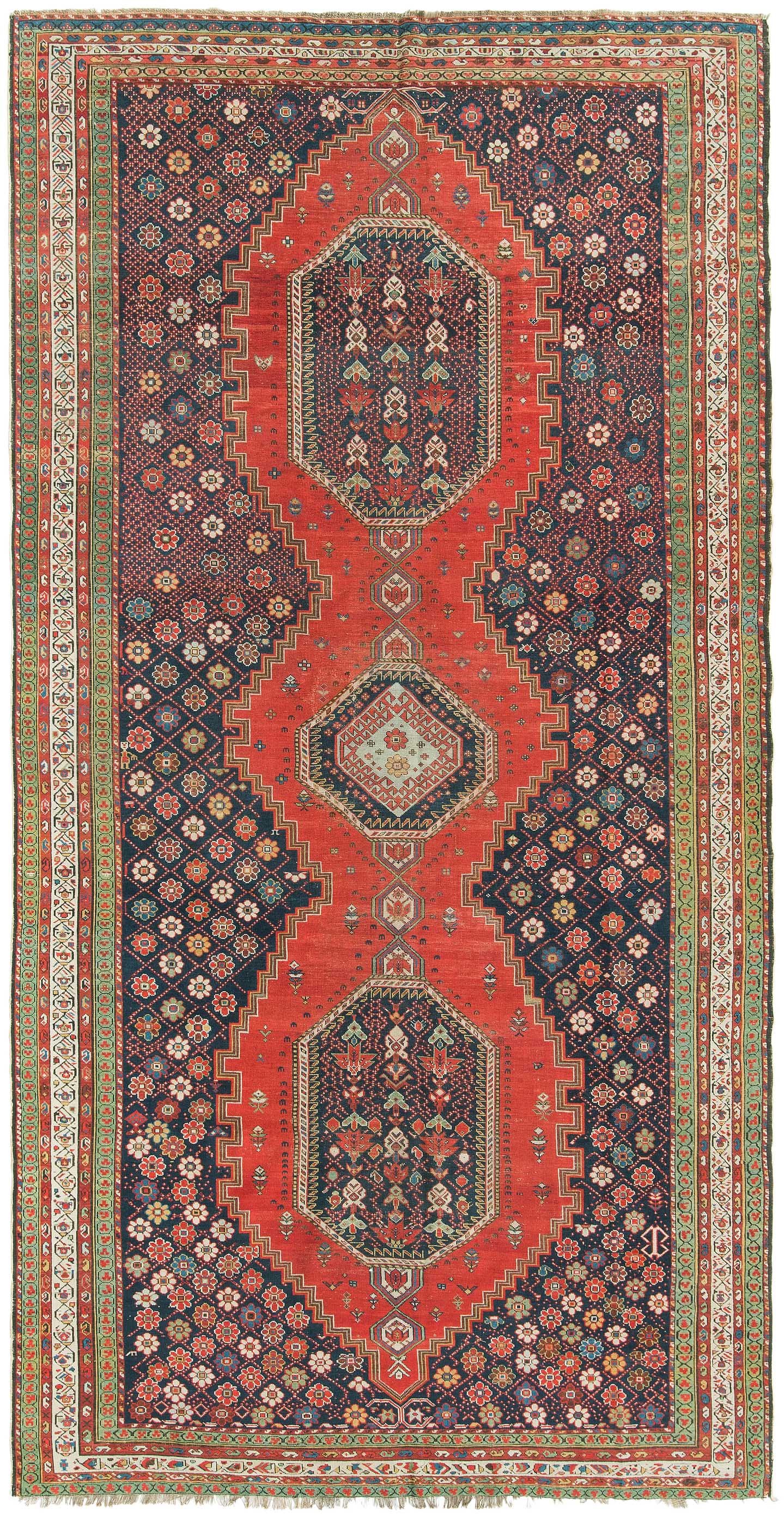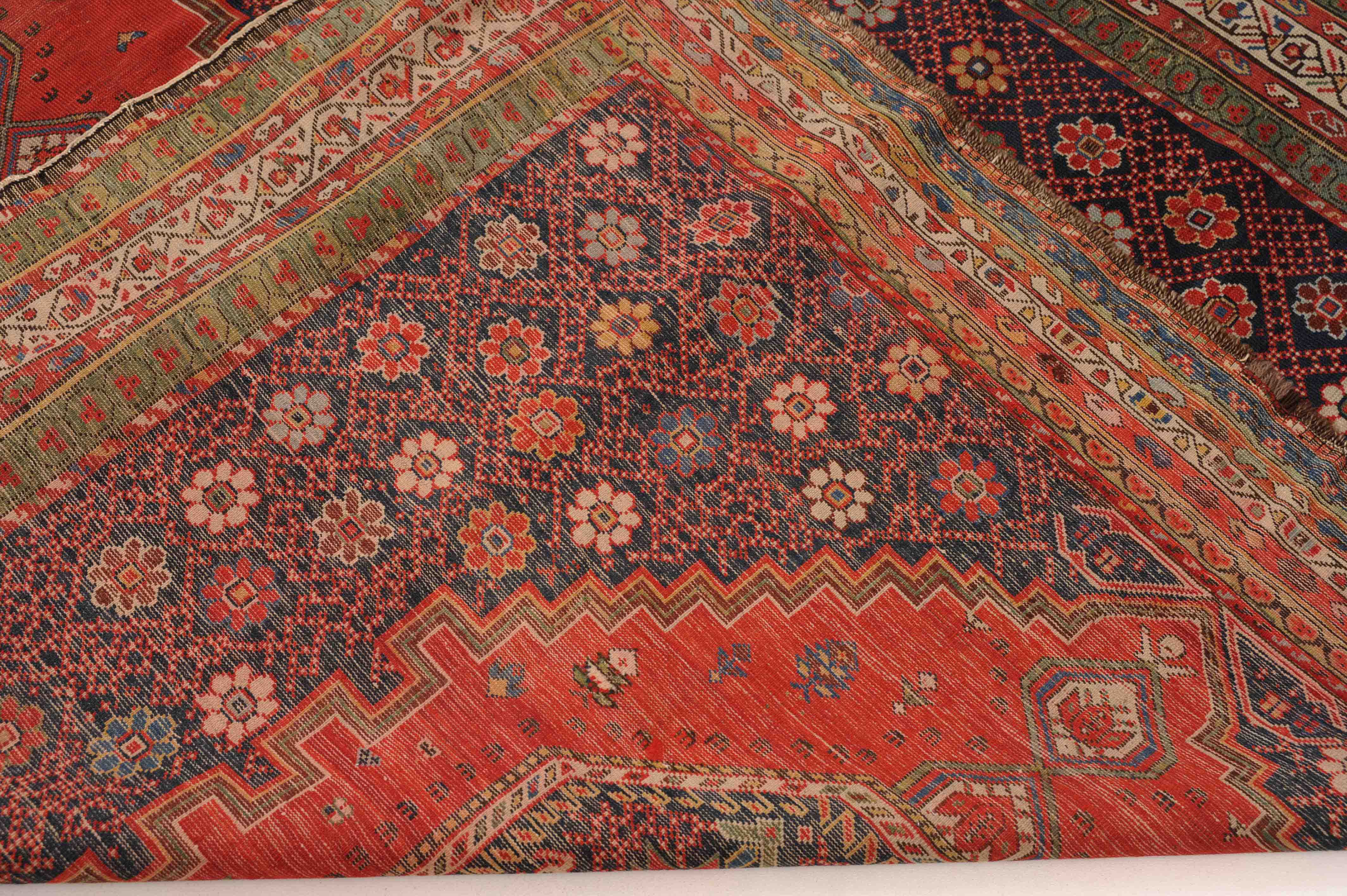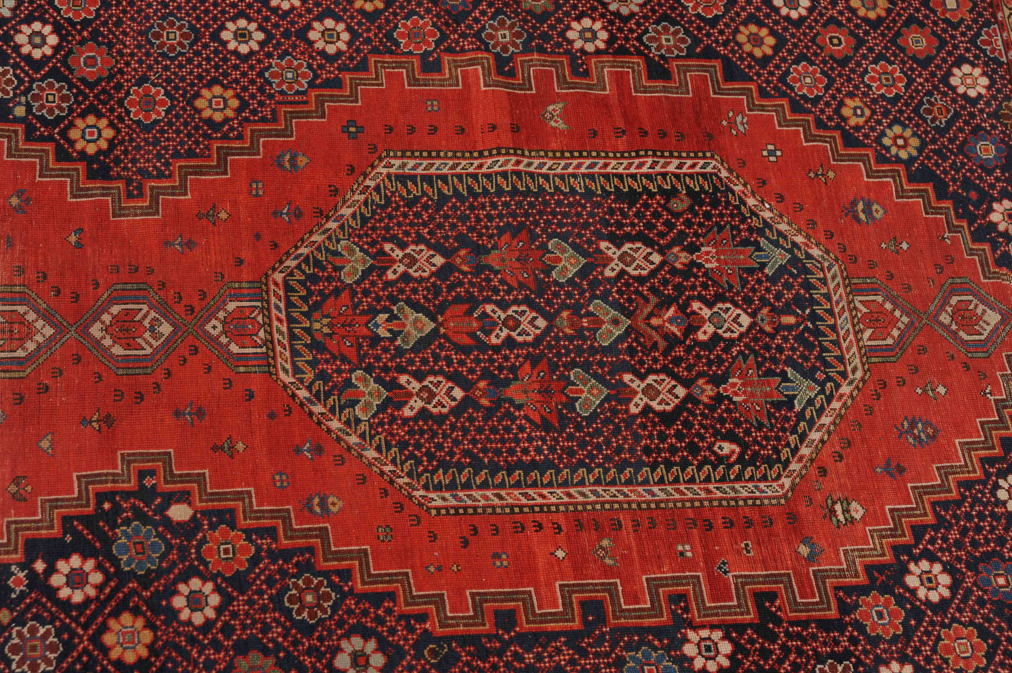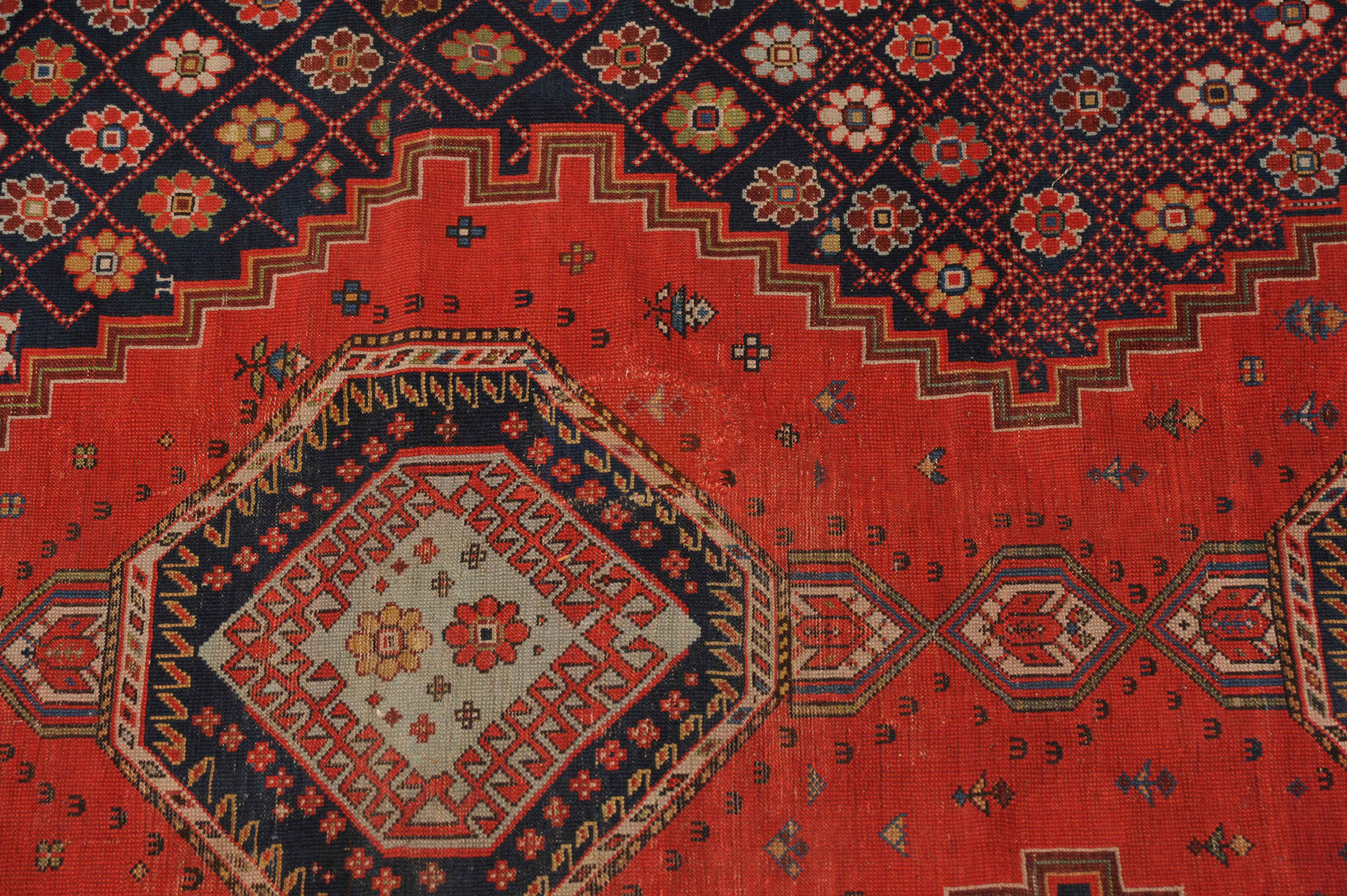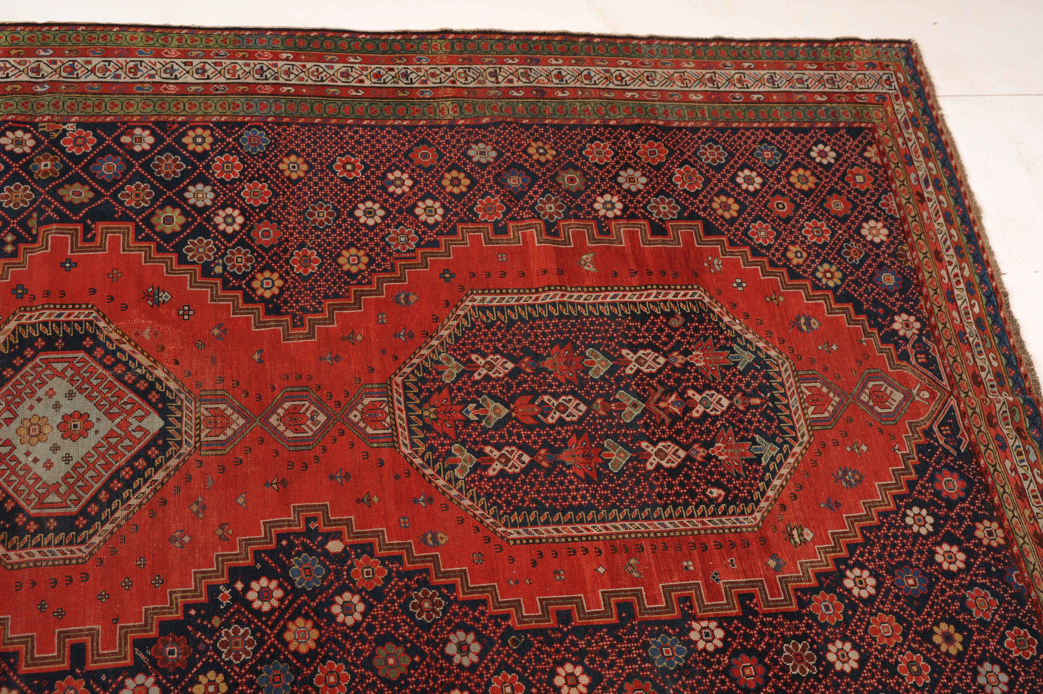 Z-Kaukasus, um 1910. Im roten Mittelfeld thronen 3 mit Blüten und Haken belegte Oktogone mit miteinander verbundenen Ausläufern, flankiert von dekorativen nachtblauen mit Rauten überzogenen Blüten-Eckzwickeln. Grüne Blüten- und rote Boteh-Göls-Borten umranden die weisse Wellenranken-Bordüre. Reparierte Stelle, ansonsten gute Erhaltung. 185x365 cm (ft. 6.1x12).