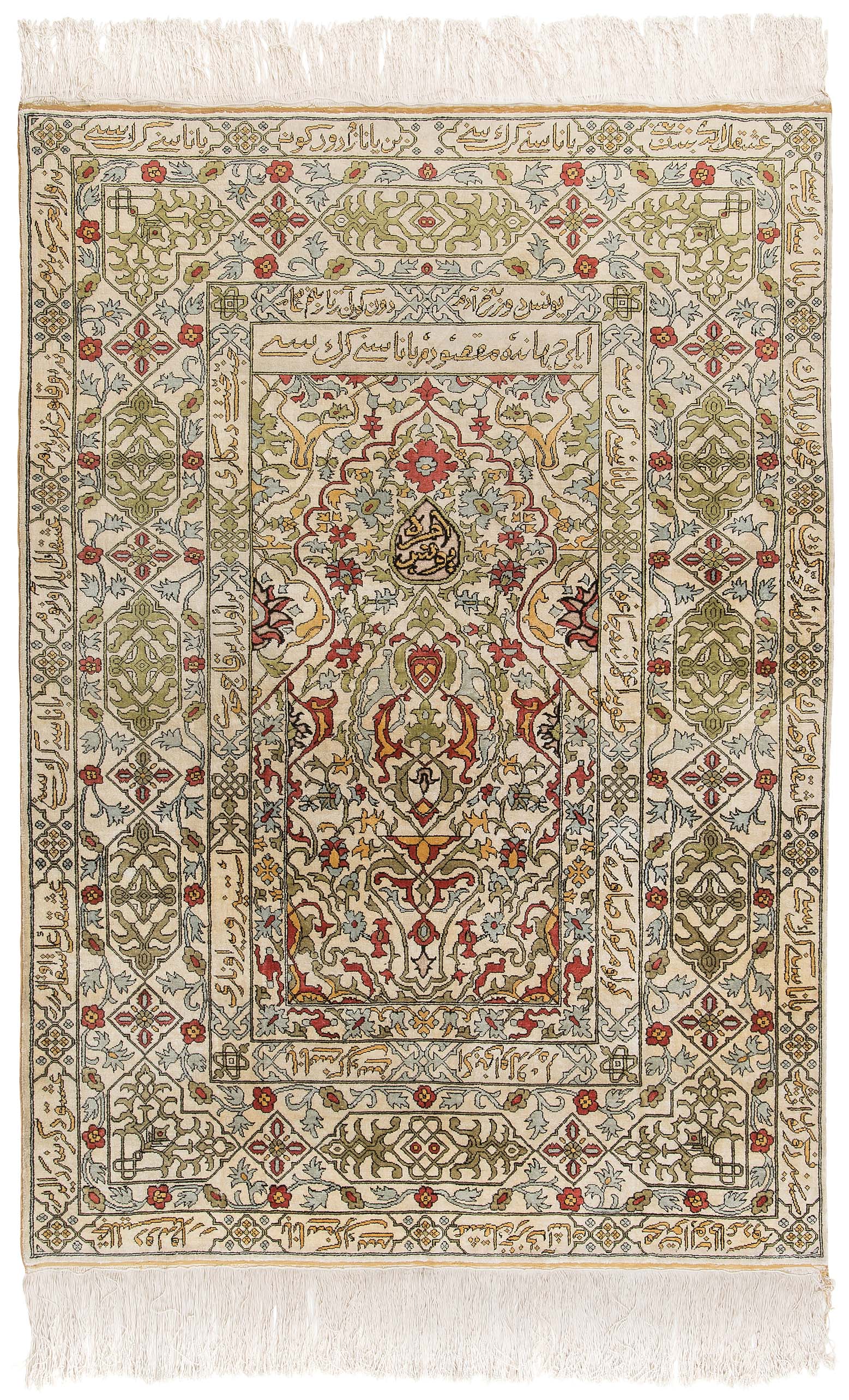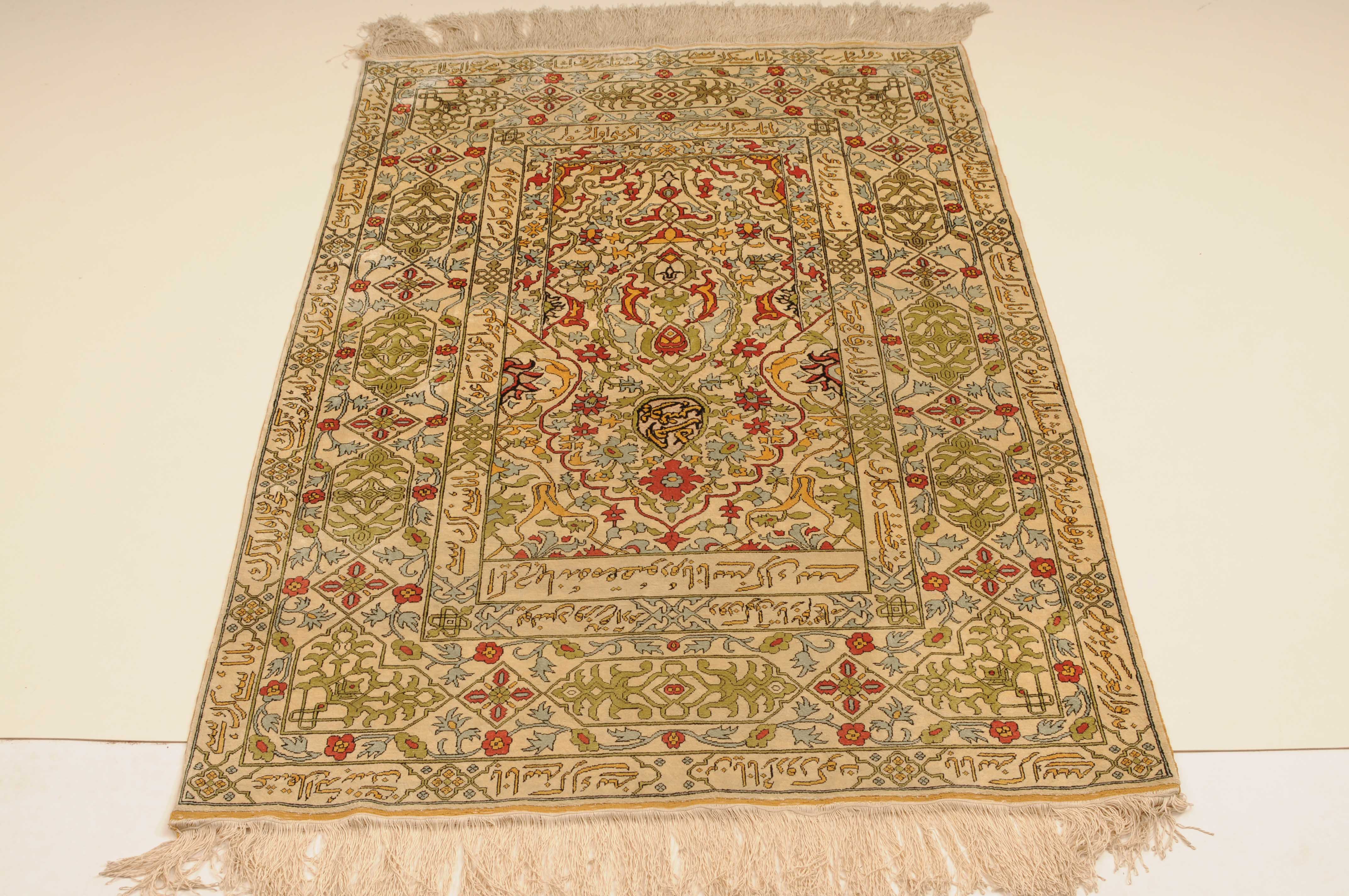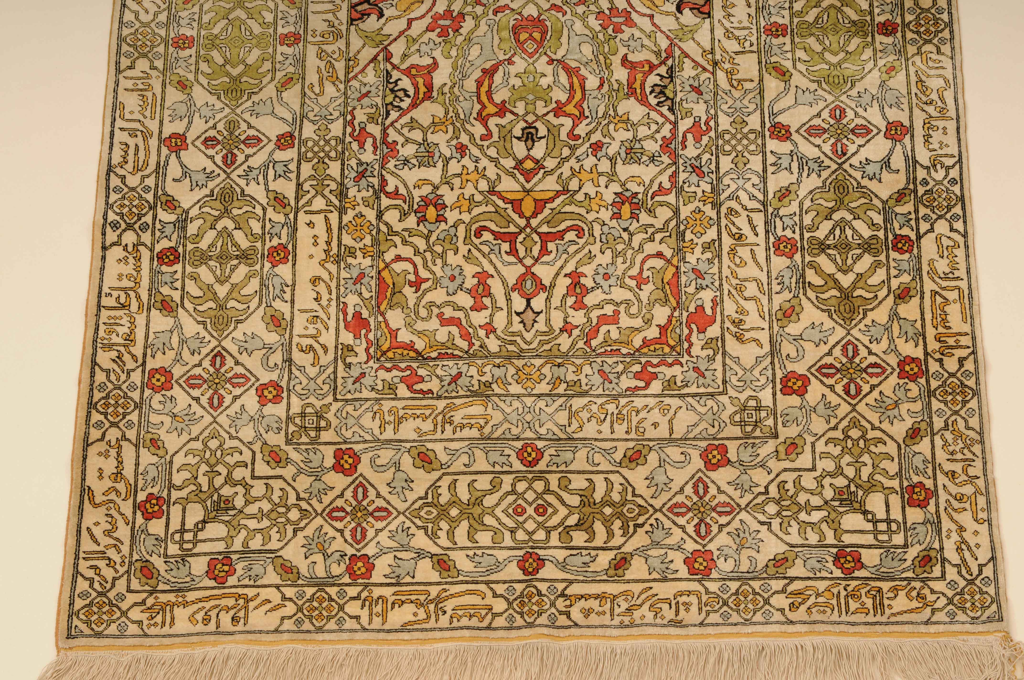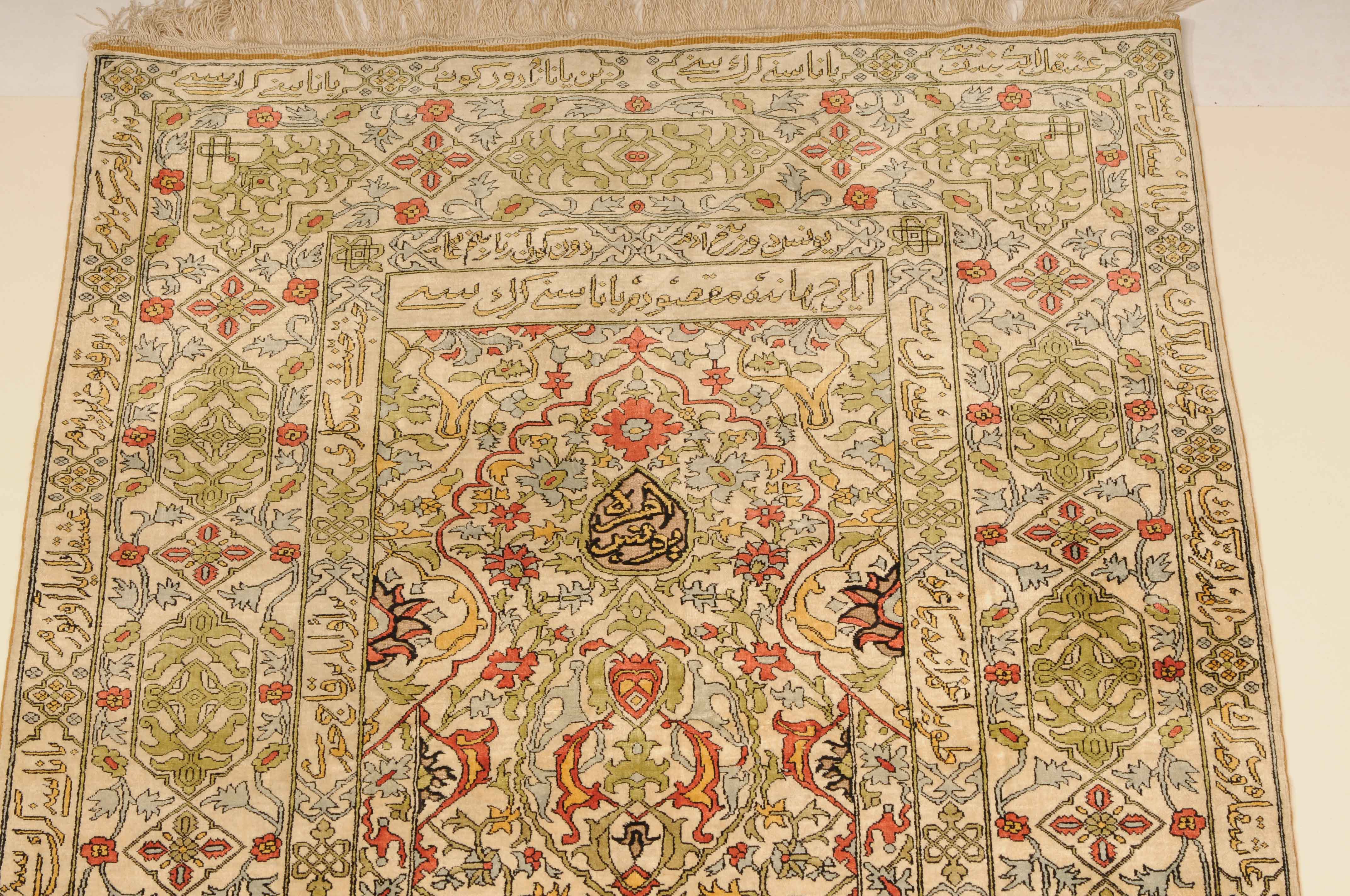 Z-Türkei, um 1960. Reine Seide mit Metallbroschierung. Dichtes florales Werk. Unter einer Gebetsnische (Mihrab) figurieren dicht gezeichnete Blattranken und Blüten. Die weissen Nebenbordüren sind mit arabischer Schrift belegt und umranden die breite, mit Kartuschen und Blütenranken geschmückte Bordüre. Sehr gute Erhaltung. 98x143 cm (ft. 3.2x4.7).