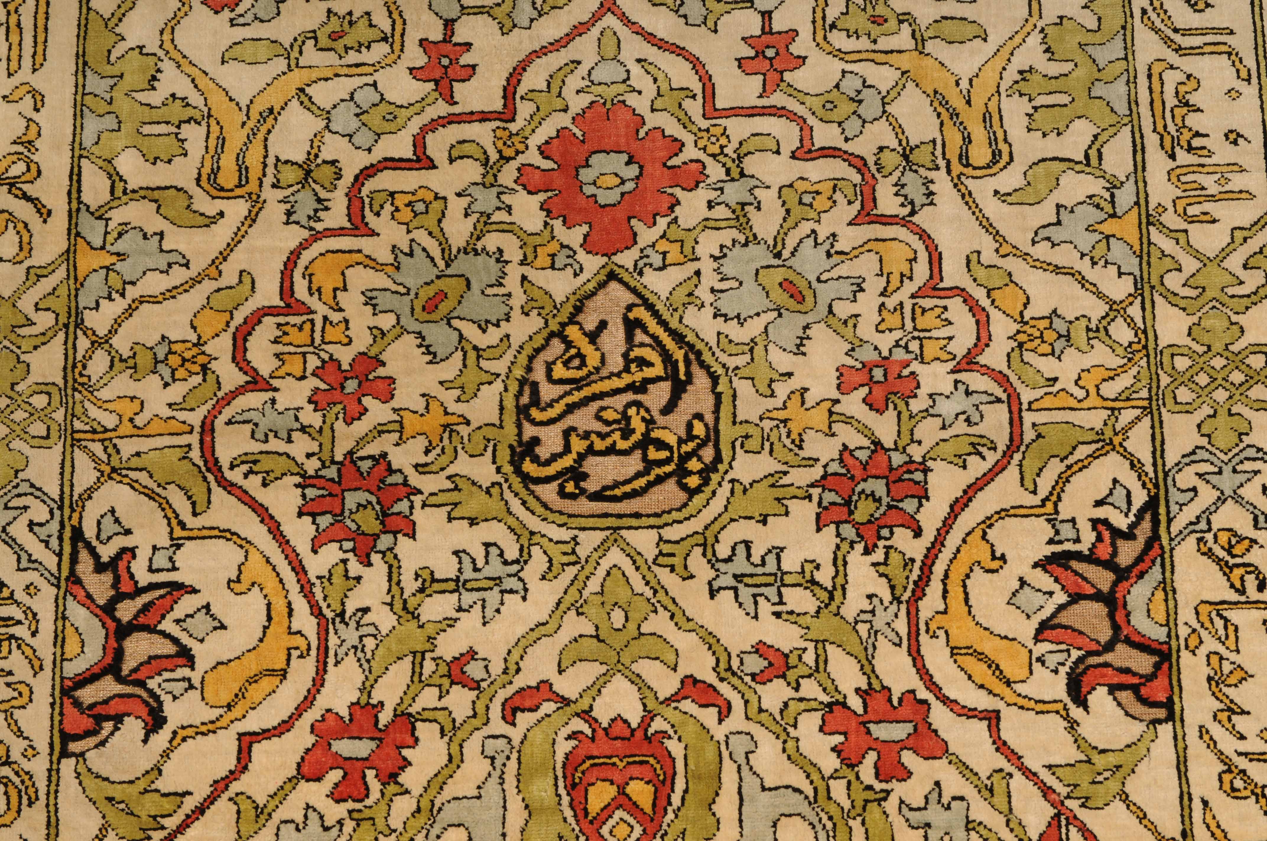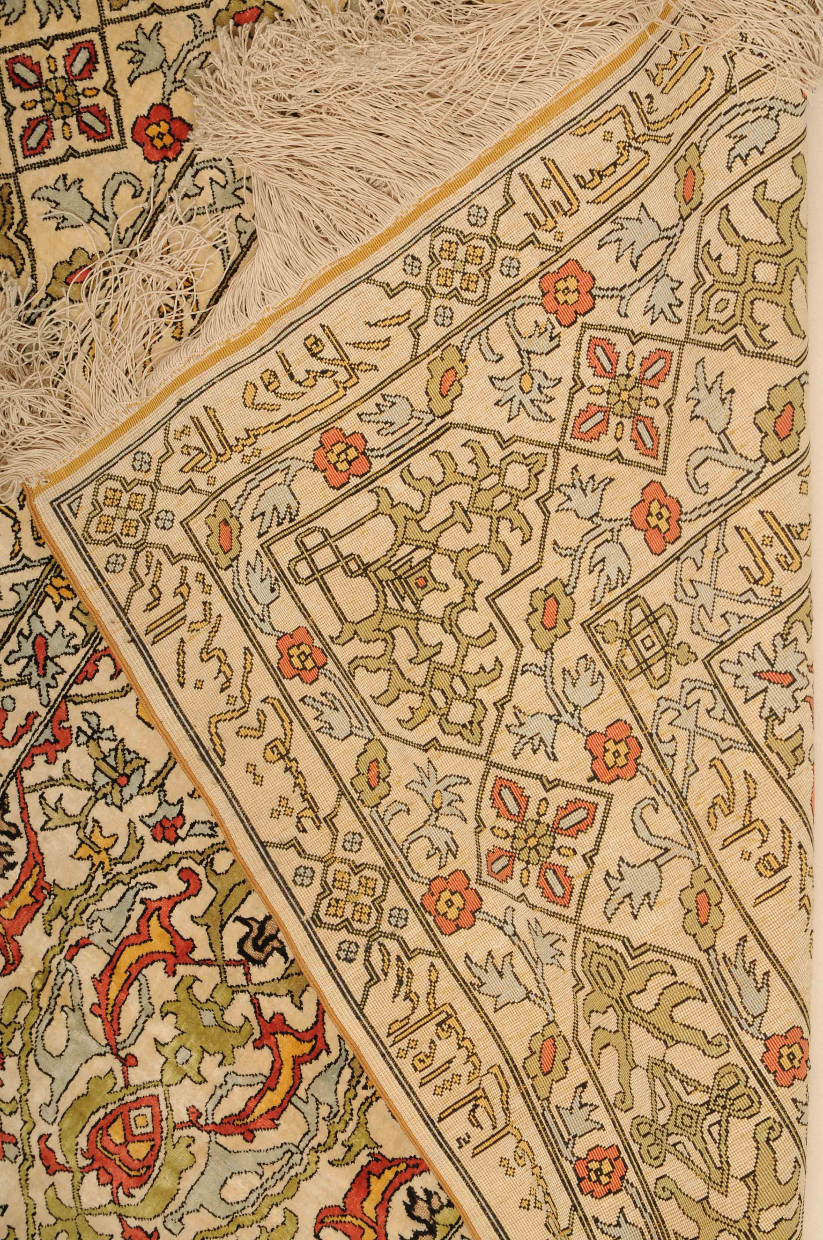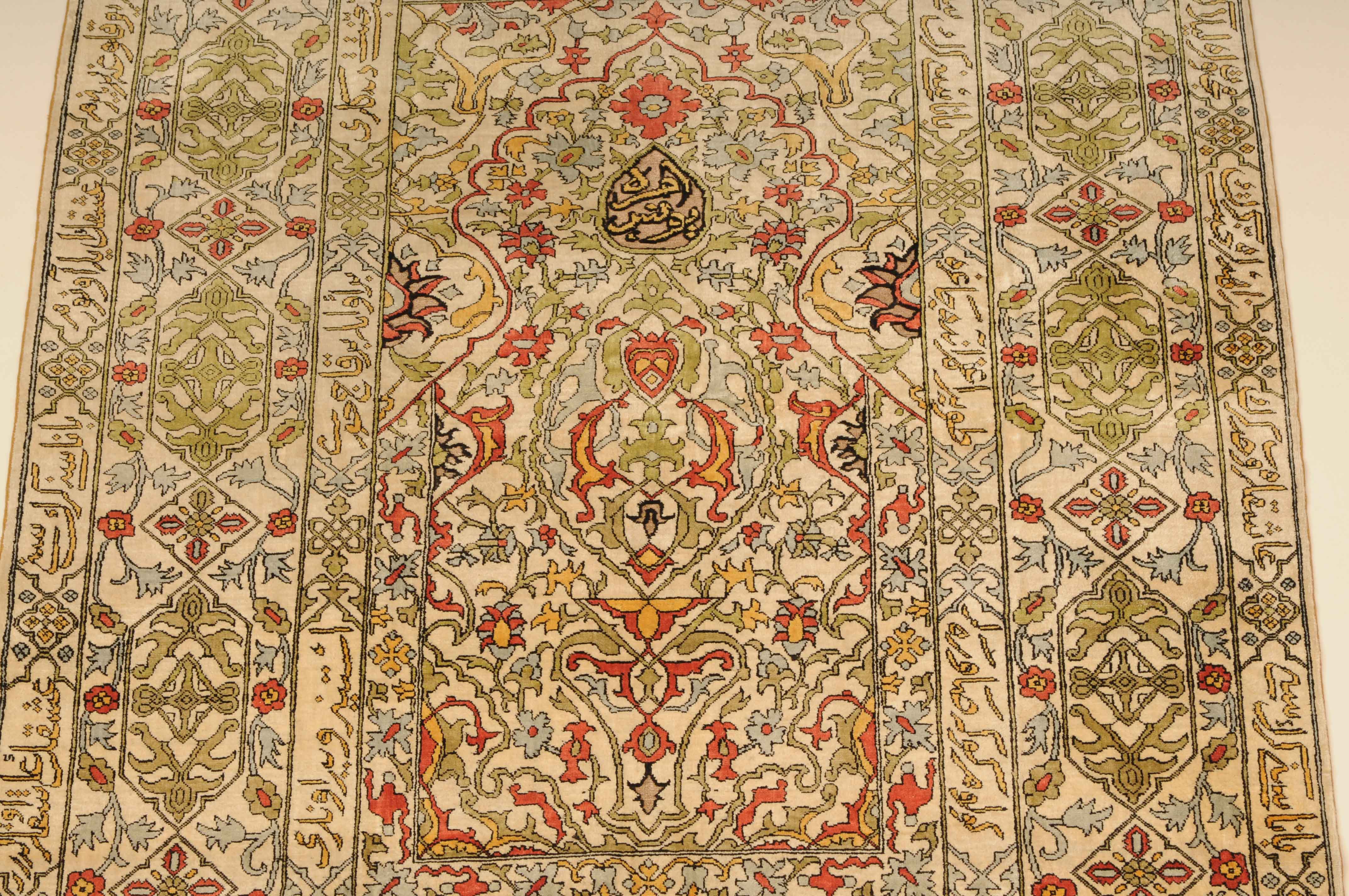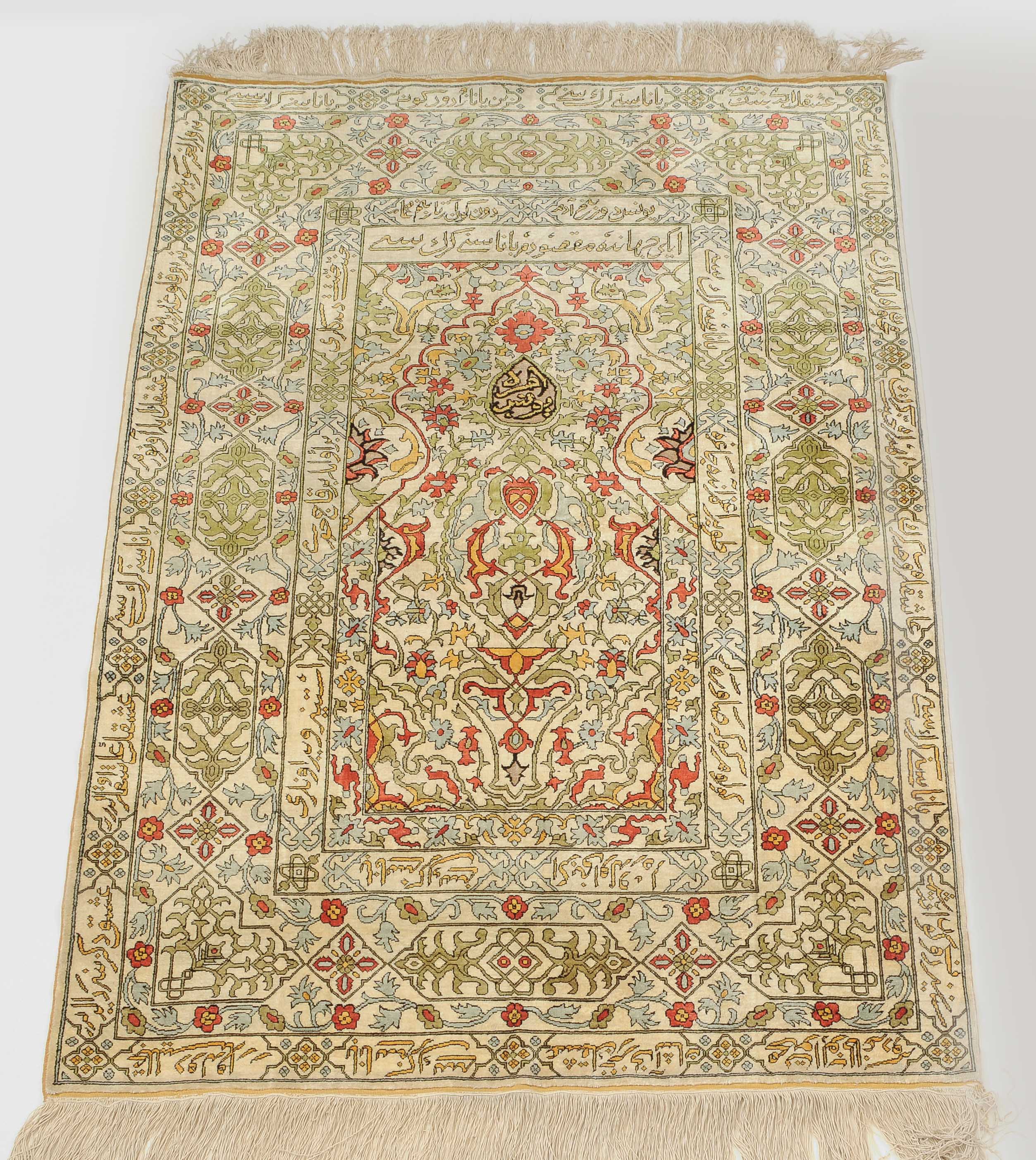 Z-Türkei, um 1960. Reine Seide mit Metallbroschierung. Dichtes florales Werk. Unter einer Gebetsnische (Mihrab) figurieren dicht gezeichnete Blattranken und Blüten. Die weissen Nebenbordüren sind mit arabischer Schrift belegt und umranden die breite, mit Kartuschen und Blütenranken geschmückte Bordüre. Sehr gute Erhaltung. 98x143 cm (ft. 3.2x4.7).