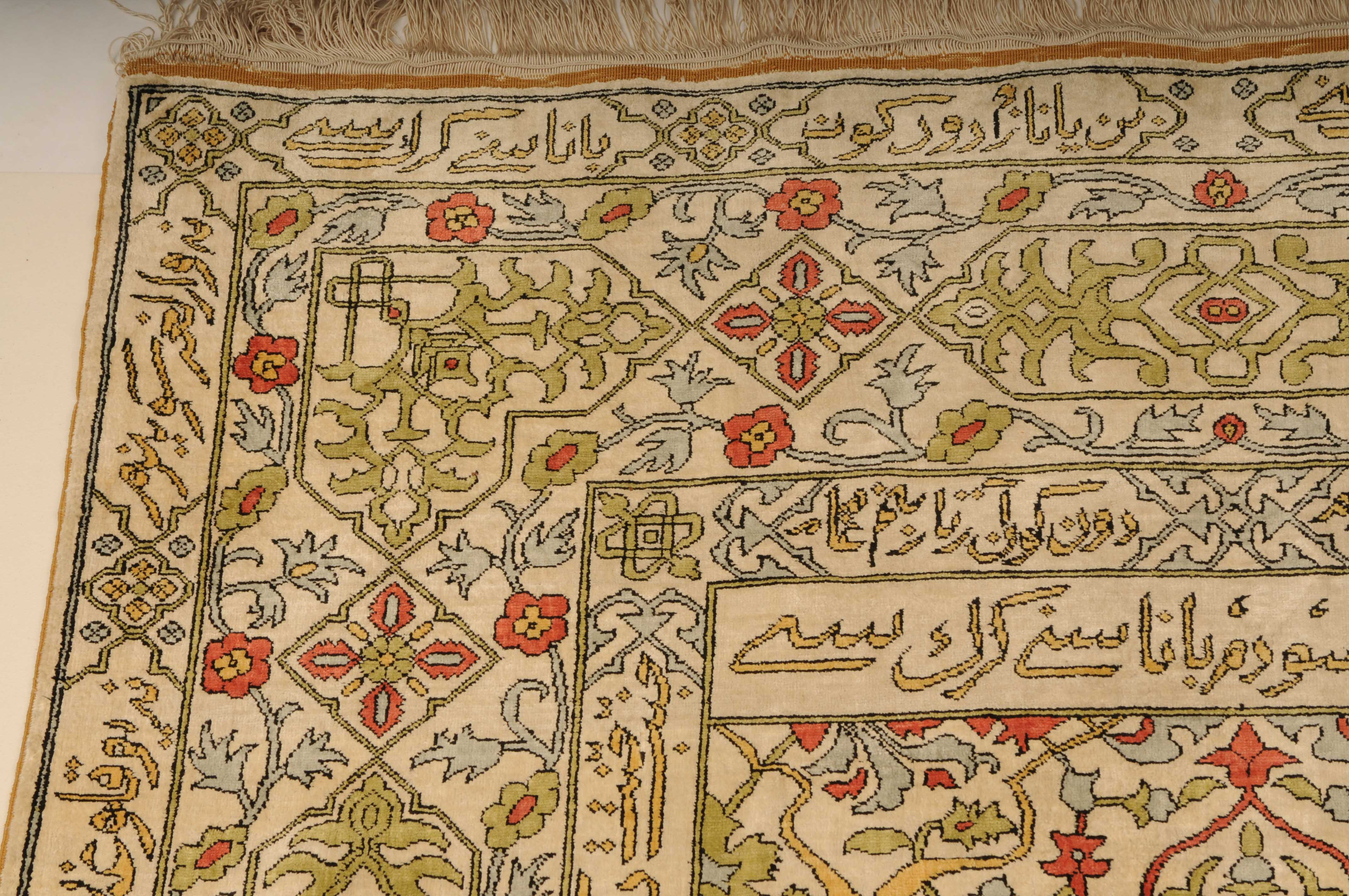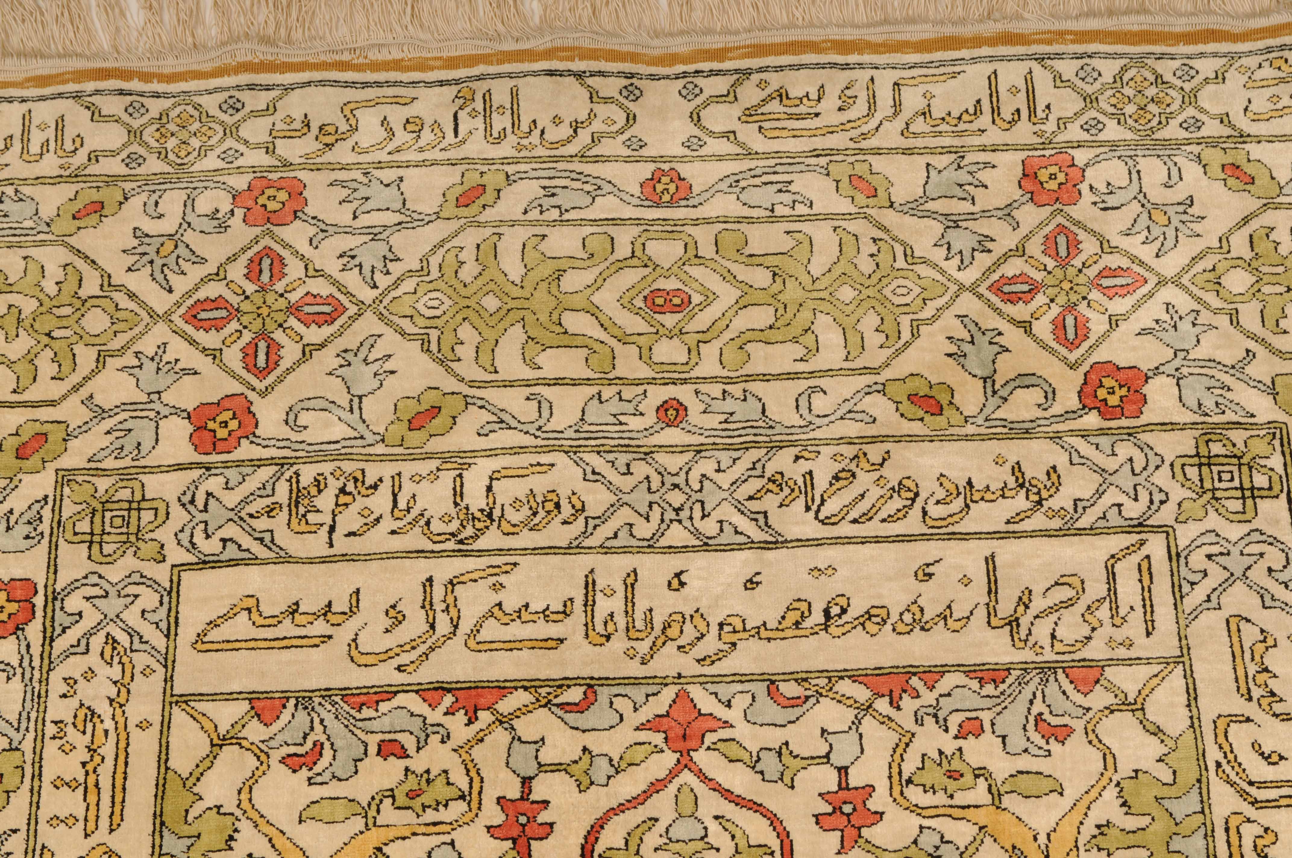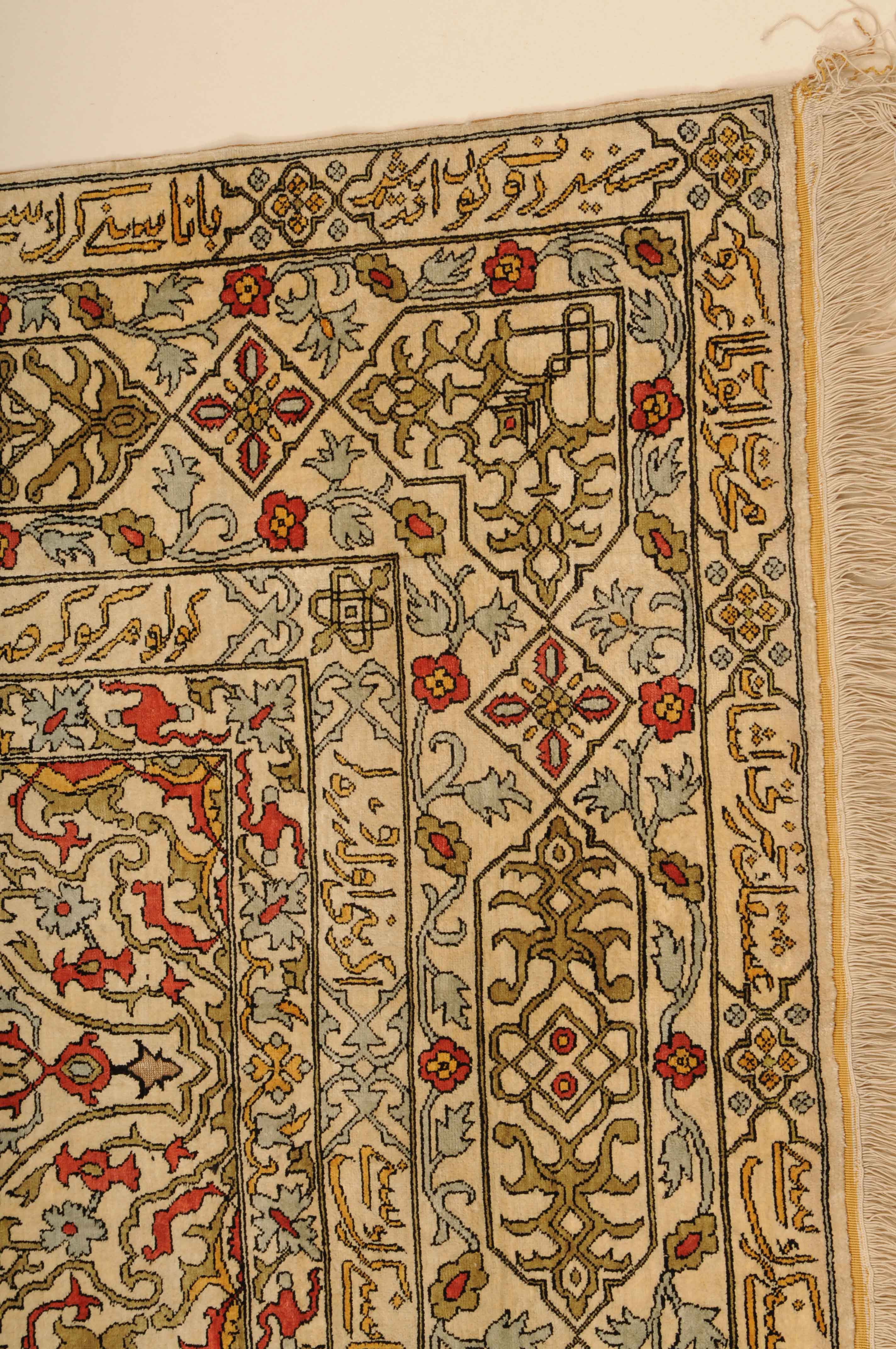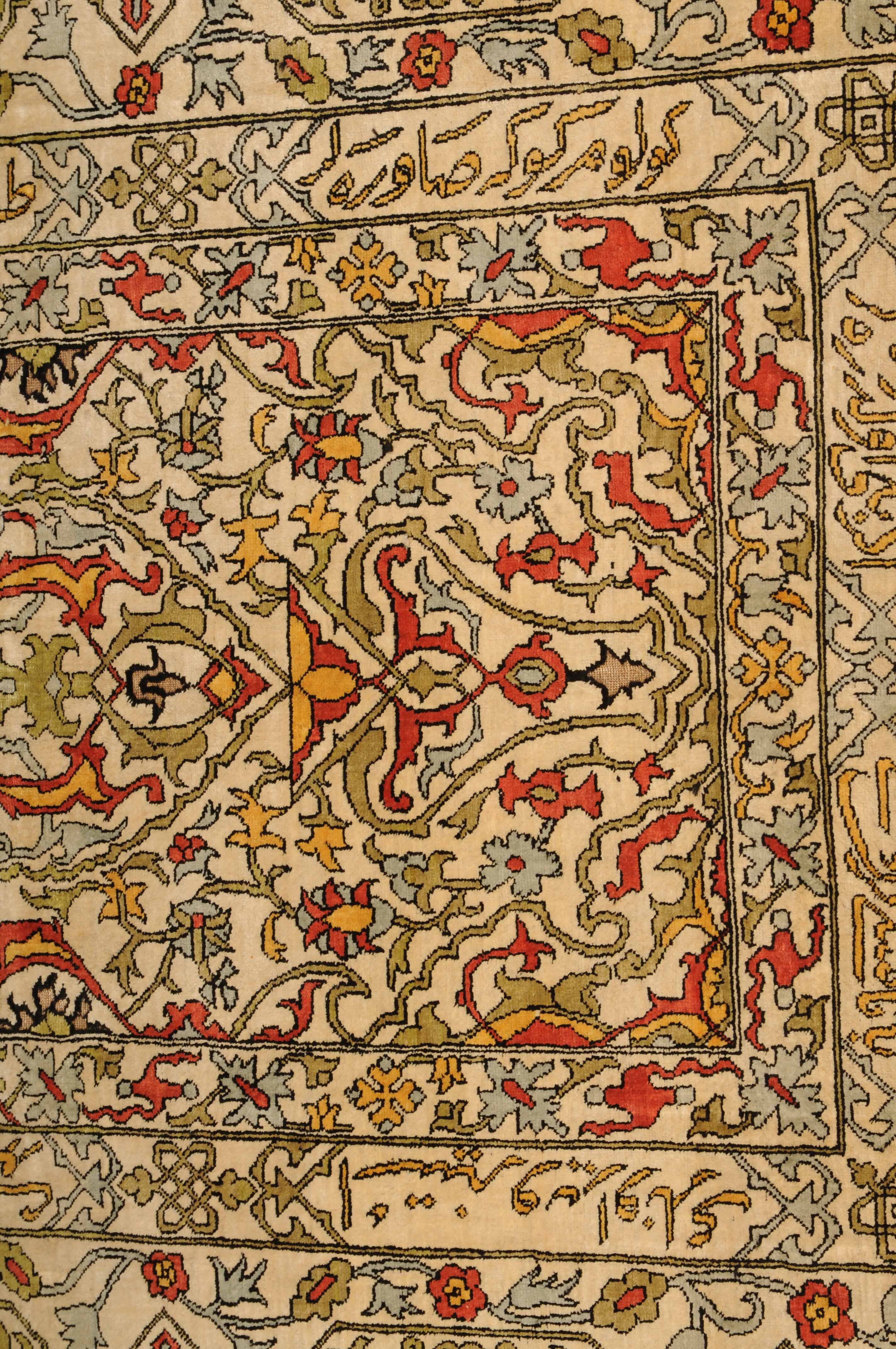 Z-Türkei, um 1960. Reine Seide mit Metallbroschierung. Dichtes florales Werk. Unter einer Gebetsnische (Mihrab) figurieren dicht gezeichnete Blattranken und Blüten. Die weissen Nebenbordüren sind mit arabischer Schrift belegt und umranden die breite, mit Kartuschen und Blütenranken geschmückte Bordüre. Sehr gute Erhaltung. 98x143 cm (ft. 3.2x4.7).