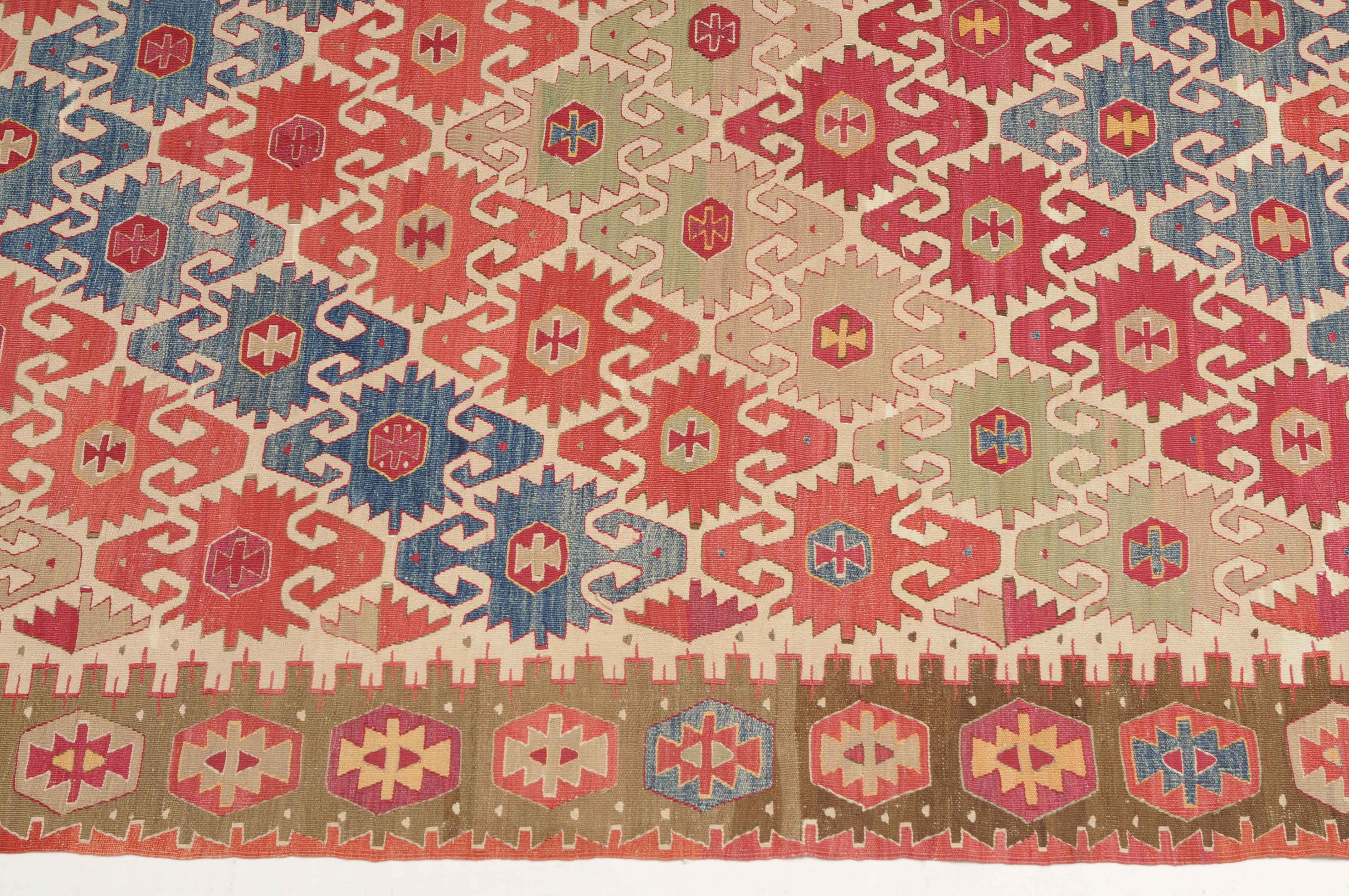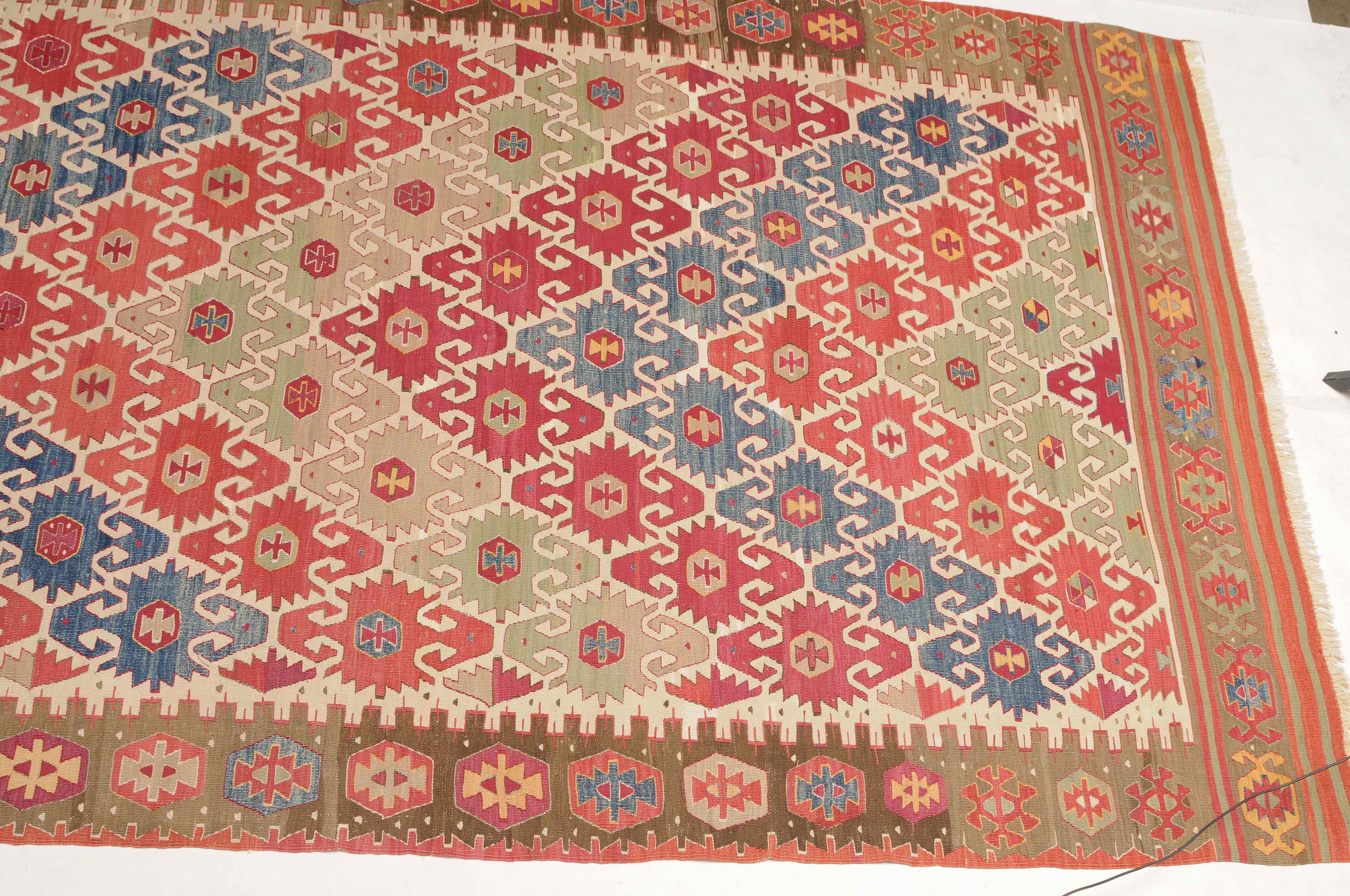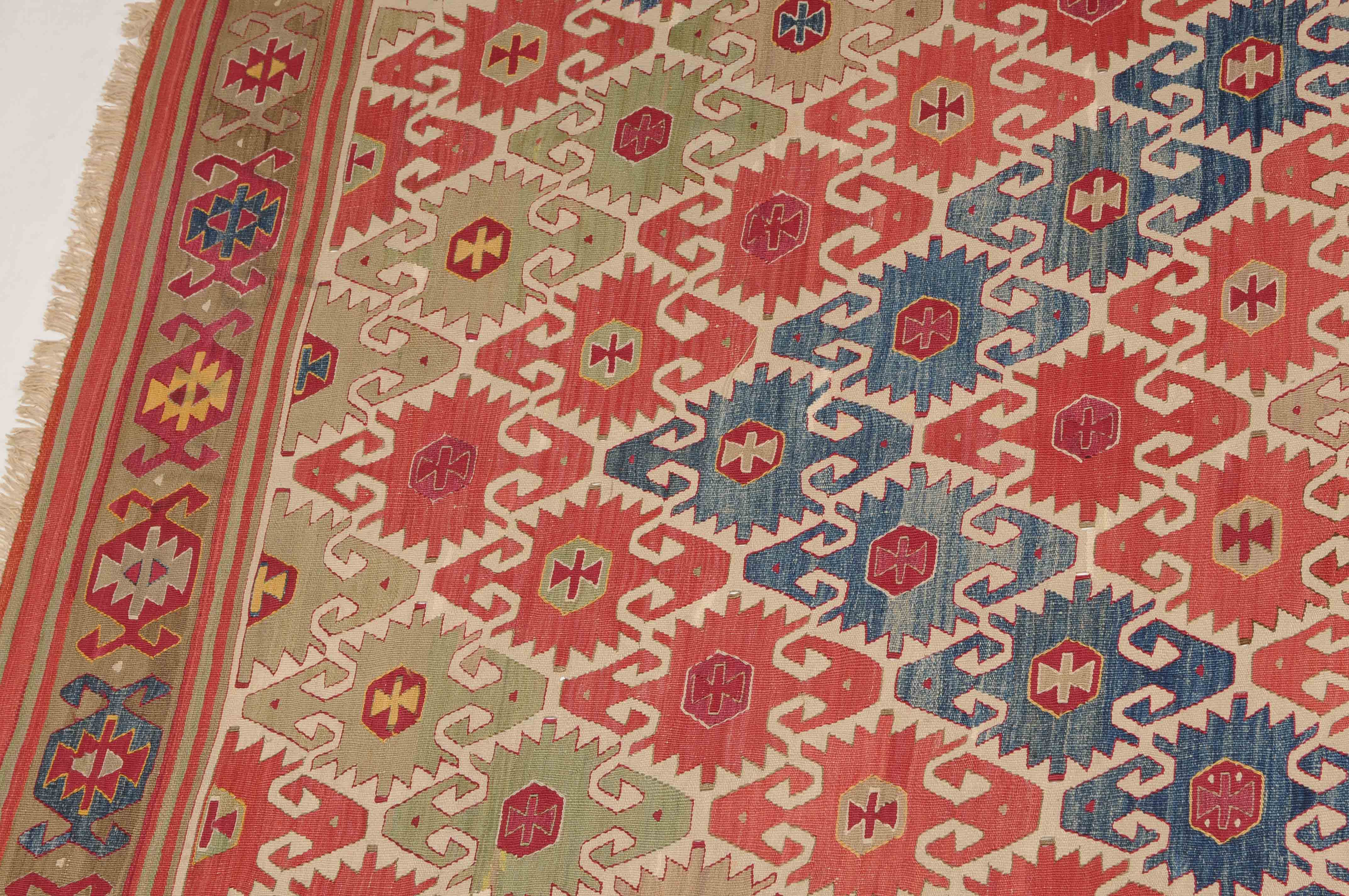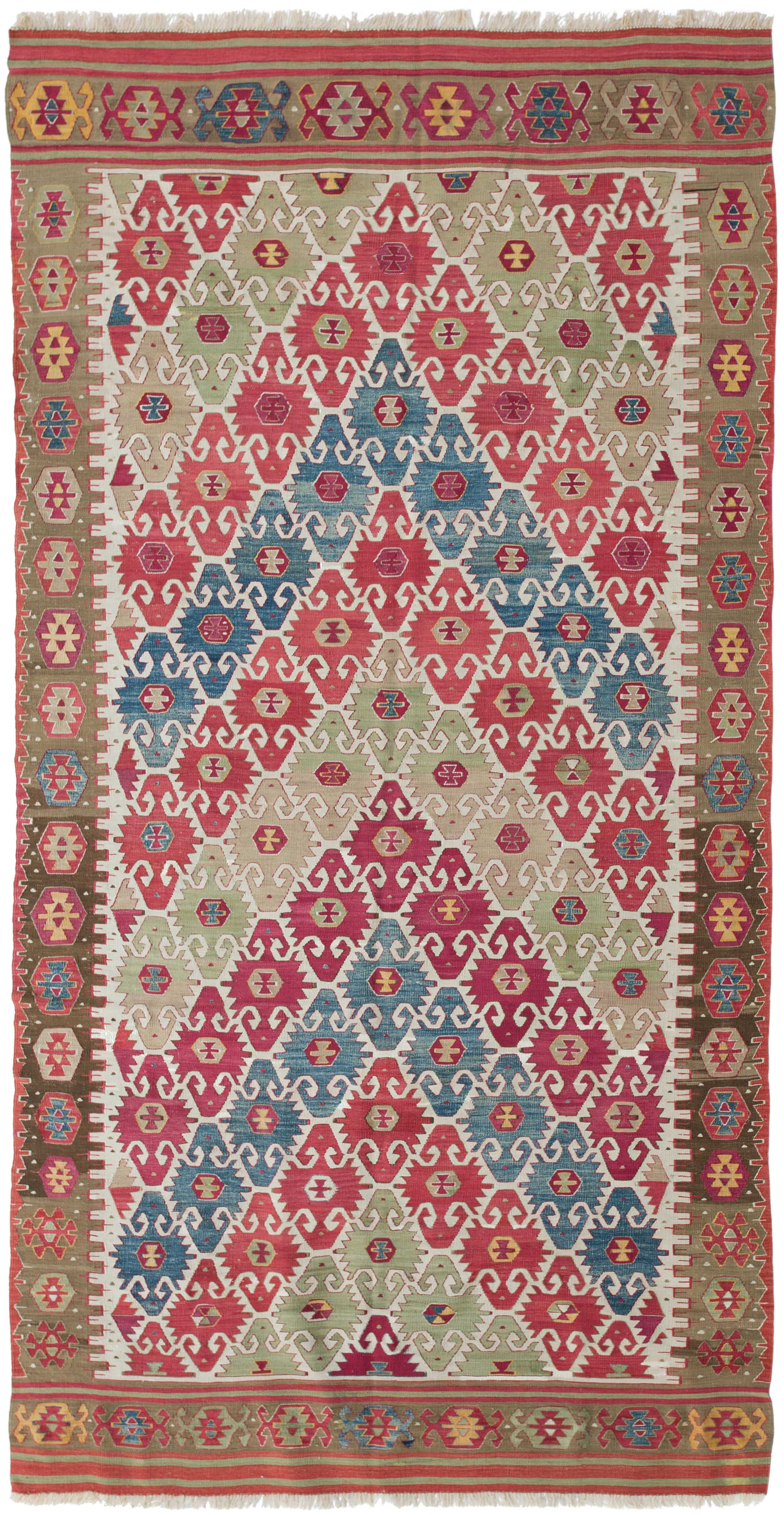 NW-Türkei, um 1910. Das weisse Mittelfeld ist mit spitzförmig angeordneten alternierenden Pfeilornamenten durchgehend verziert. Breite Hexagone belegen dekorativ die braune Hauptbordüre. Sehr gute Erhaltung. 163x285 cm (ft. 5.4x9.4).