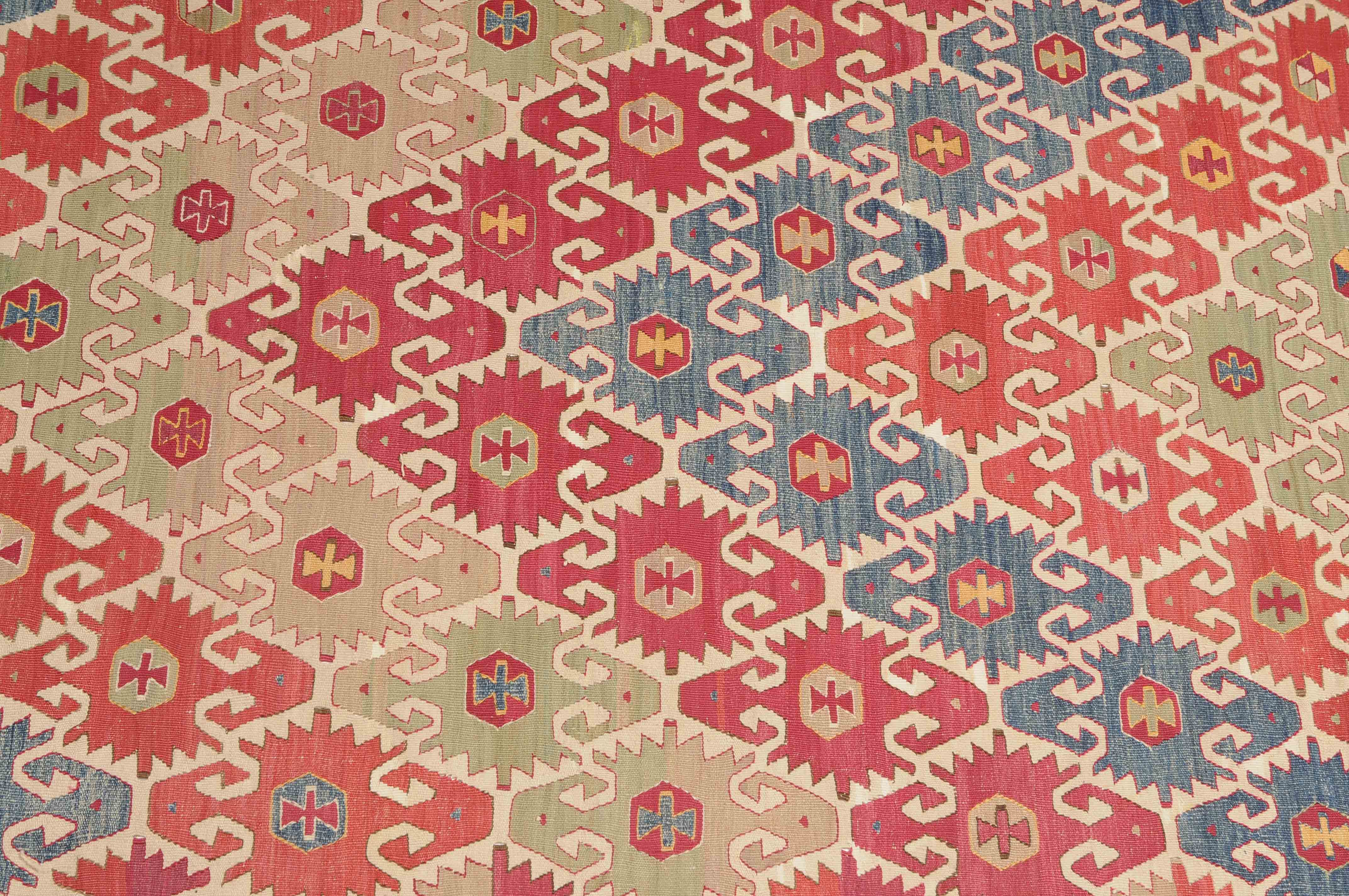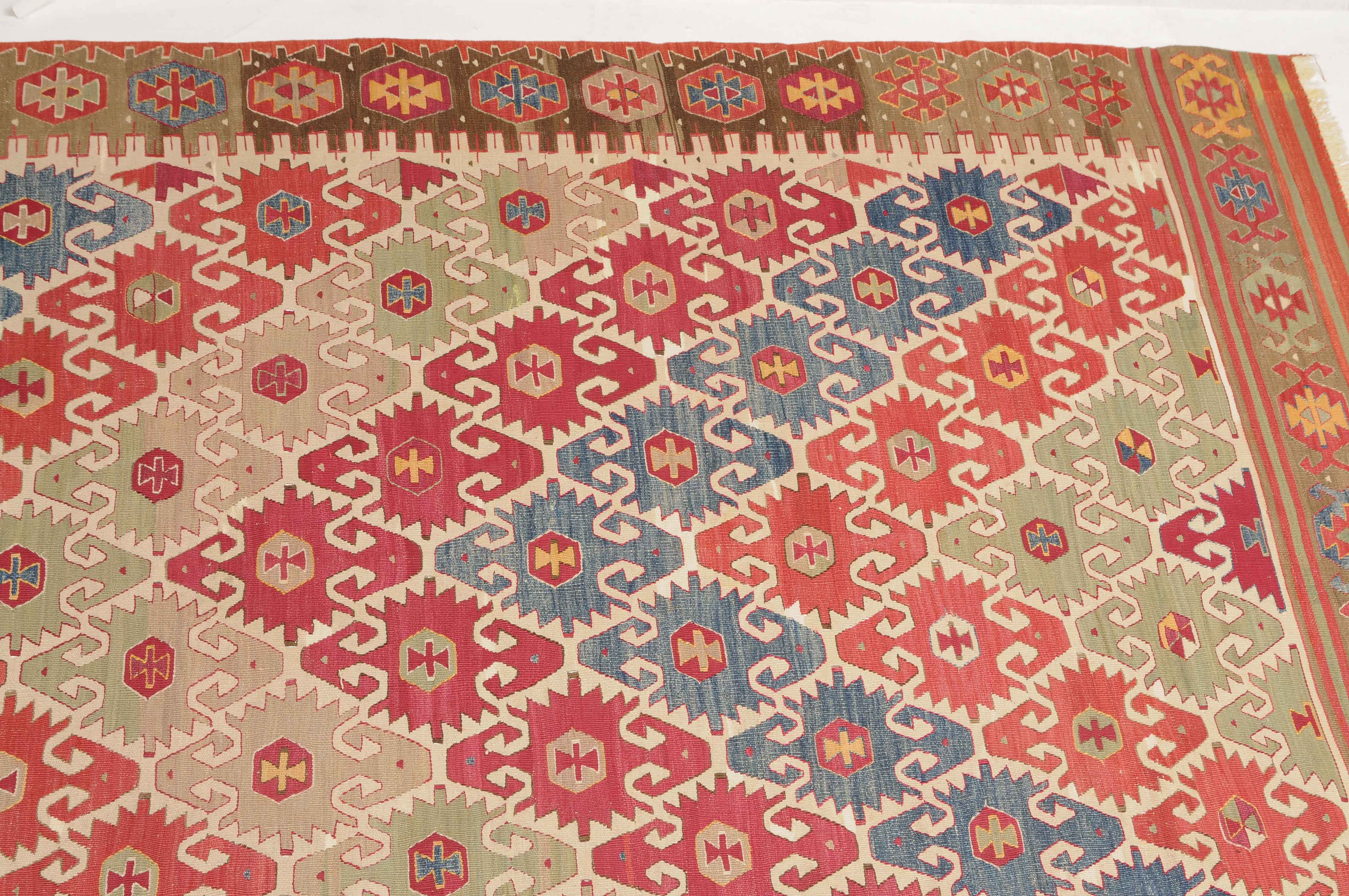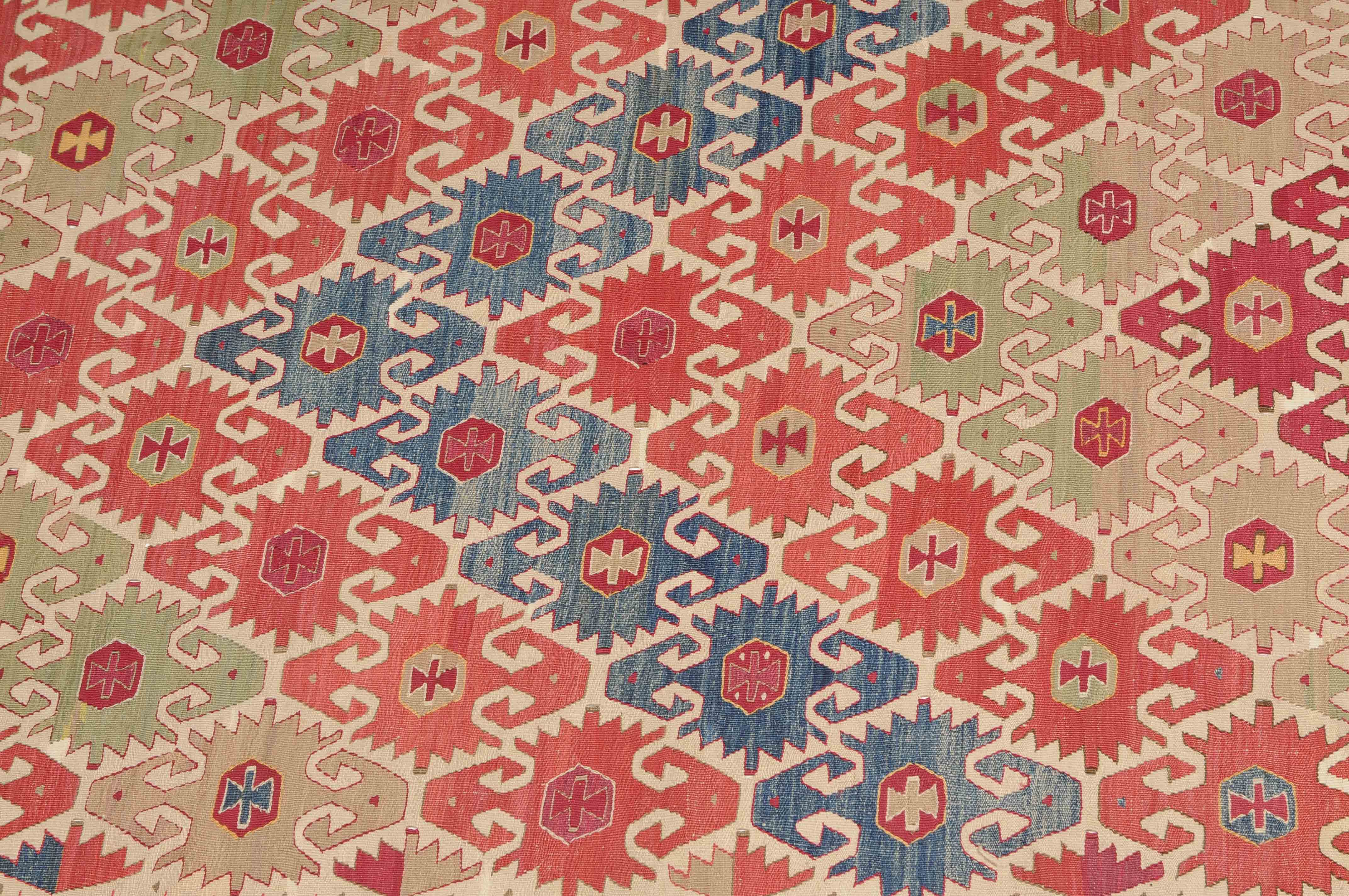 NW-Türkei, um 1910. Das weisse Mittelfeld ist mit spitzförmig angeordneten alternierenden Pfeilornamenten durchgehend verziert. Breite Hexagone belegen dekorativ die braune Hauptbordüre. Sehr gute Erhaltung. 163x285 cm (ft. 5.4x9.4).
